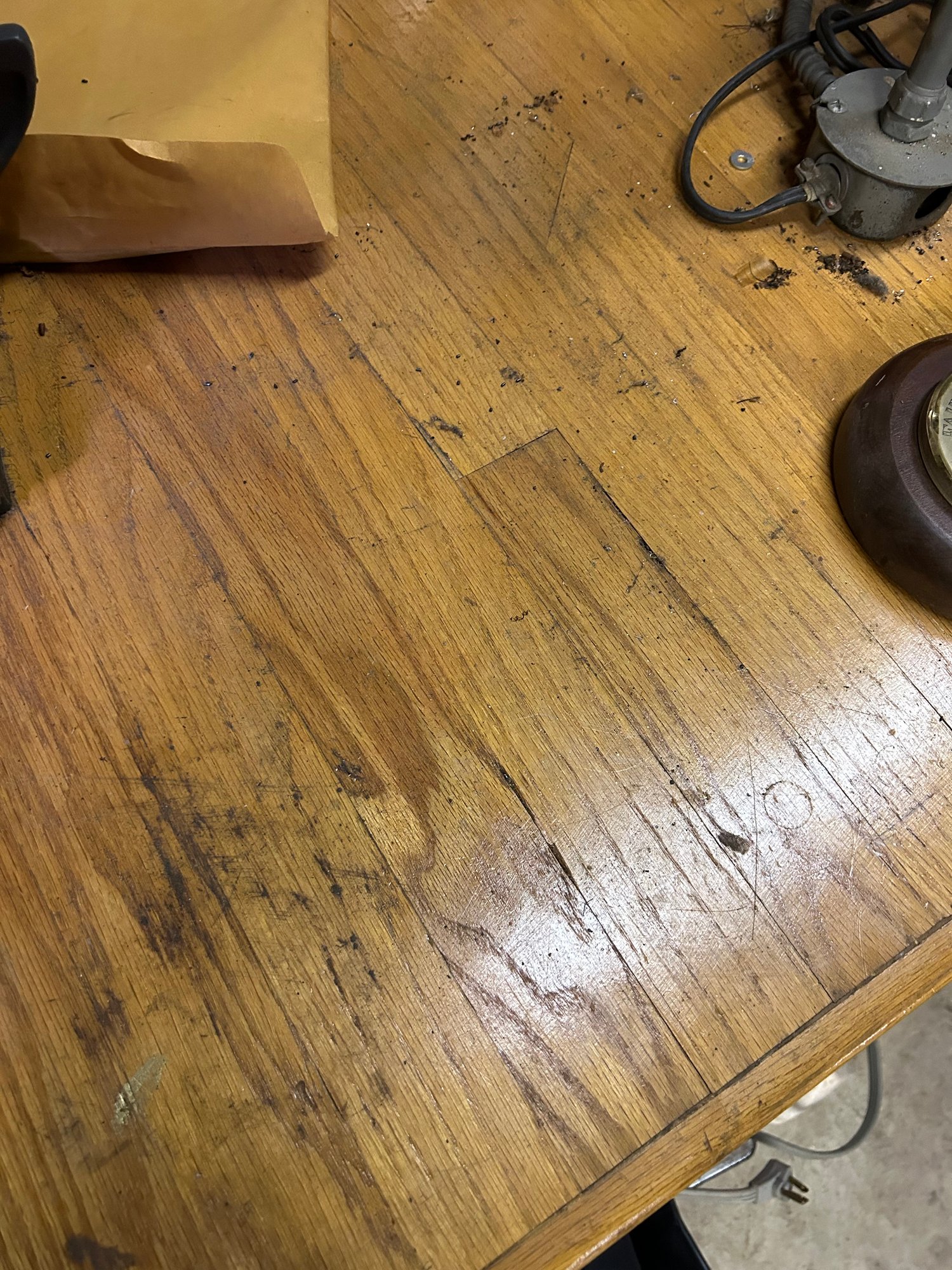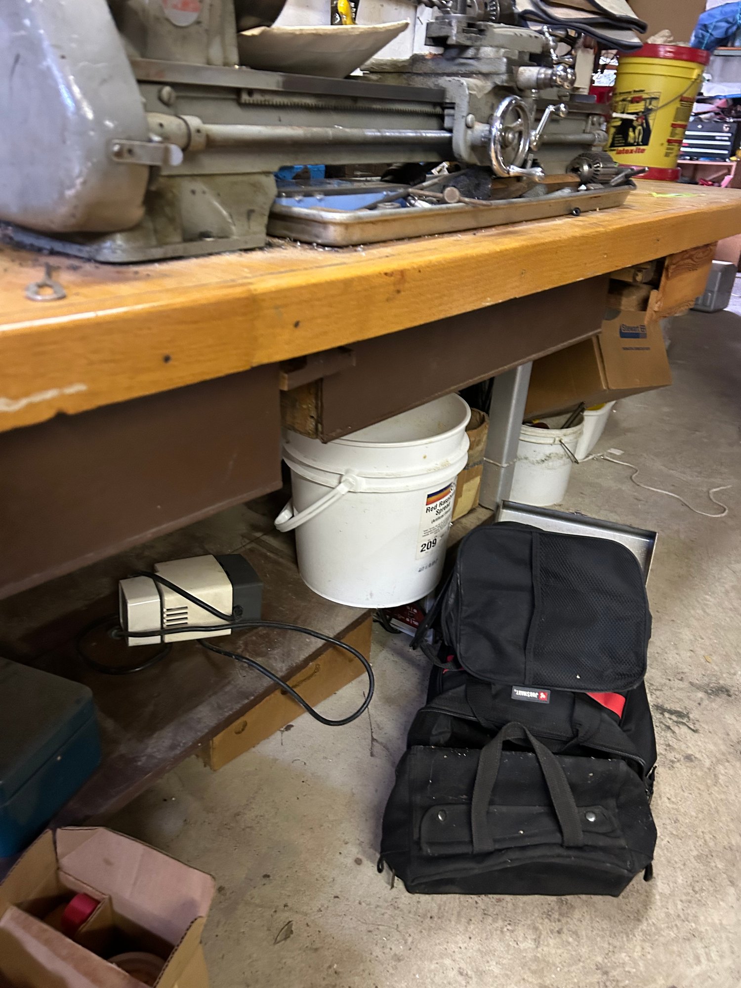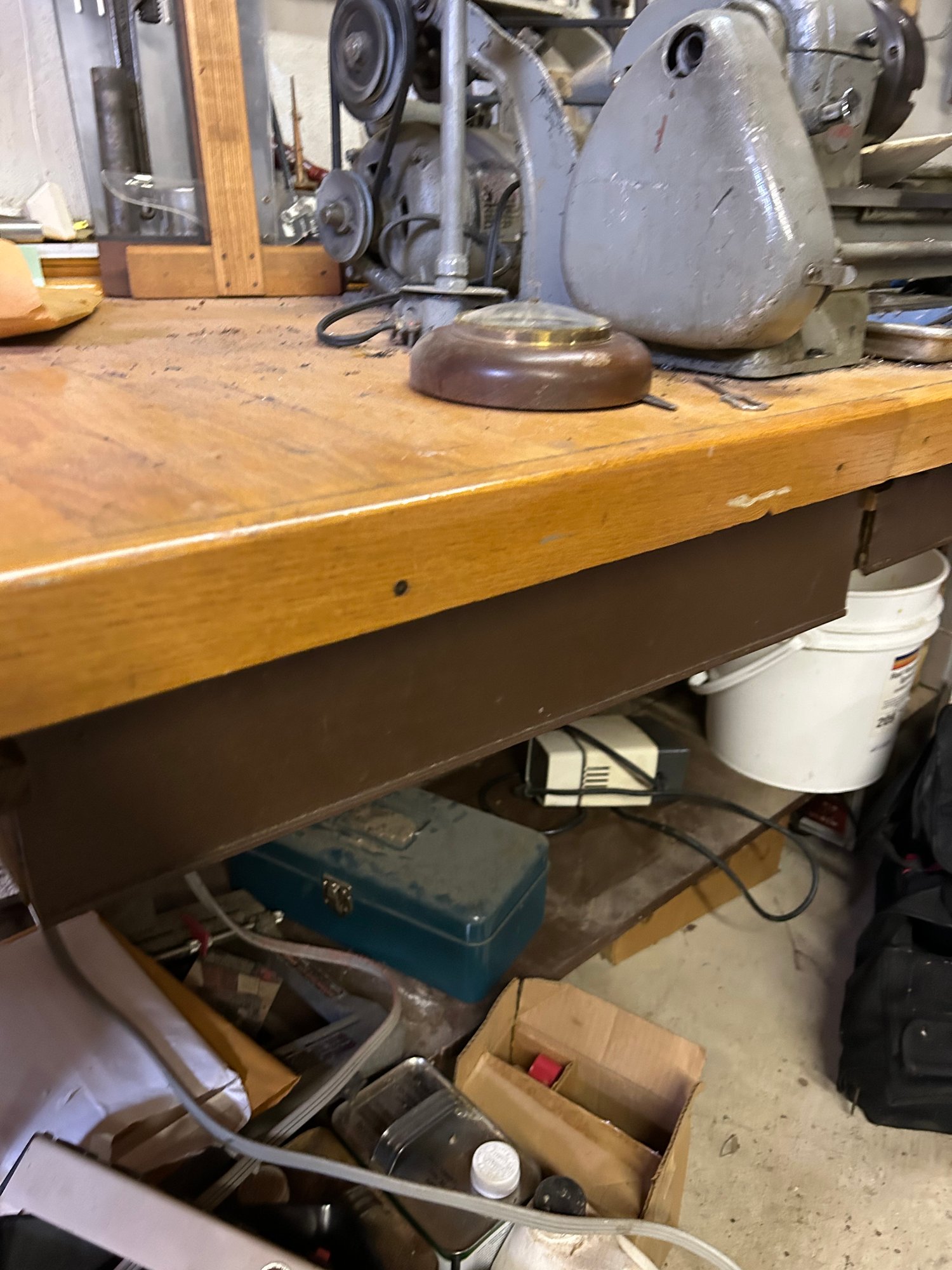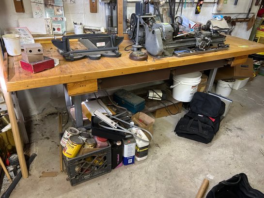Custom made workbench with drawer and lower shelf. Metal base oak top. lathe bolted to top not included 98 inches and by 33“ x 34“ high.