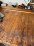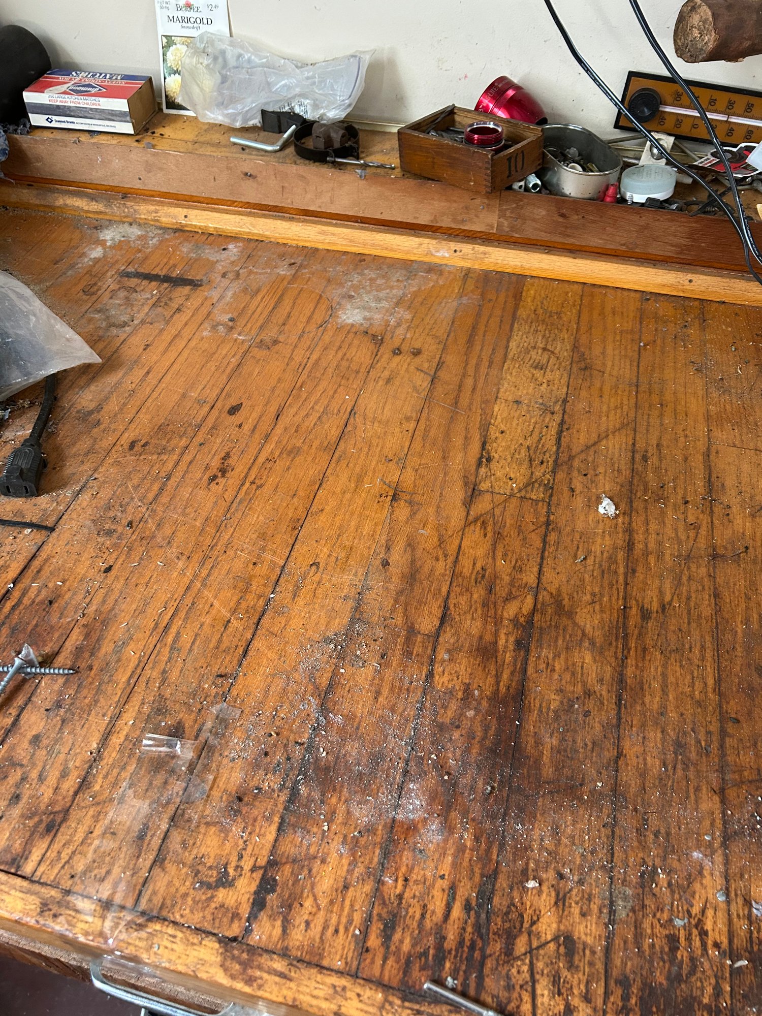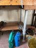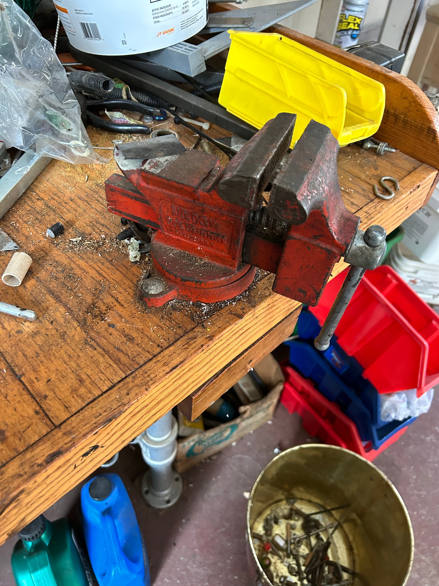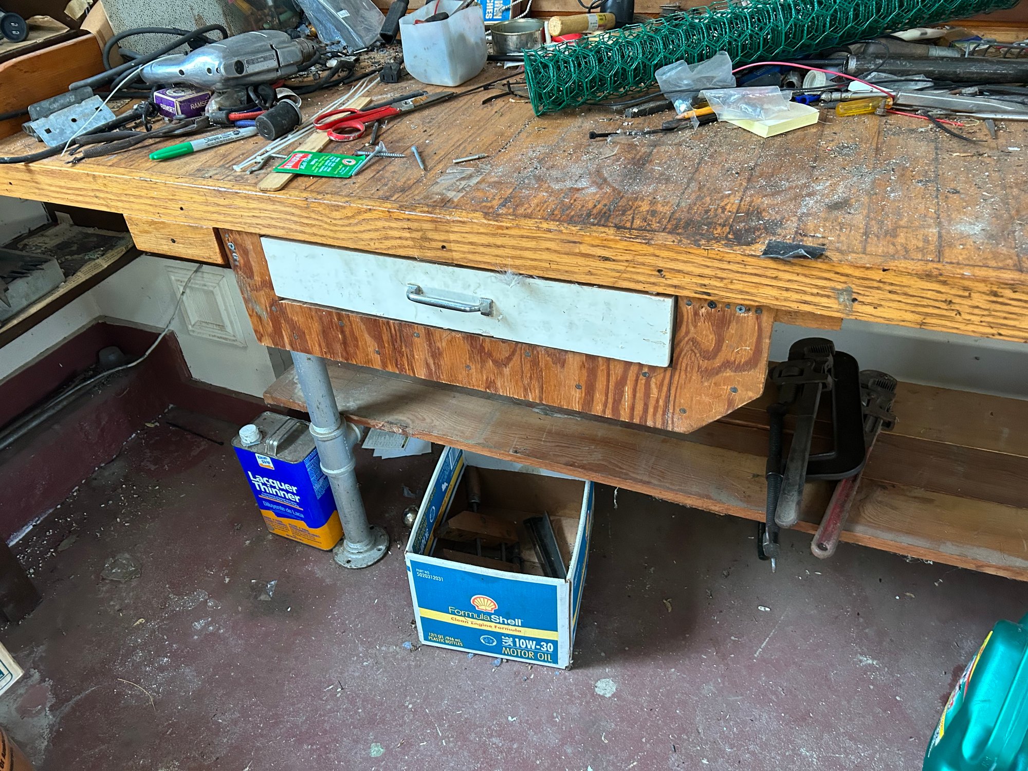 Custom workbench – garage wood top with short shelf, drawer added, metal base. With metal vice. 80” x 32“ x 34“ tall.