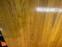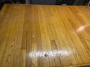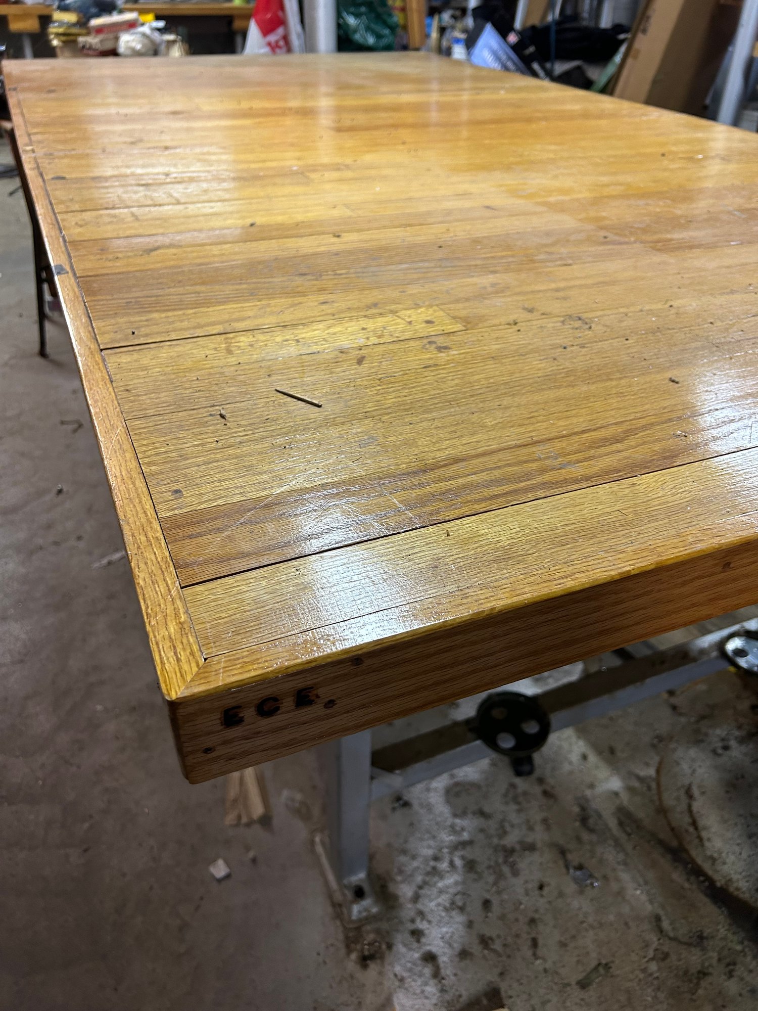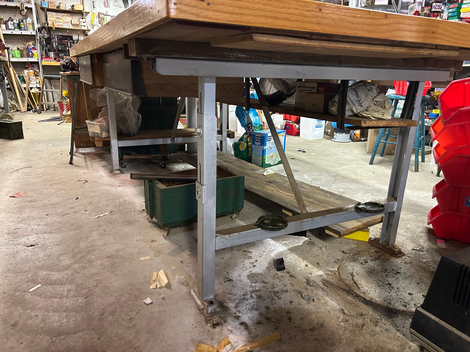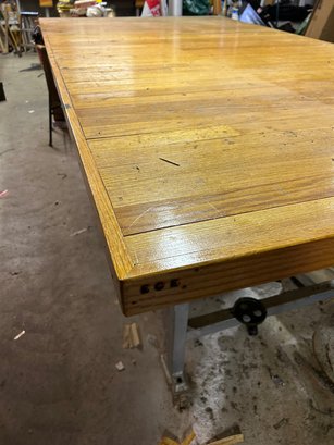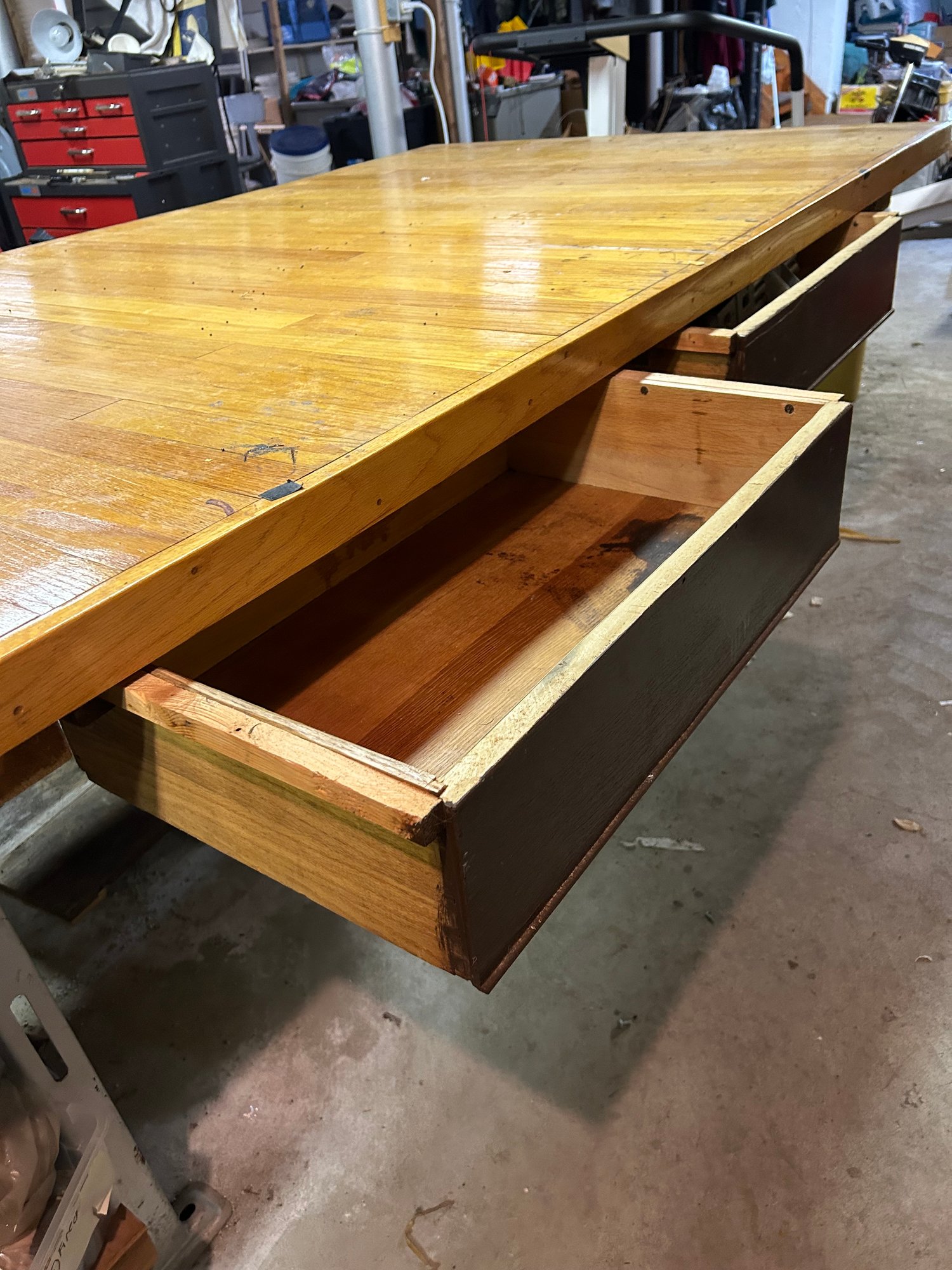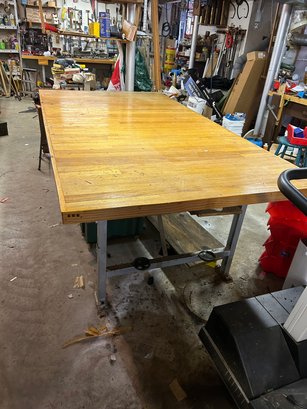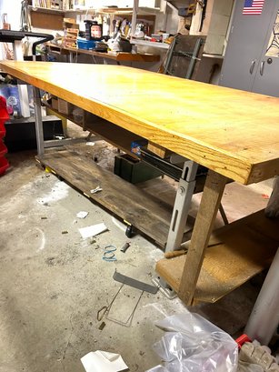 Custom workbench with two drawers, shell, metal base, oak top. 97 1/2“ x 51 1/2“ x 34“ tall.