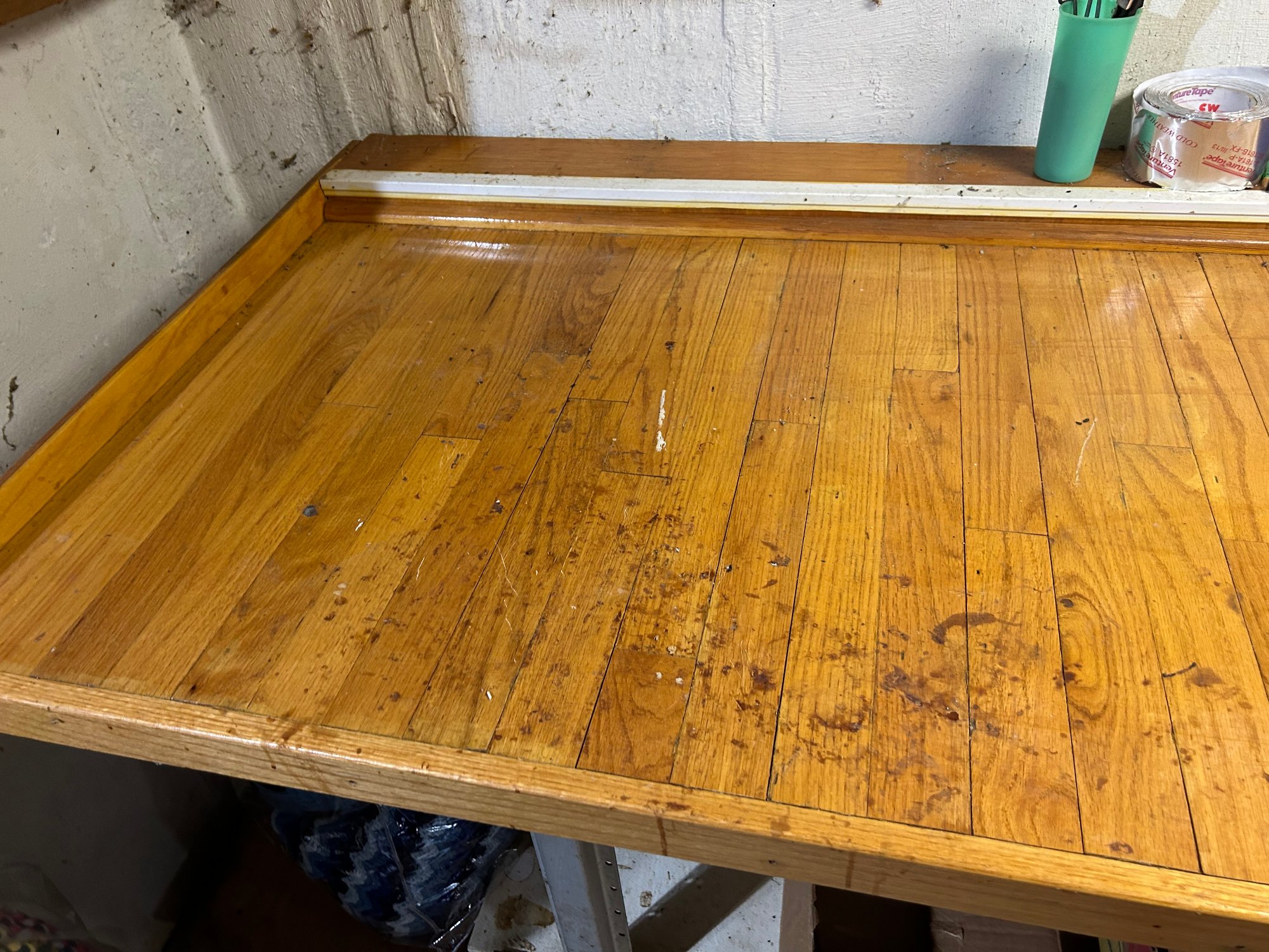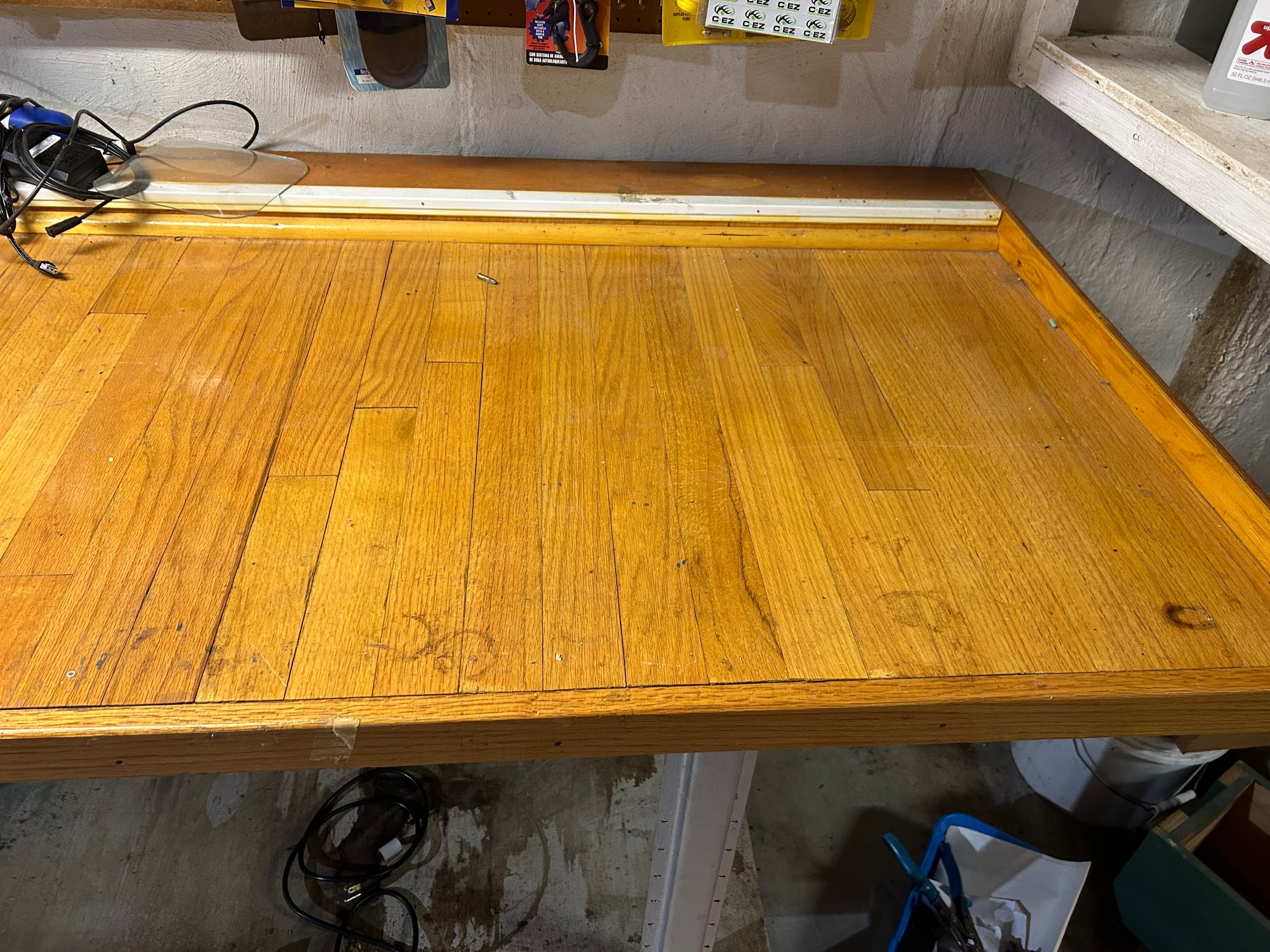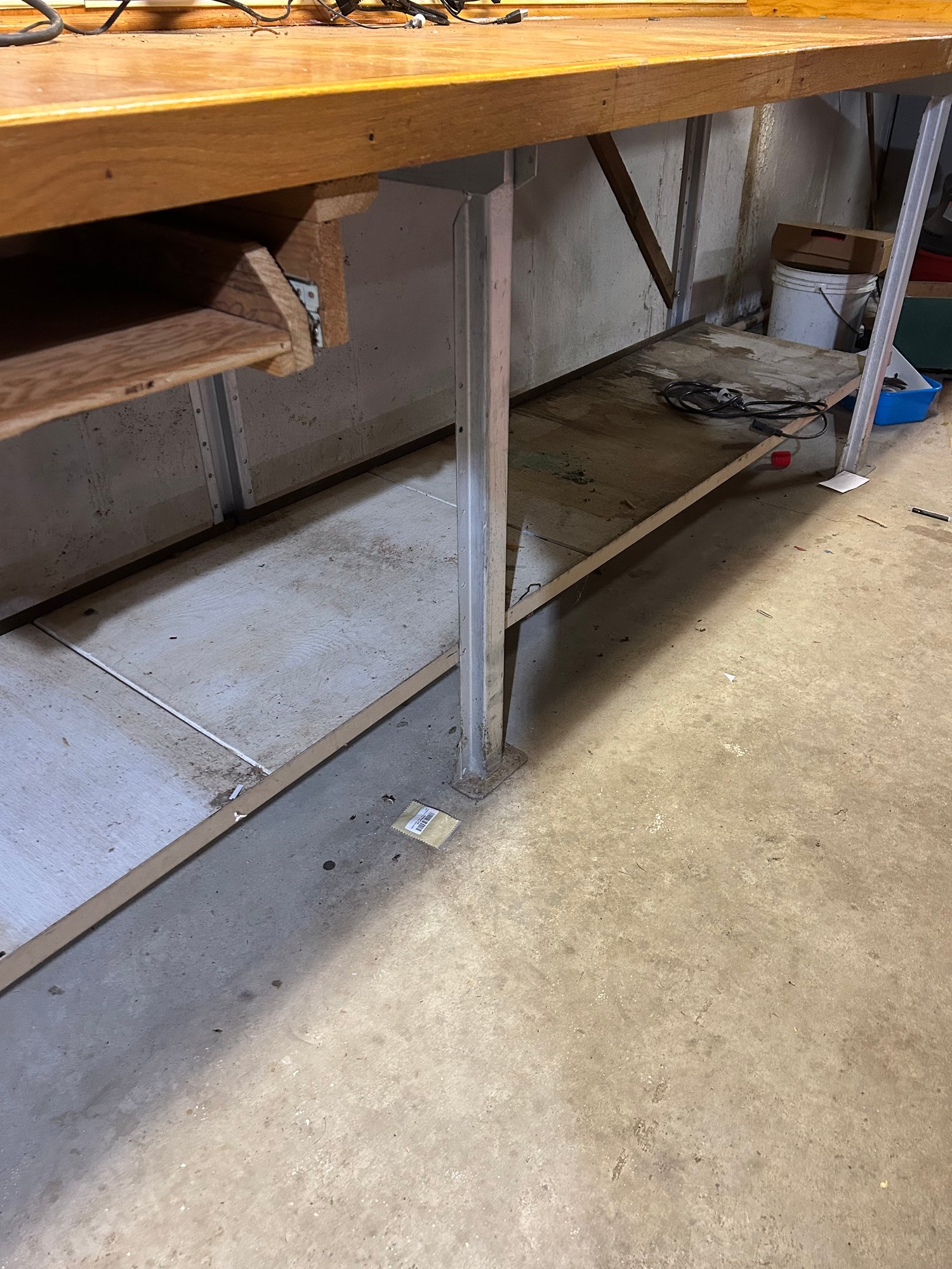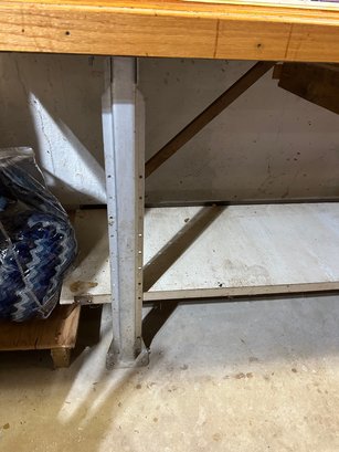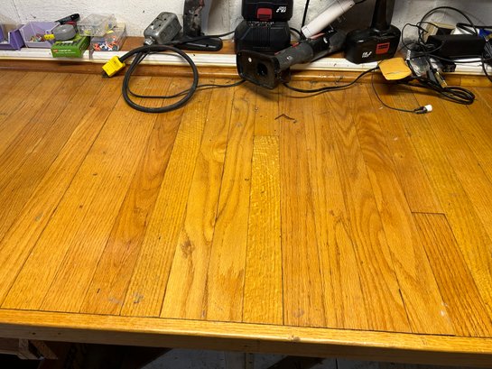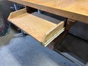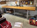 Custom workbench, oak top, metal base, stepped top. Pull out work tray under top. Large size 145 1/2“ x 34“ x 35“ tall.