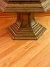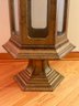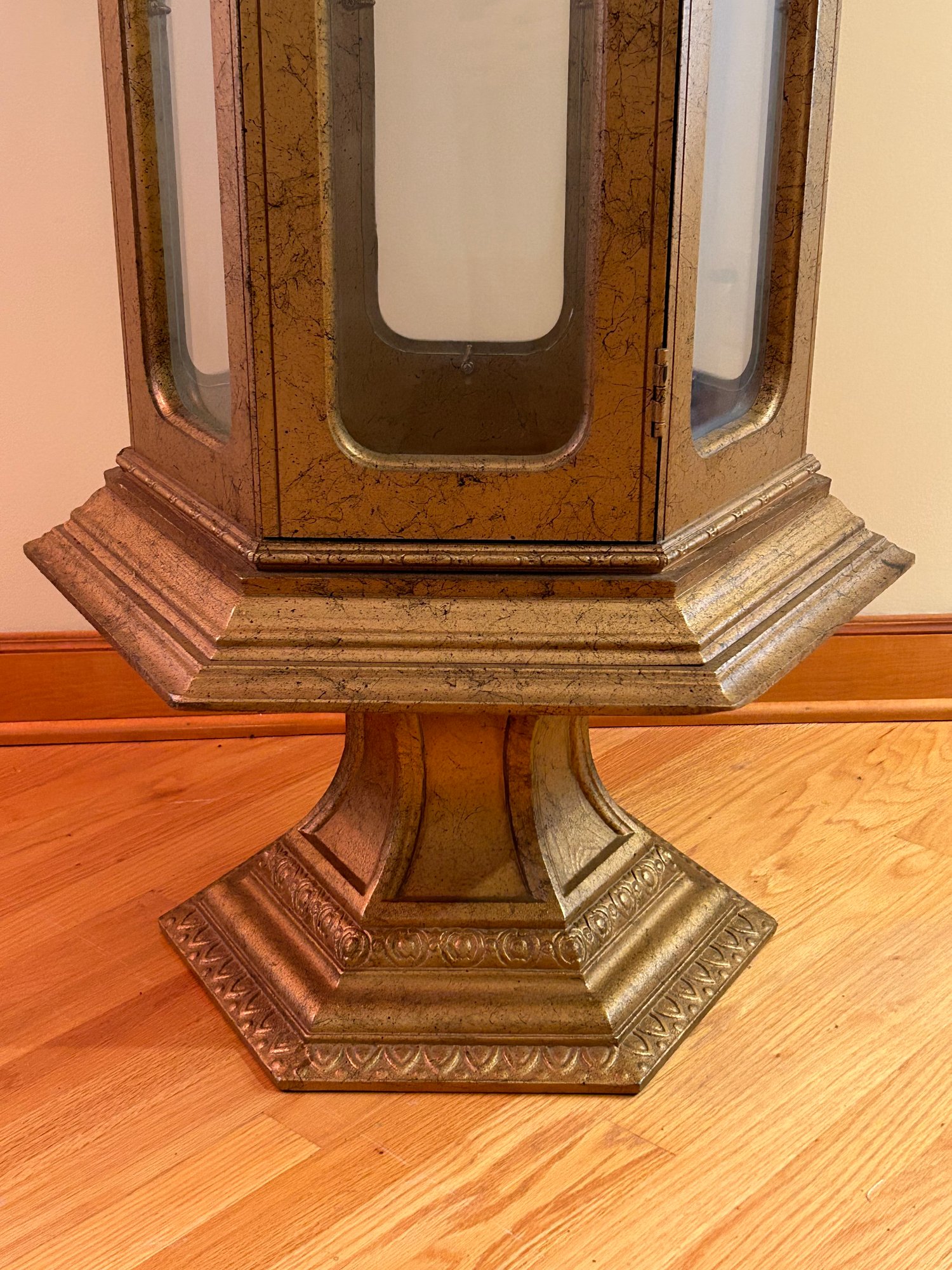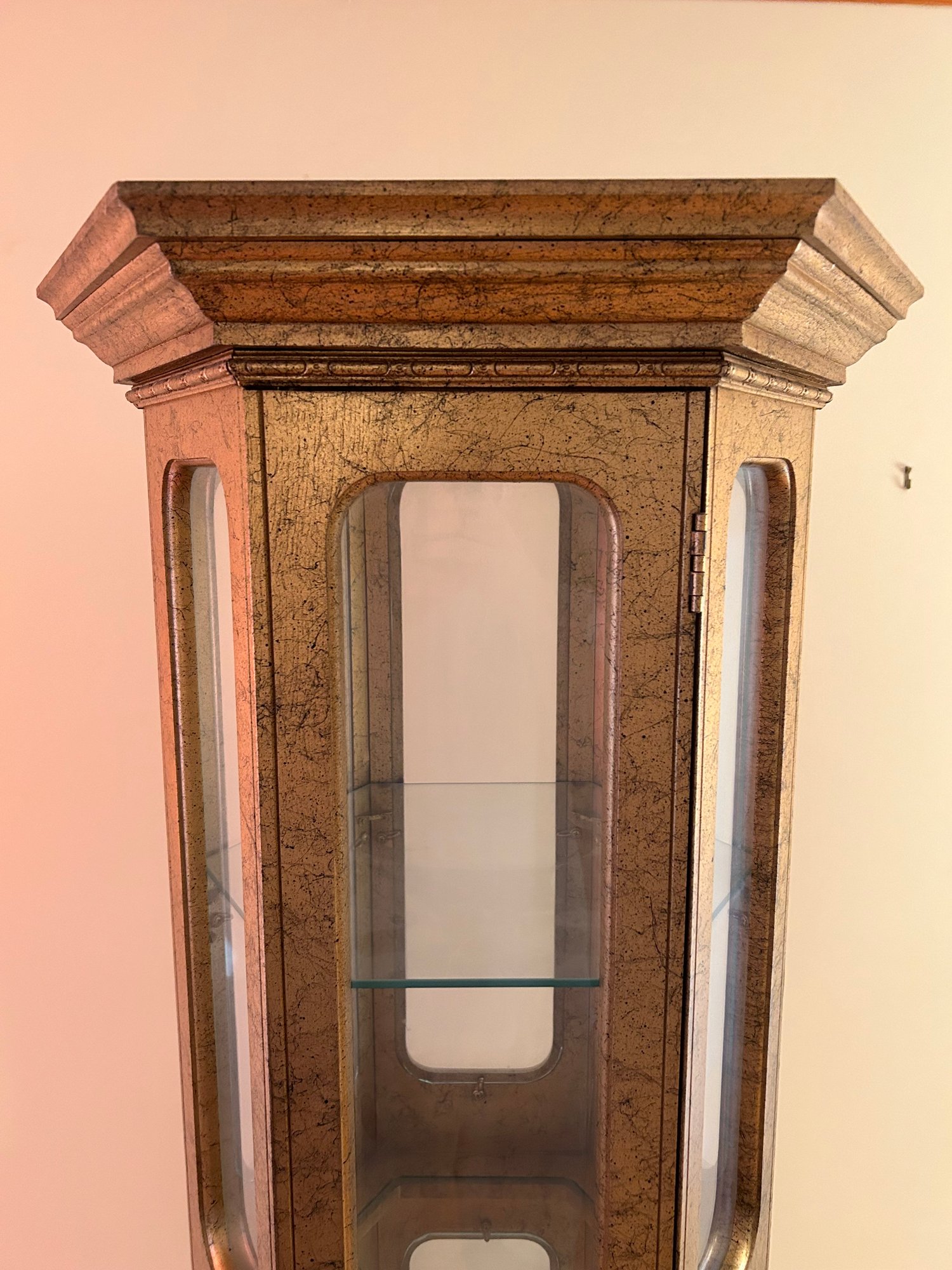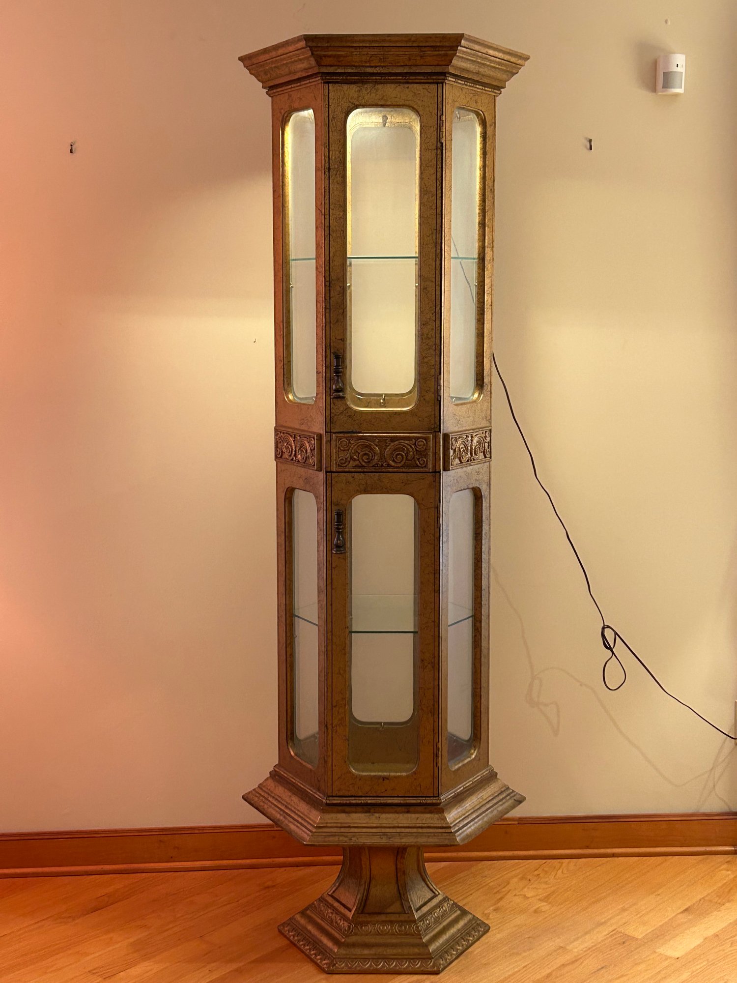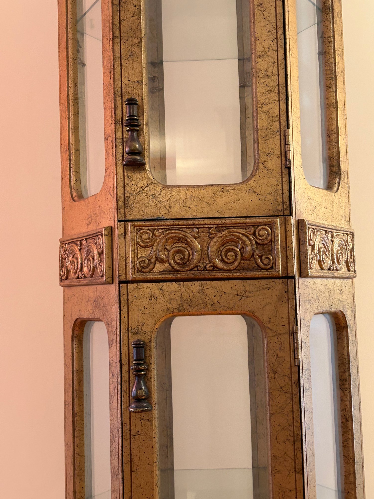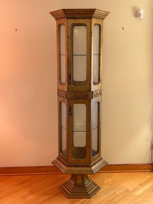 Display case six sided with glass, carved design. Painted gold, metal base, glass shelves, 76x24x21 inches