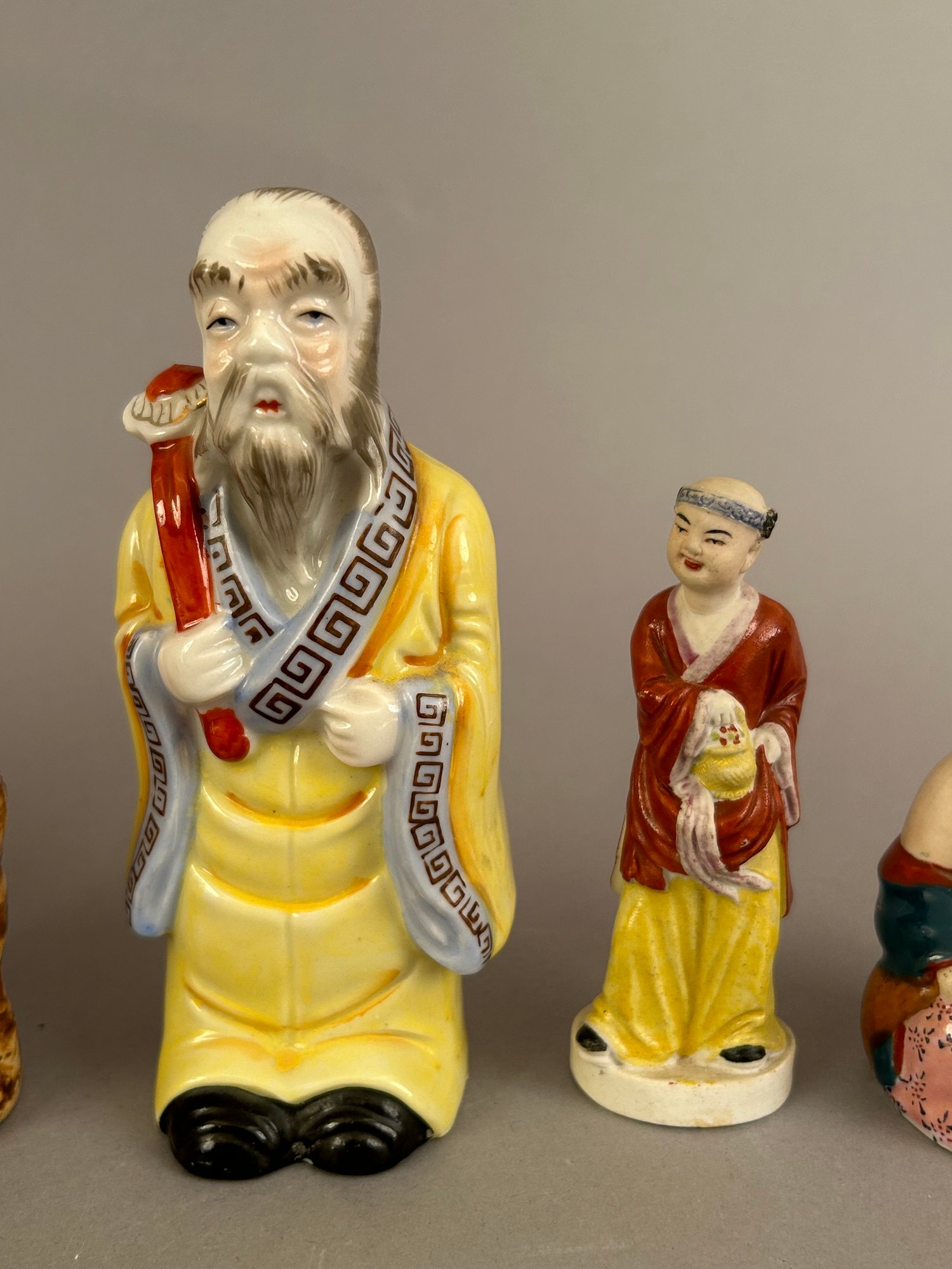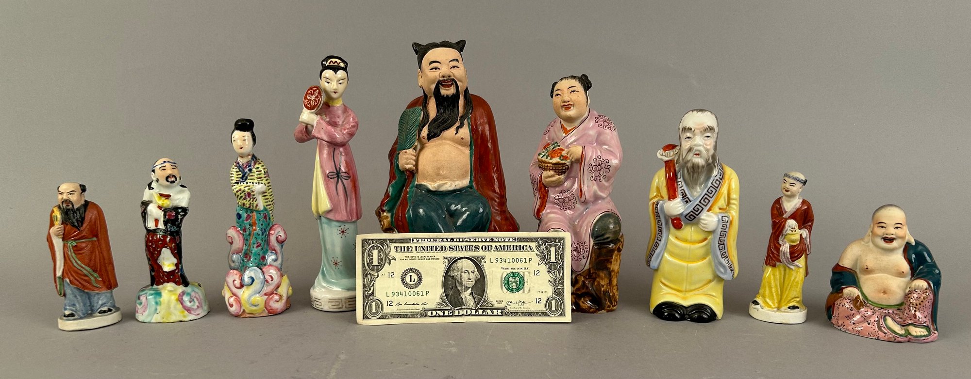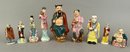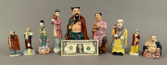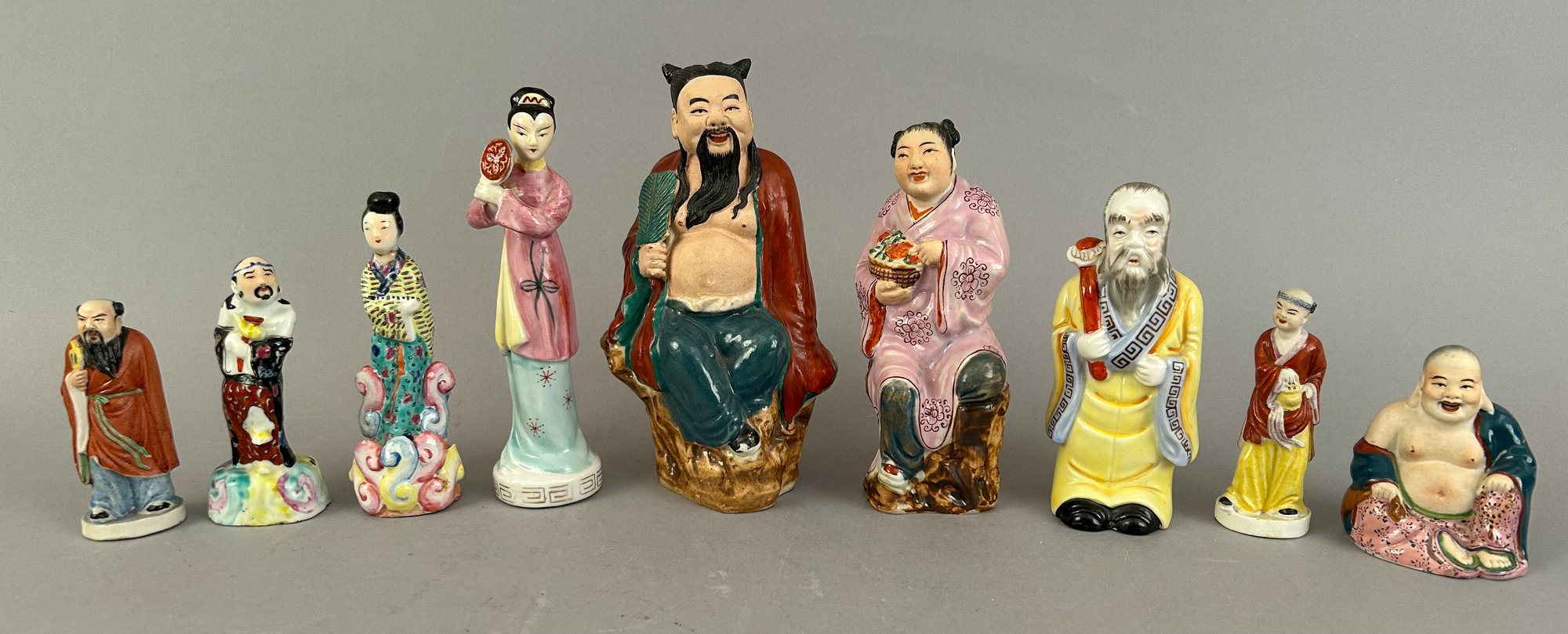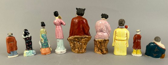 Nine Chinese figurines of assorted shapes and sizes. Some marked on the bottom.