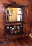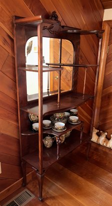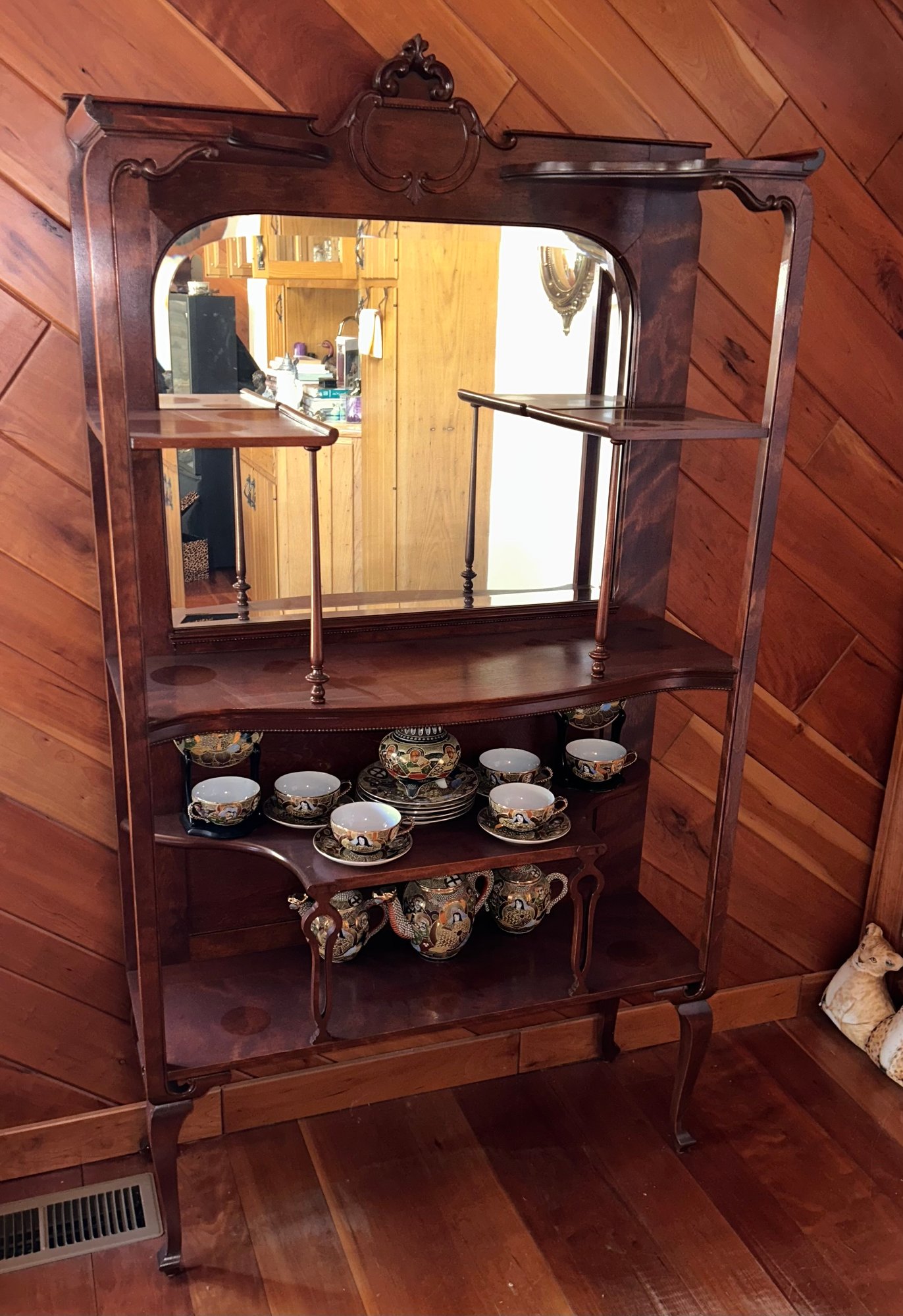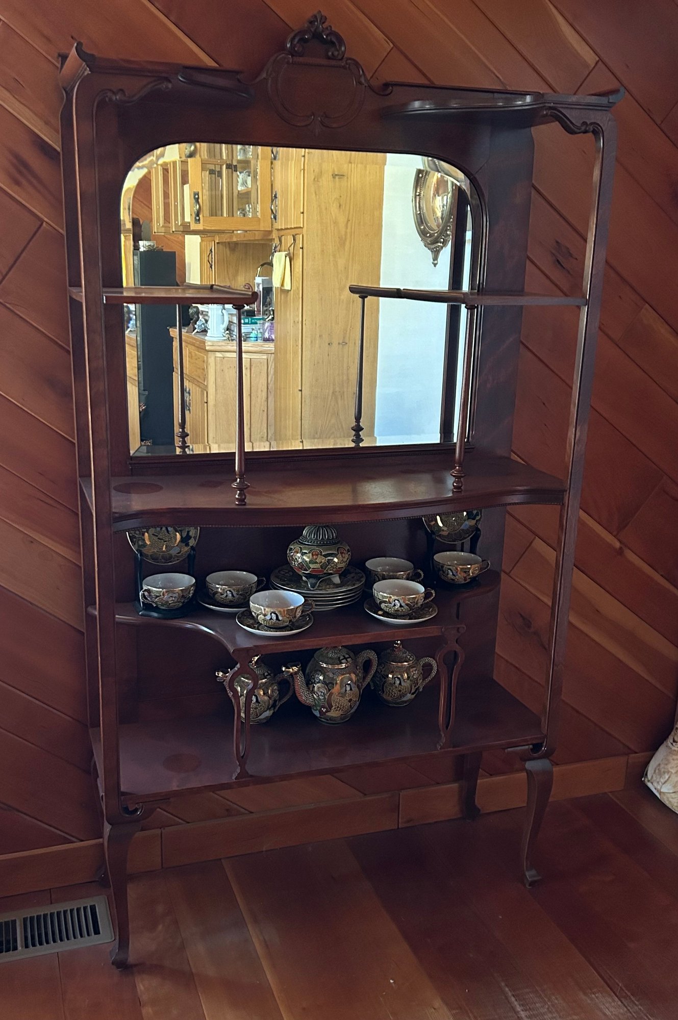 Etagere, early 20th century multi tiered shelf with beveled glass back. (Satsuma not included) 35 inches wide 65 inches tall 12 inches deep.