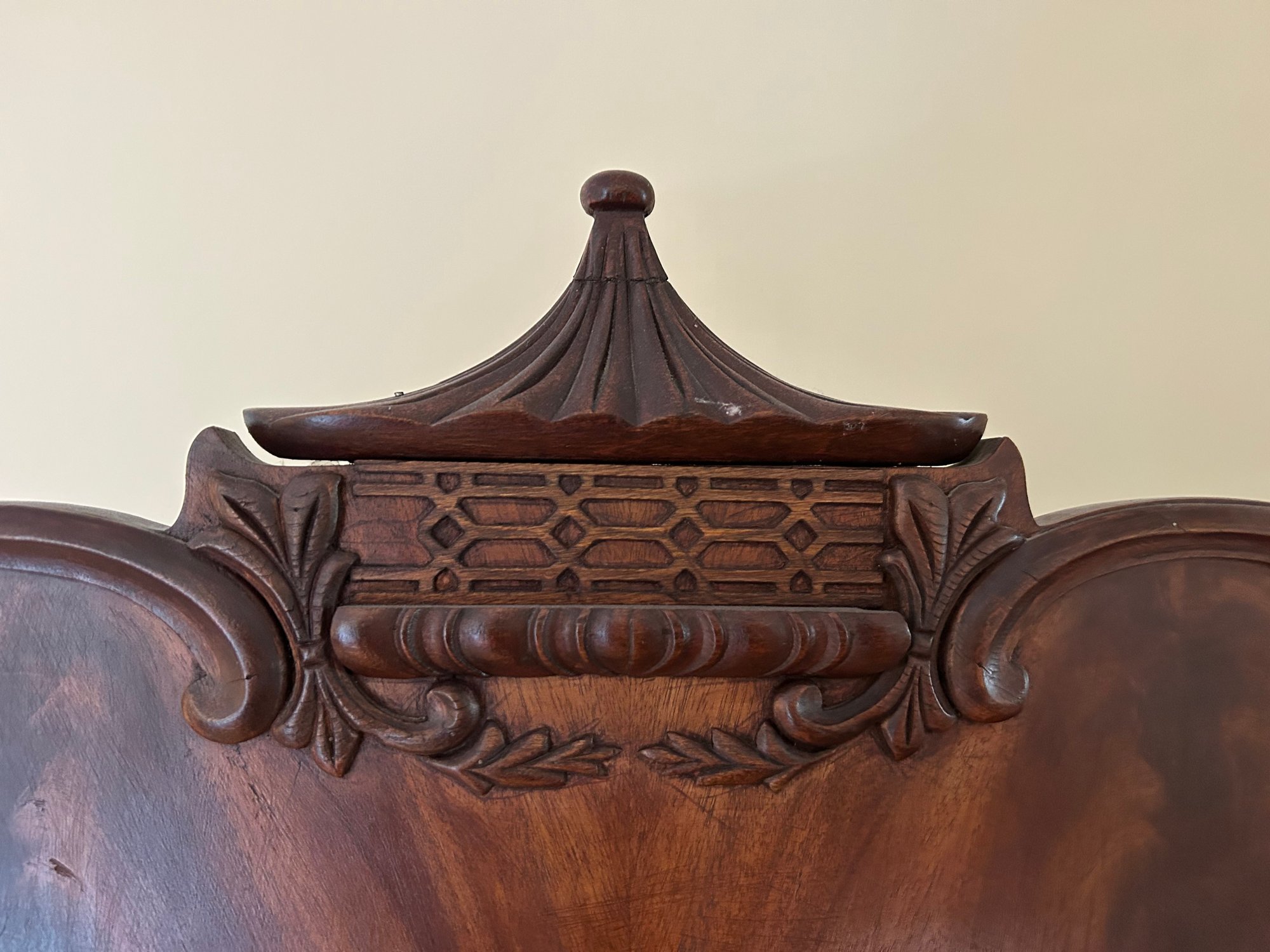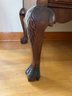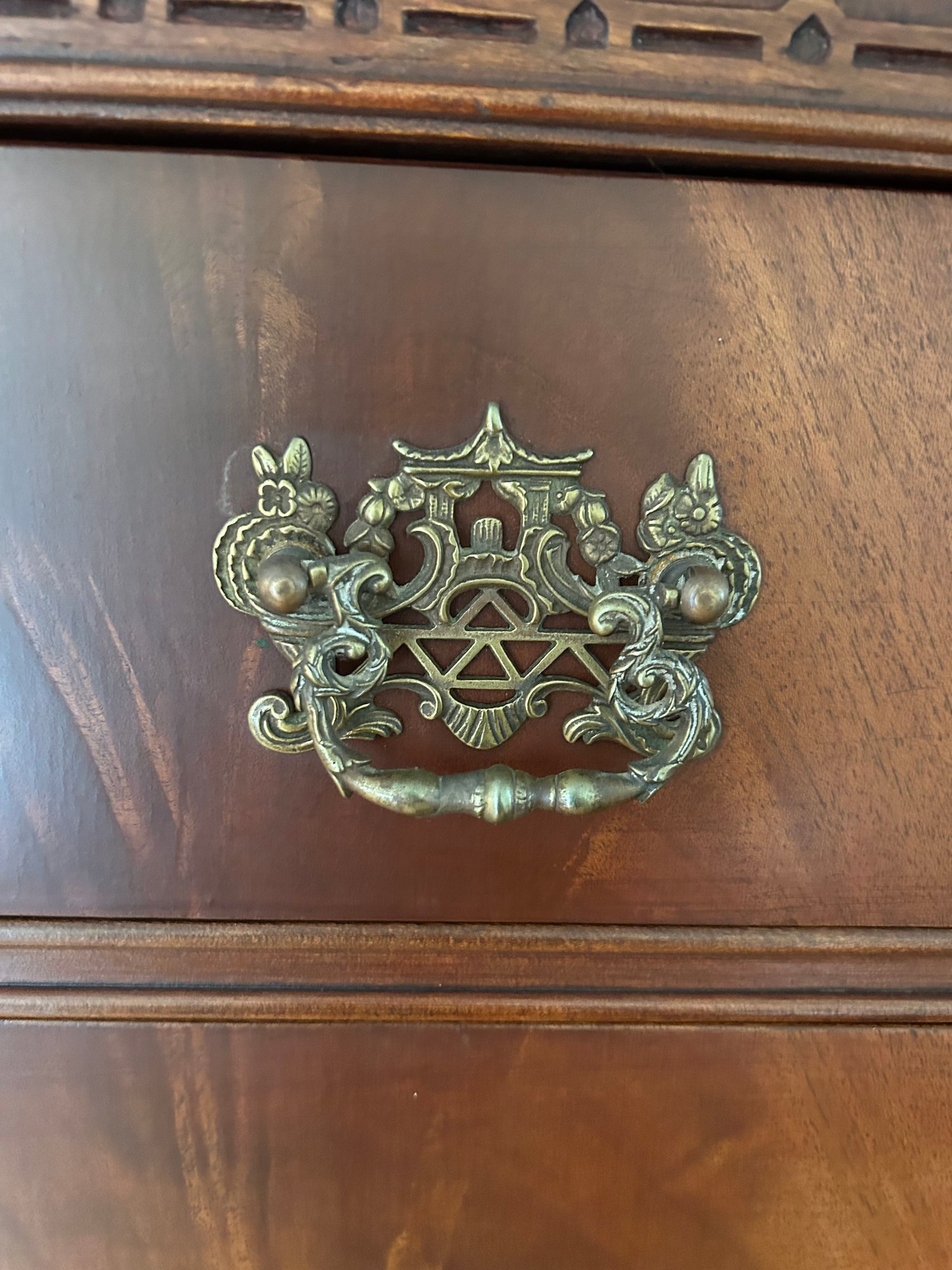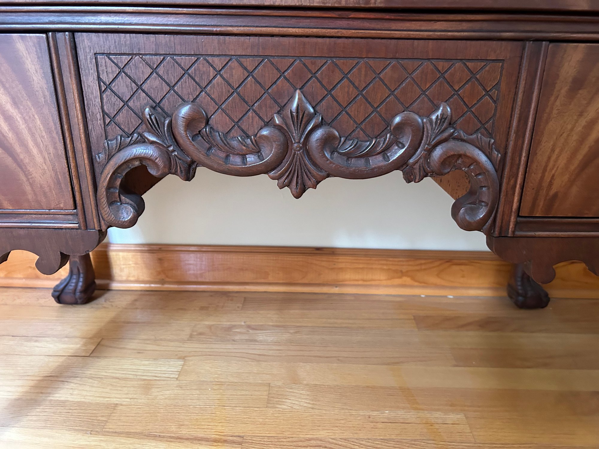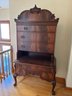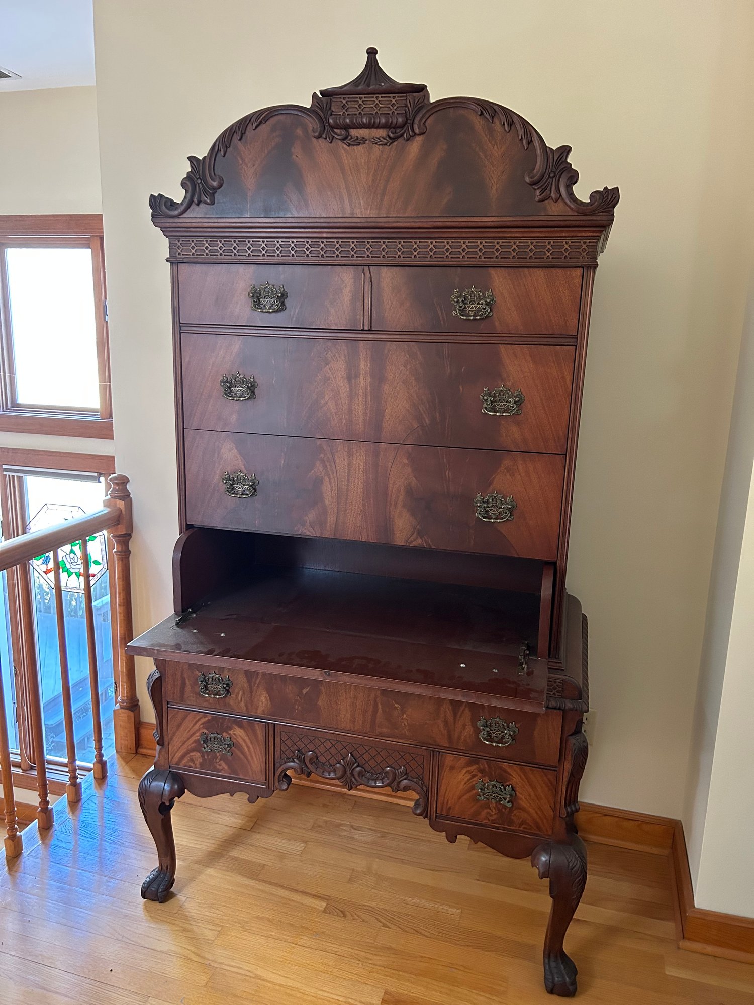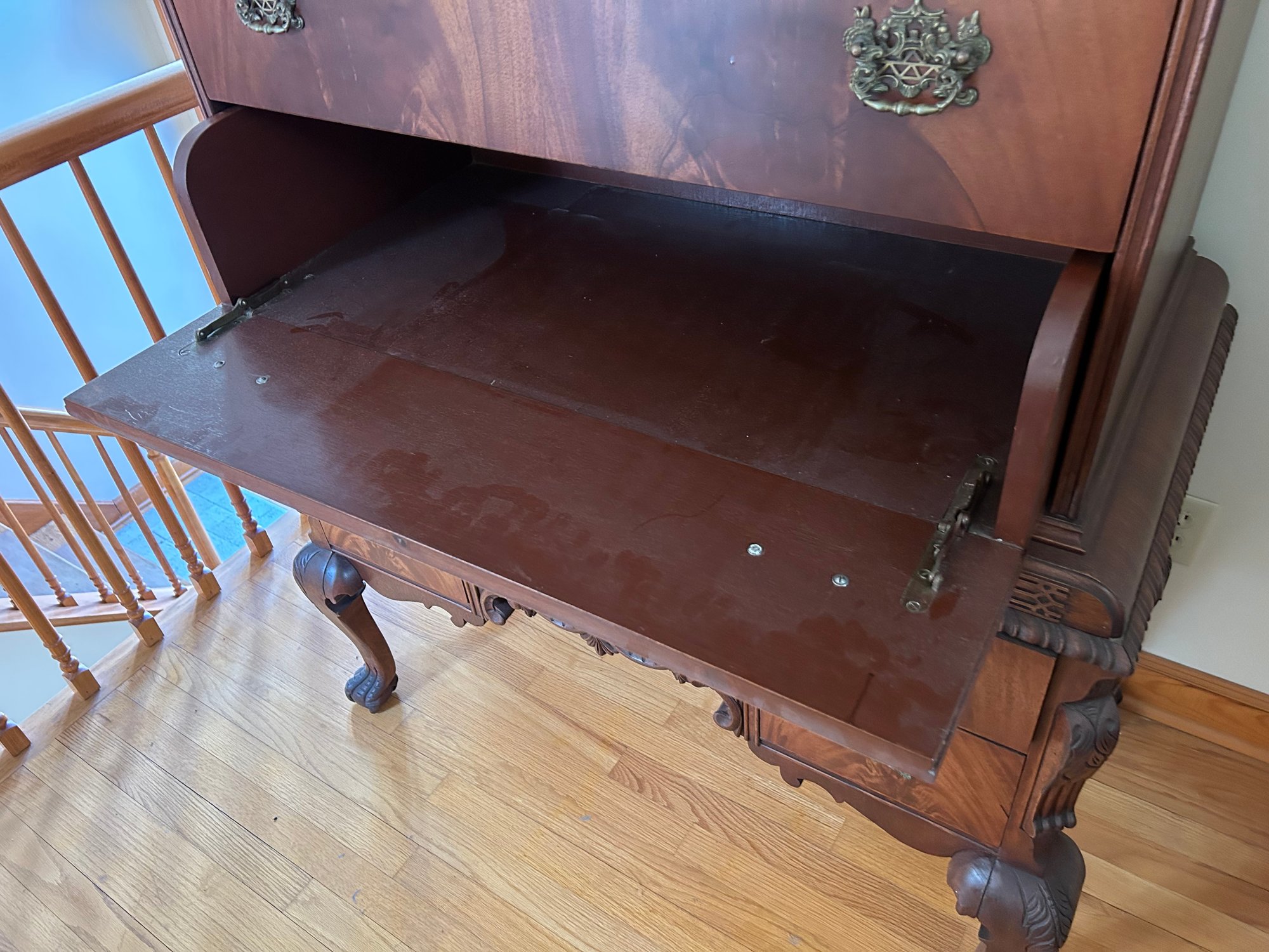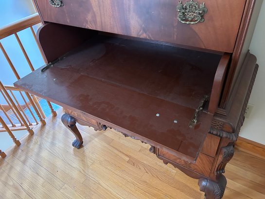 Mahogany highboy/desk. Early 20th century with carved crest, skirt, and legs. Full front desk. Original brass hardware. 40 inches wide 21 inches deep 77 inches tall.