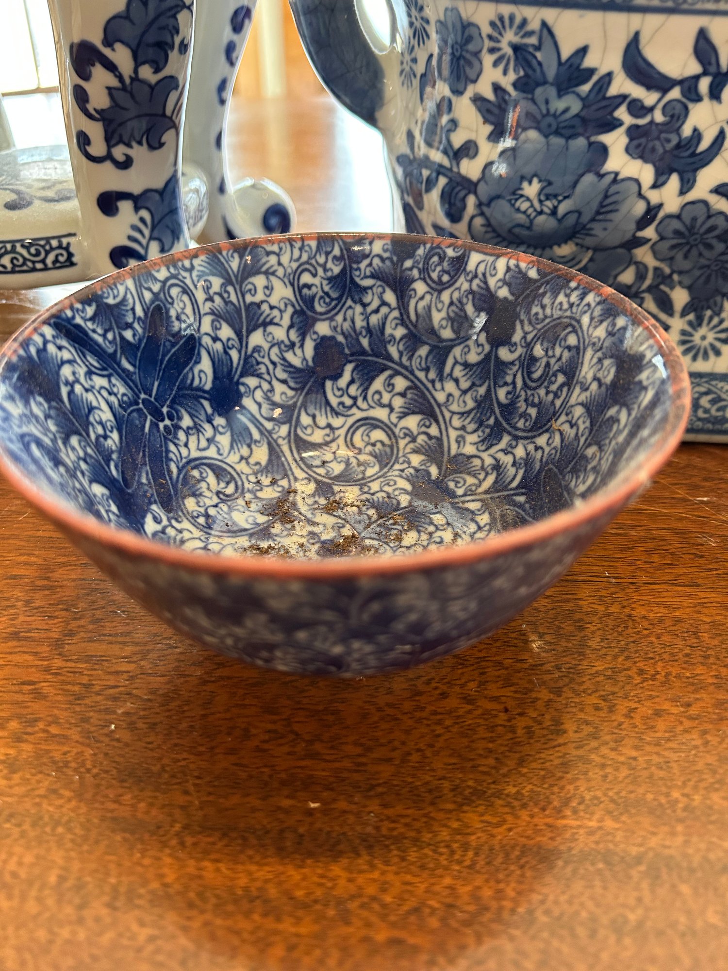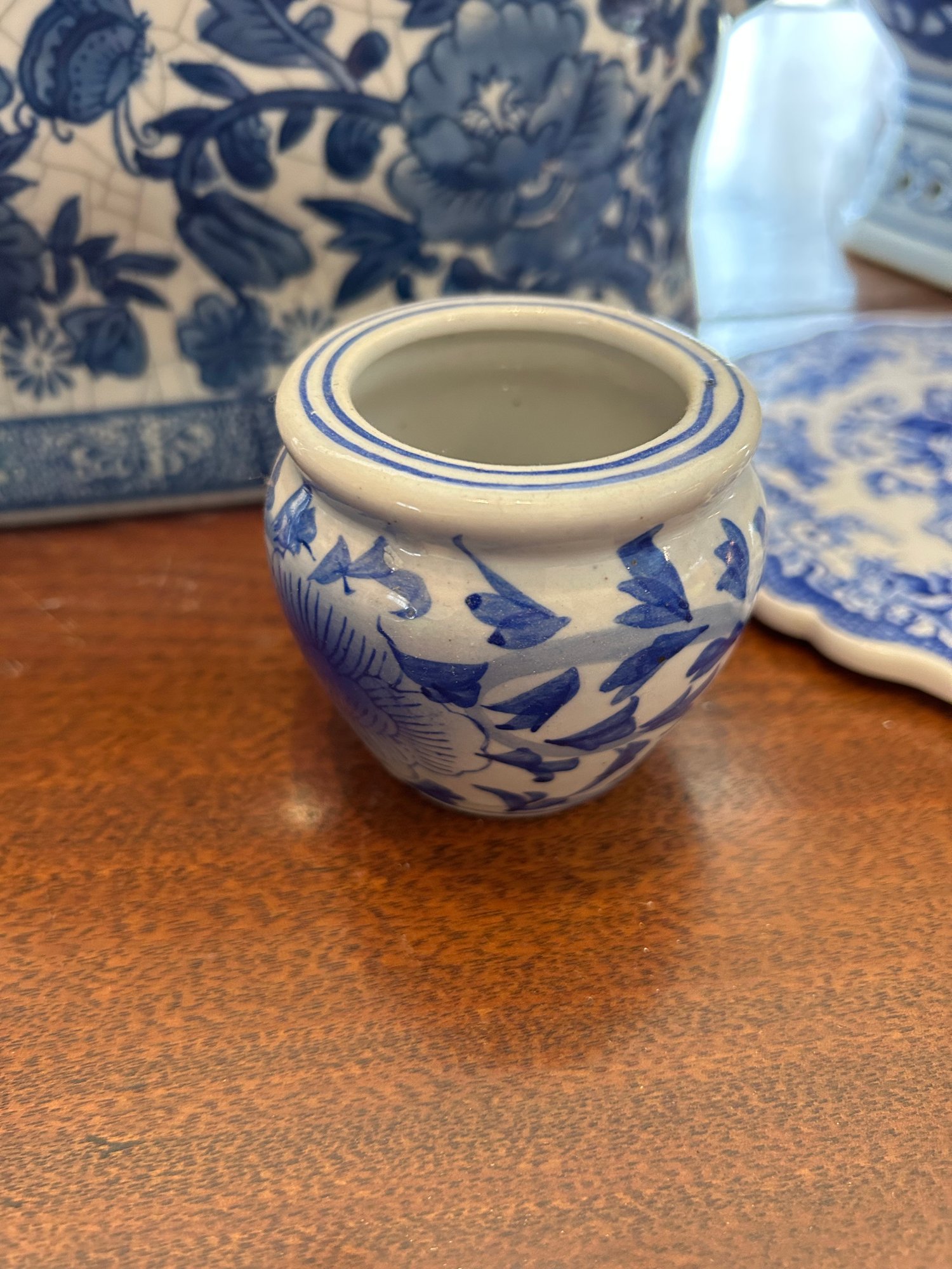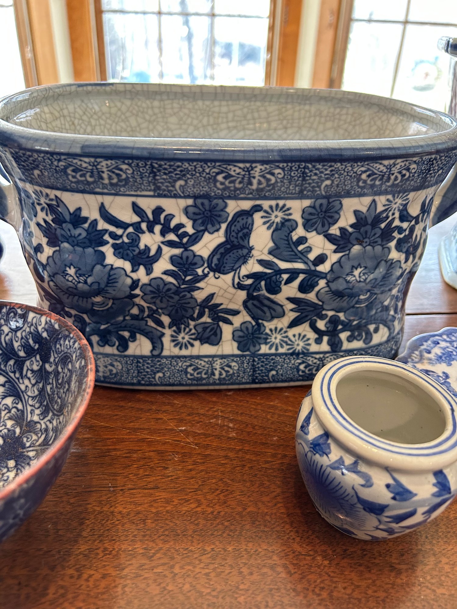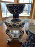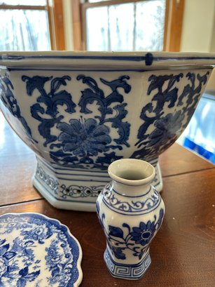 Eight pieces blue and white Chinese style pottery. Planters, pedestal, bowls. Tallest piece 9 inches.