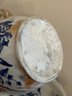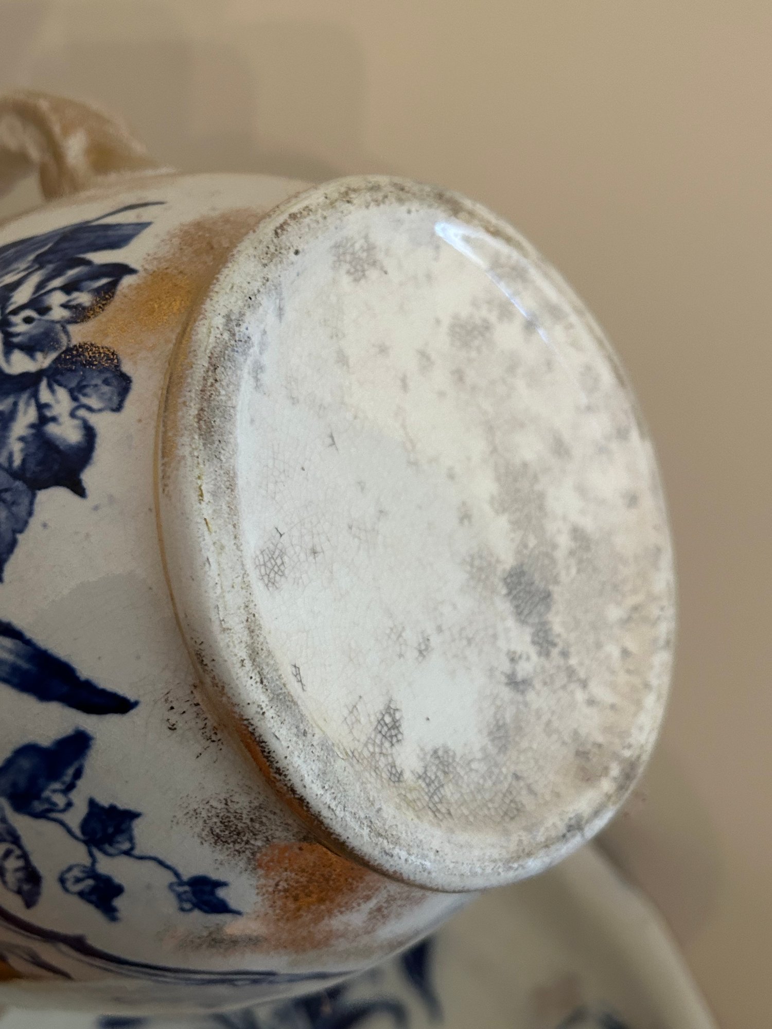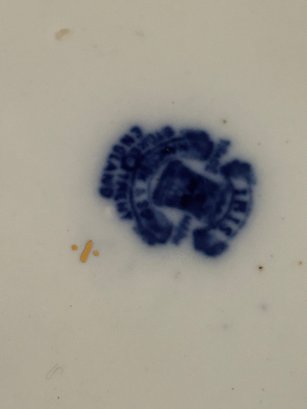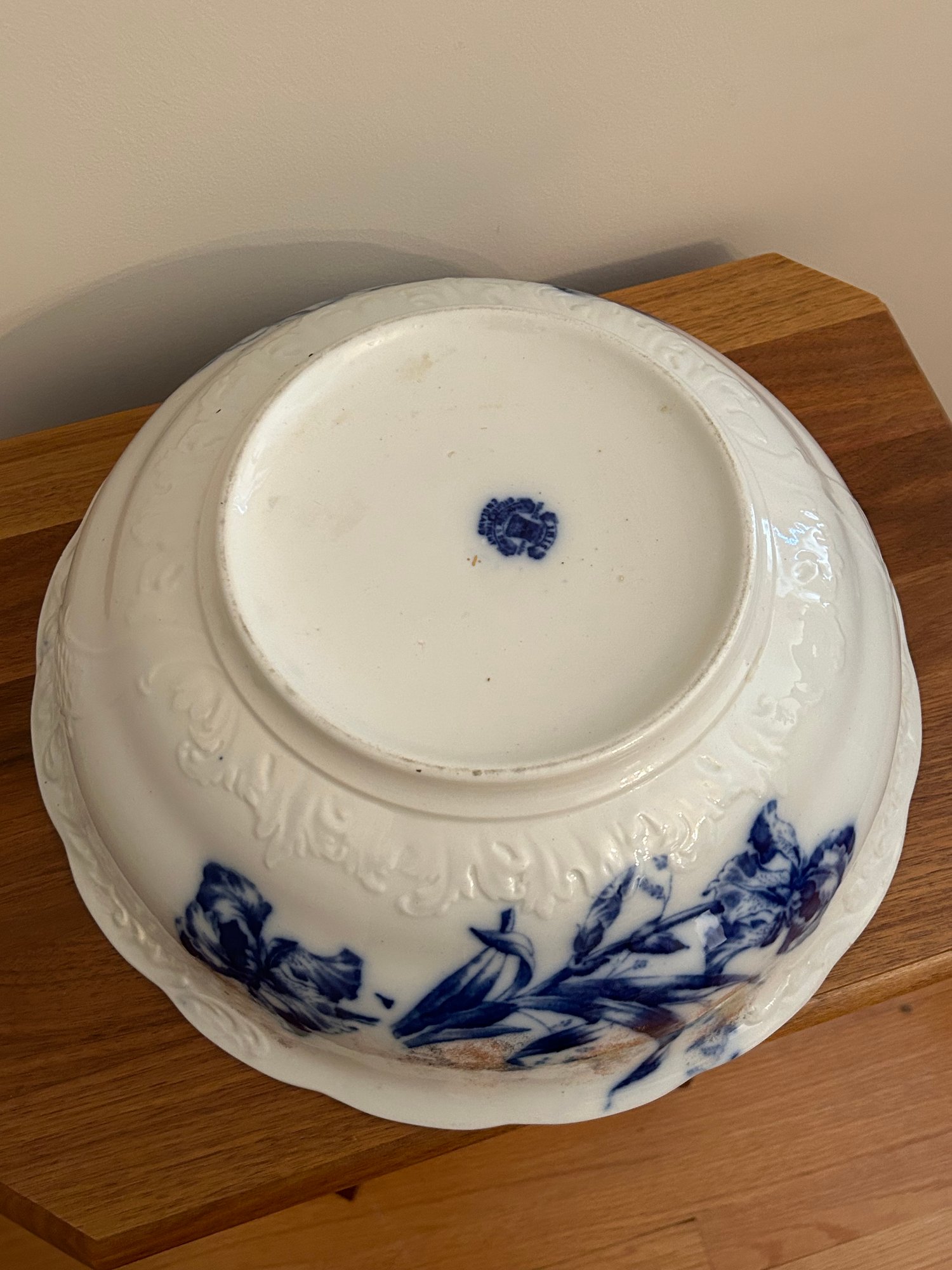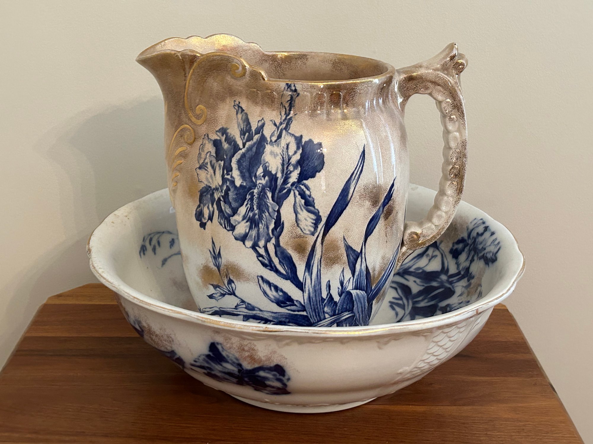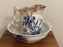 Pitcher and bowl flow blue with gold highlights. Iris pattern. Mark on bottom, see picture. Bowl 15 inches in diameter and pitcher 11 inches tall.