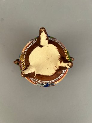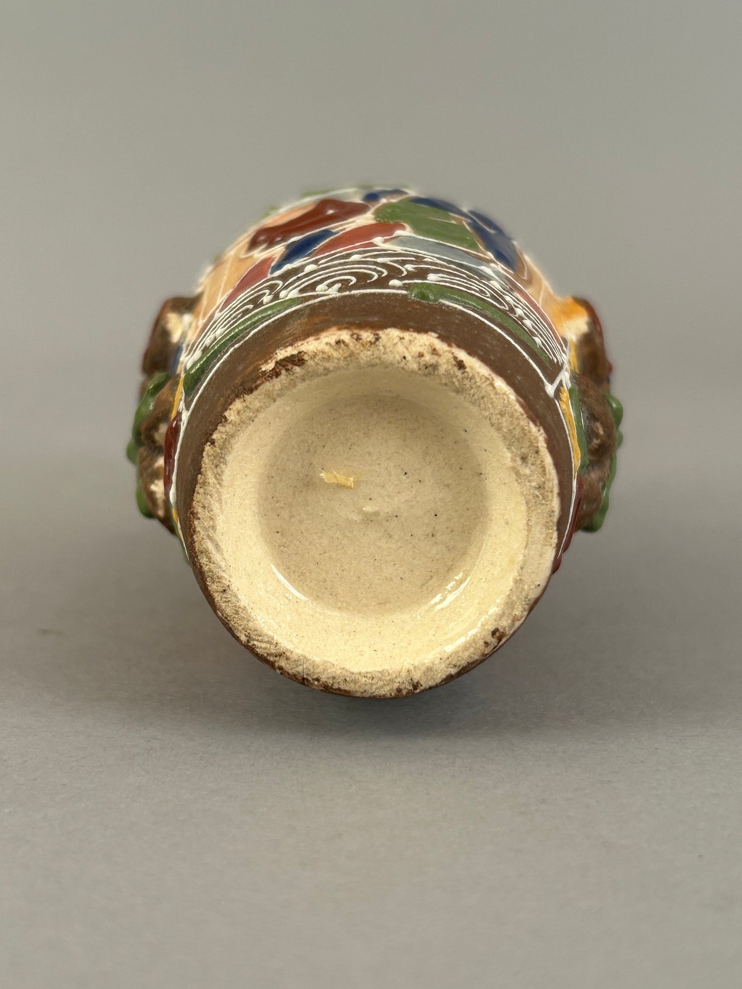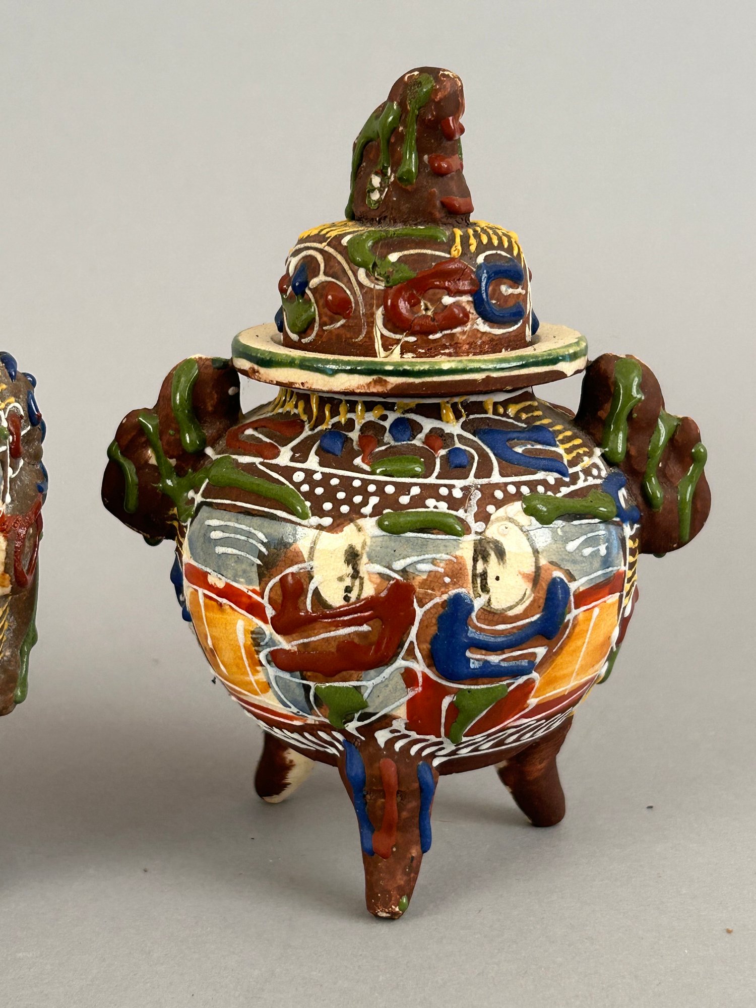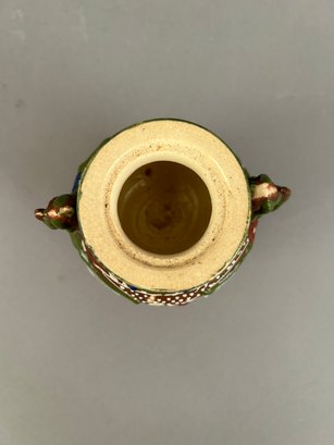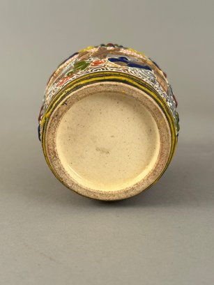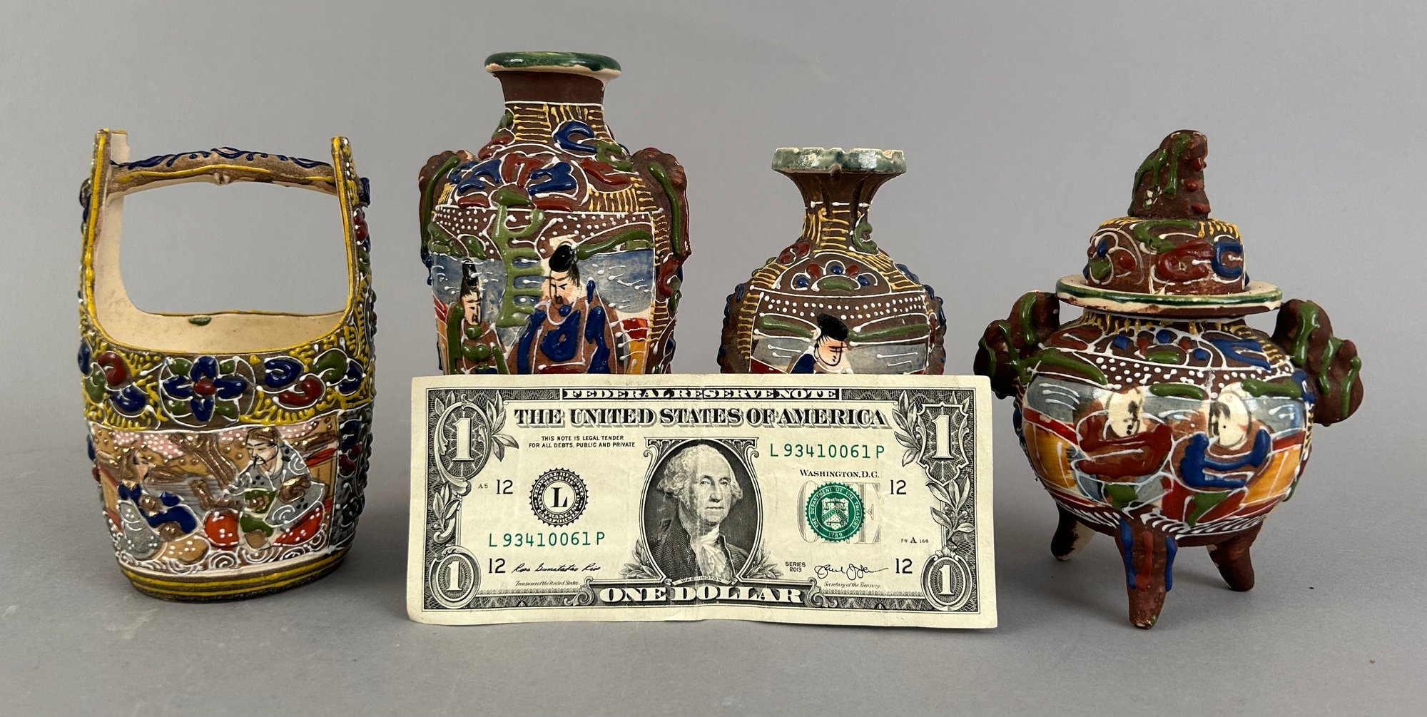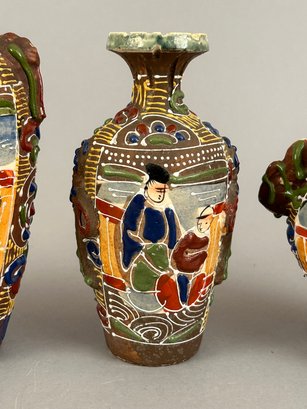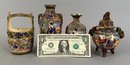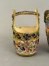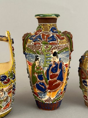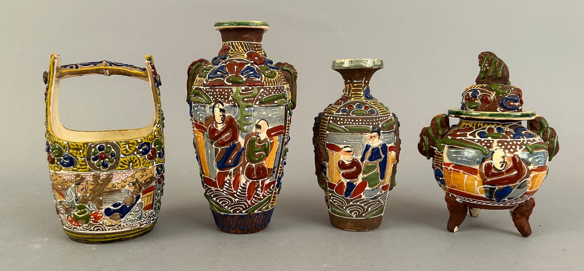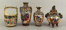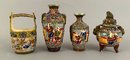 Four assorted pieces of Japanese Moriage Satsuma including two vases, a covered dish and a small porcelain bucket.