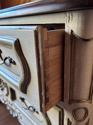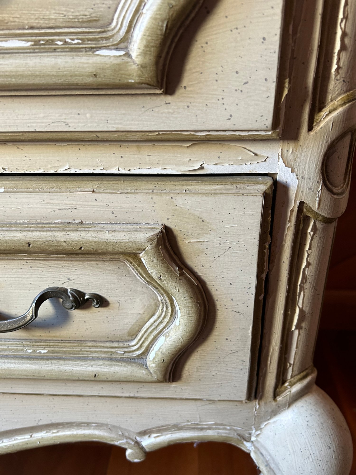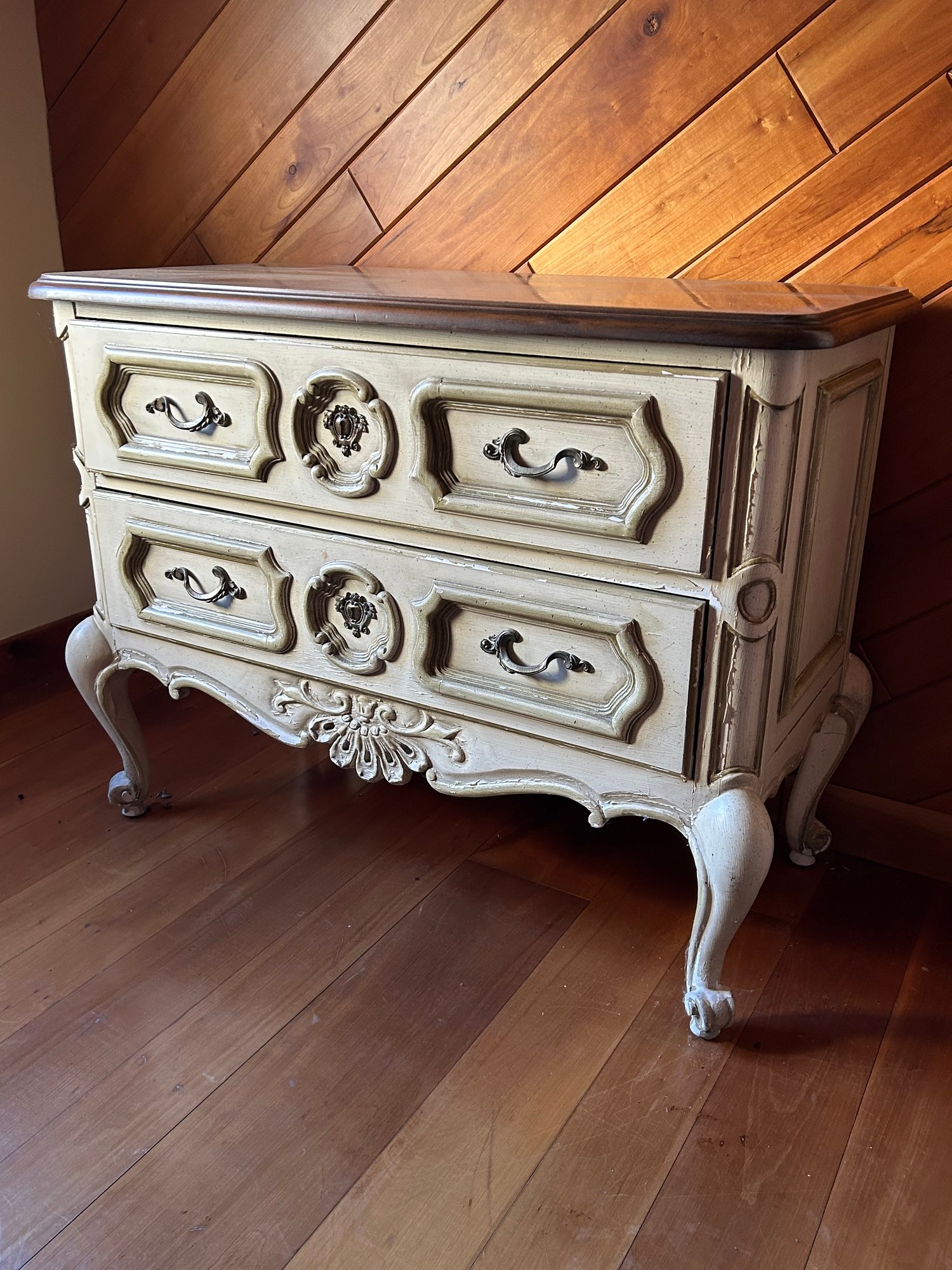French country two draw chest hardwood top, chippy white paint 36 1/2 inches by 28