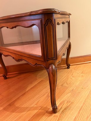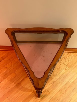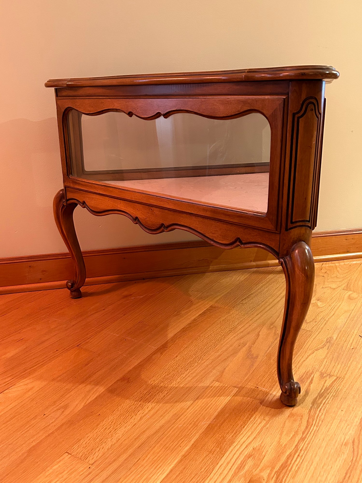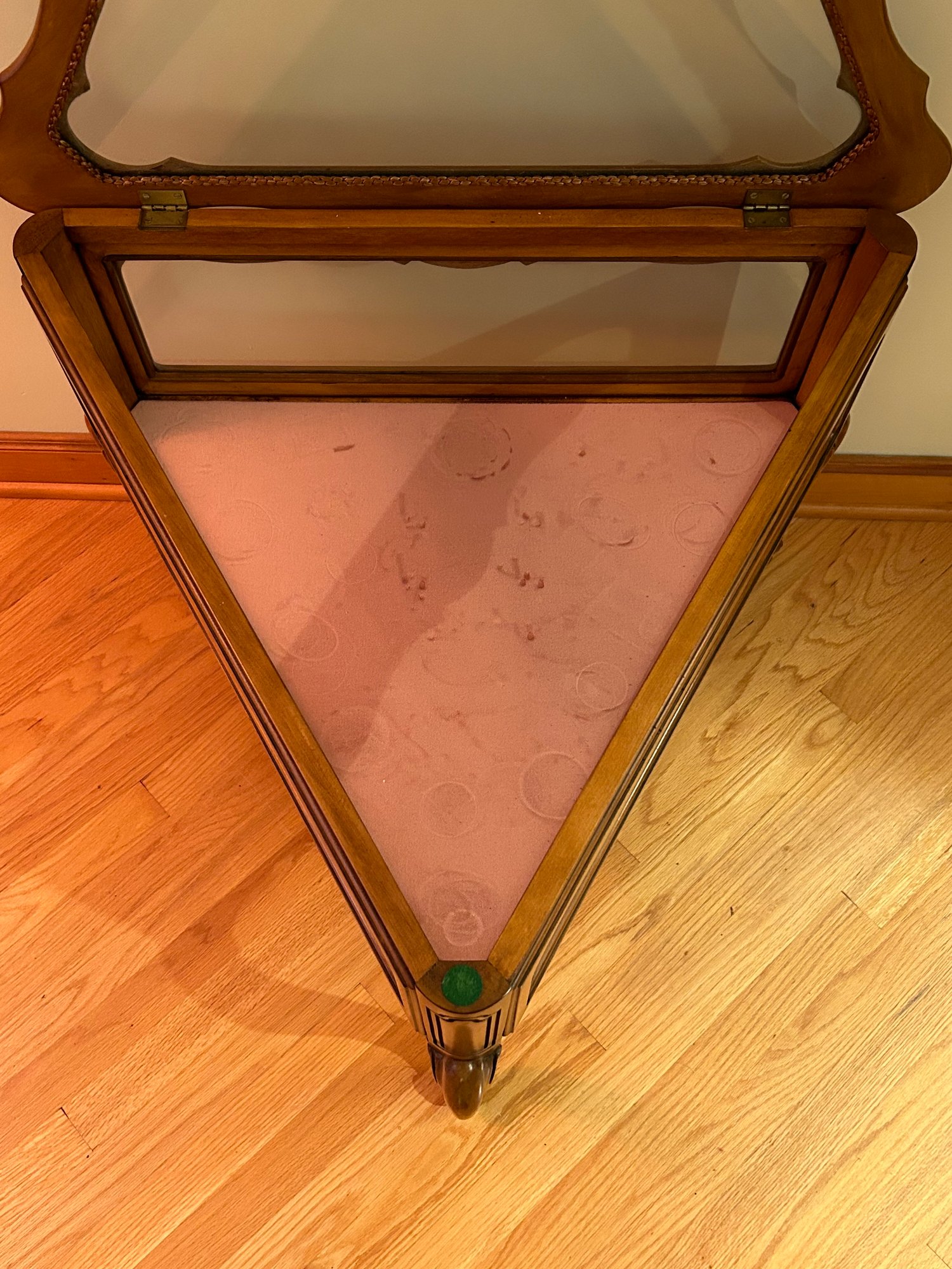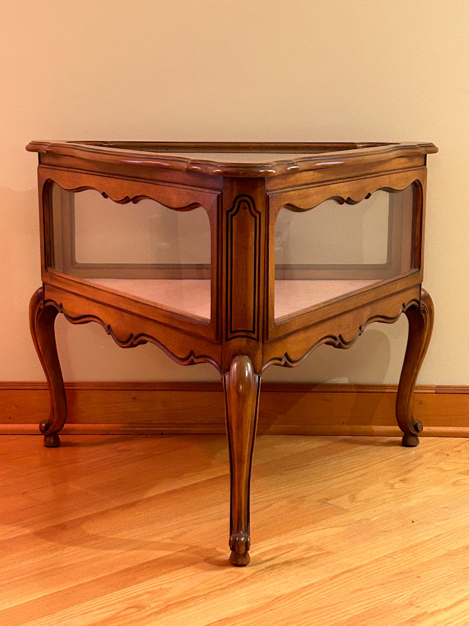 French provincial style display case, triangle shape, lift top, Cabriole legs. 24x28x31 inches
