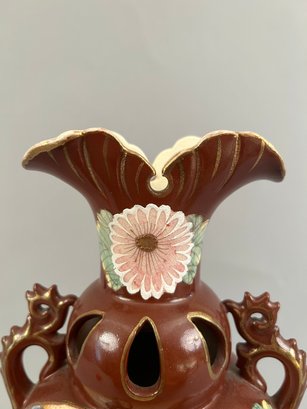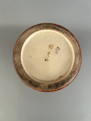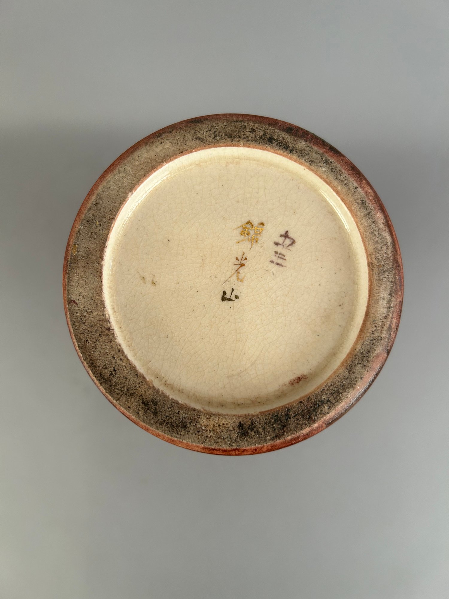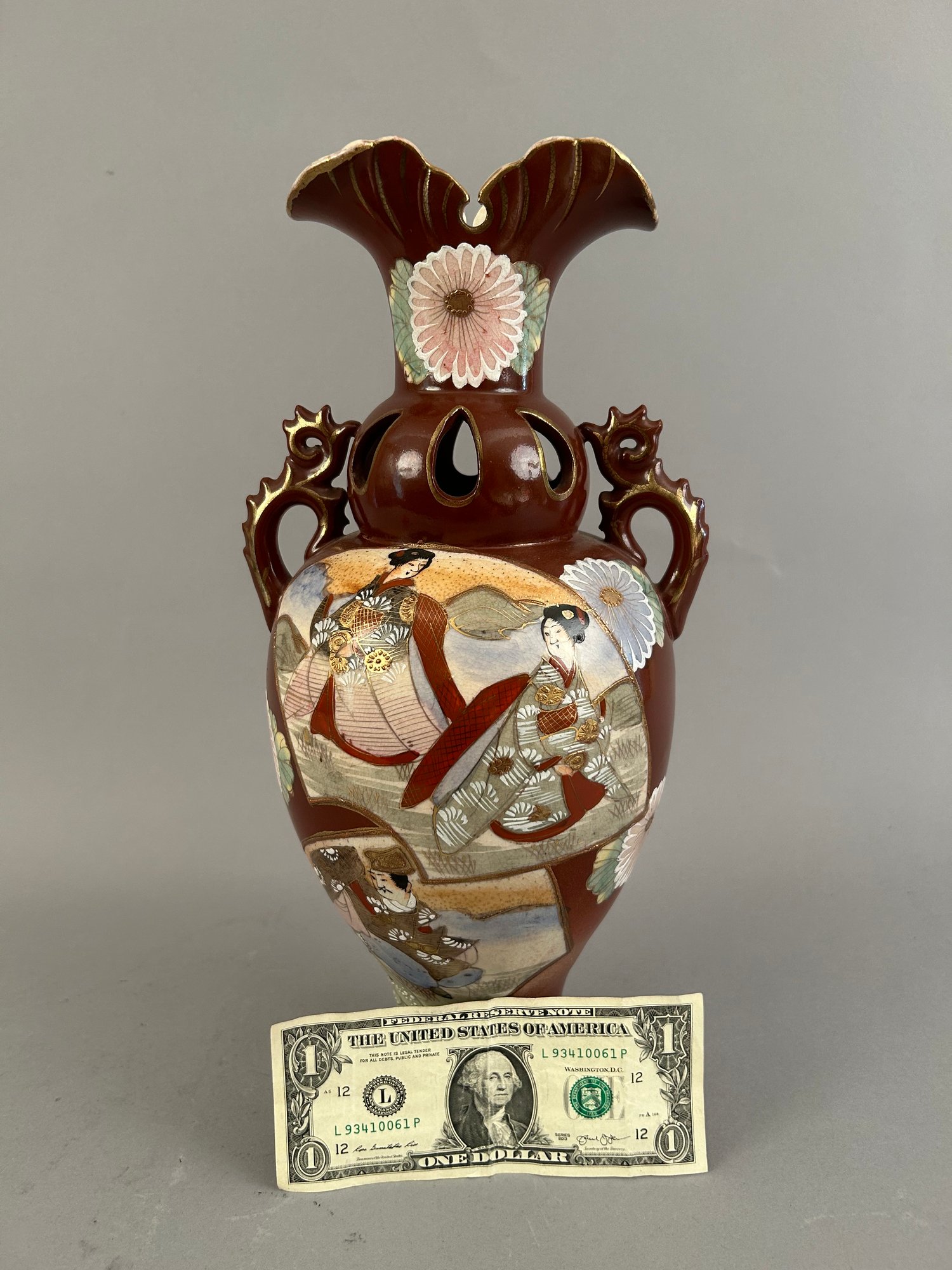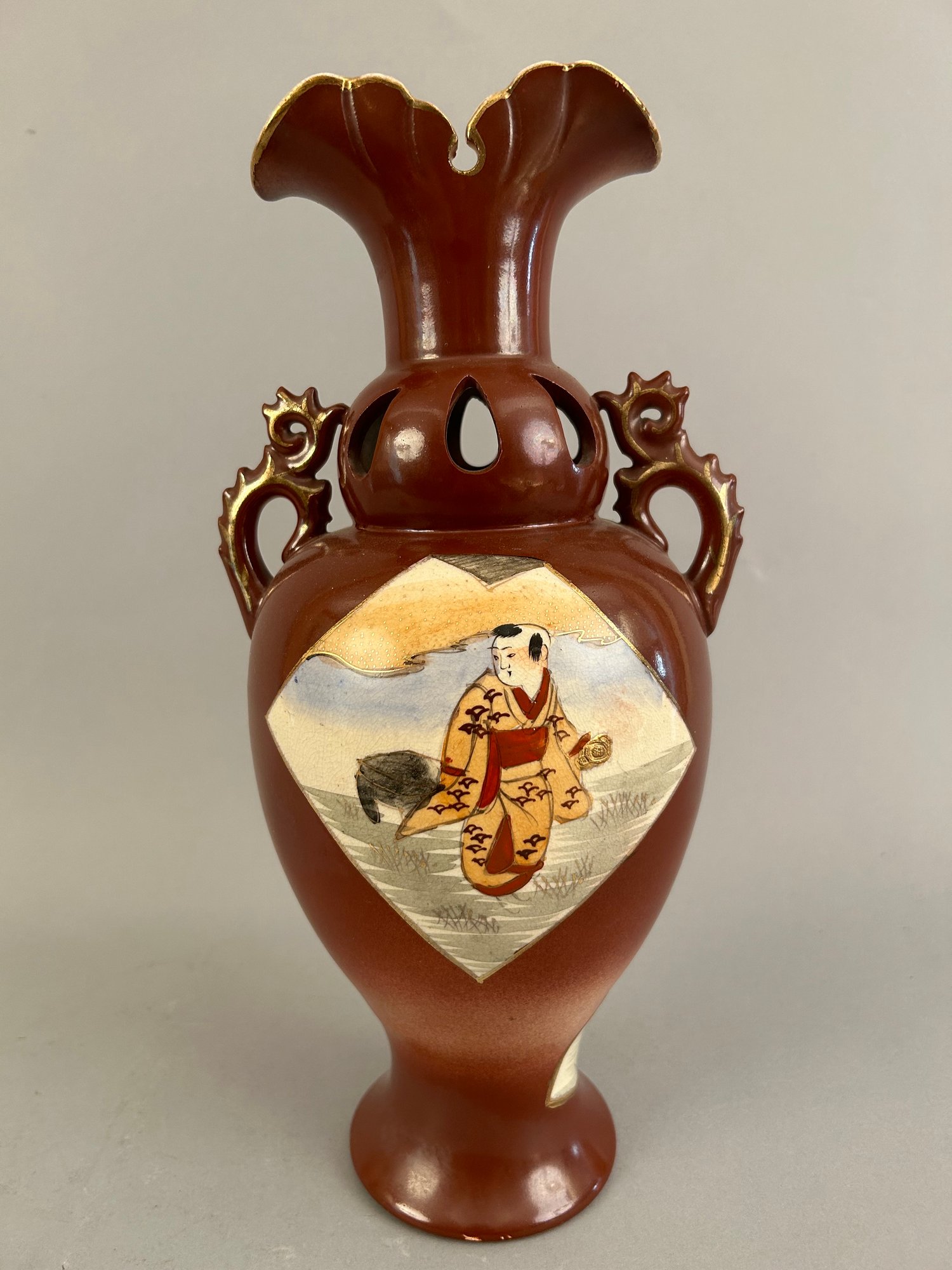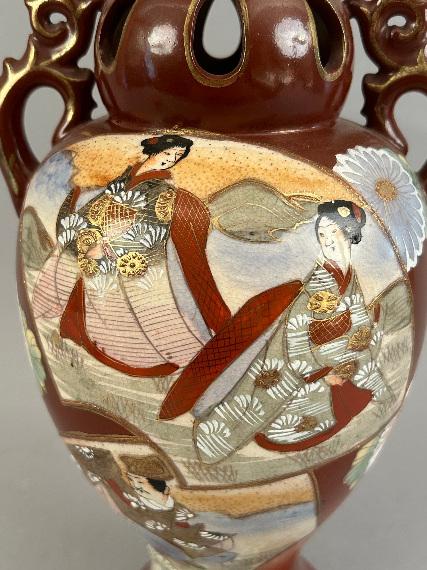 Japanese Satsuma two handled vase with figures and gold embellishments. Marked on the bottom.
