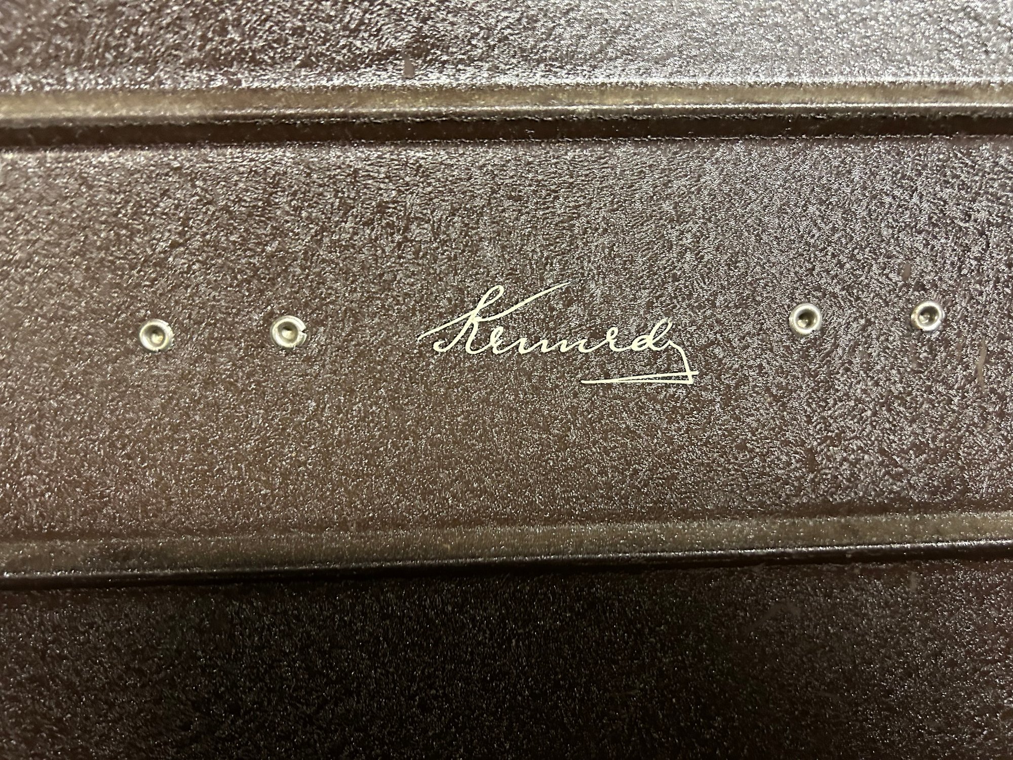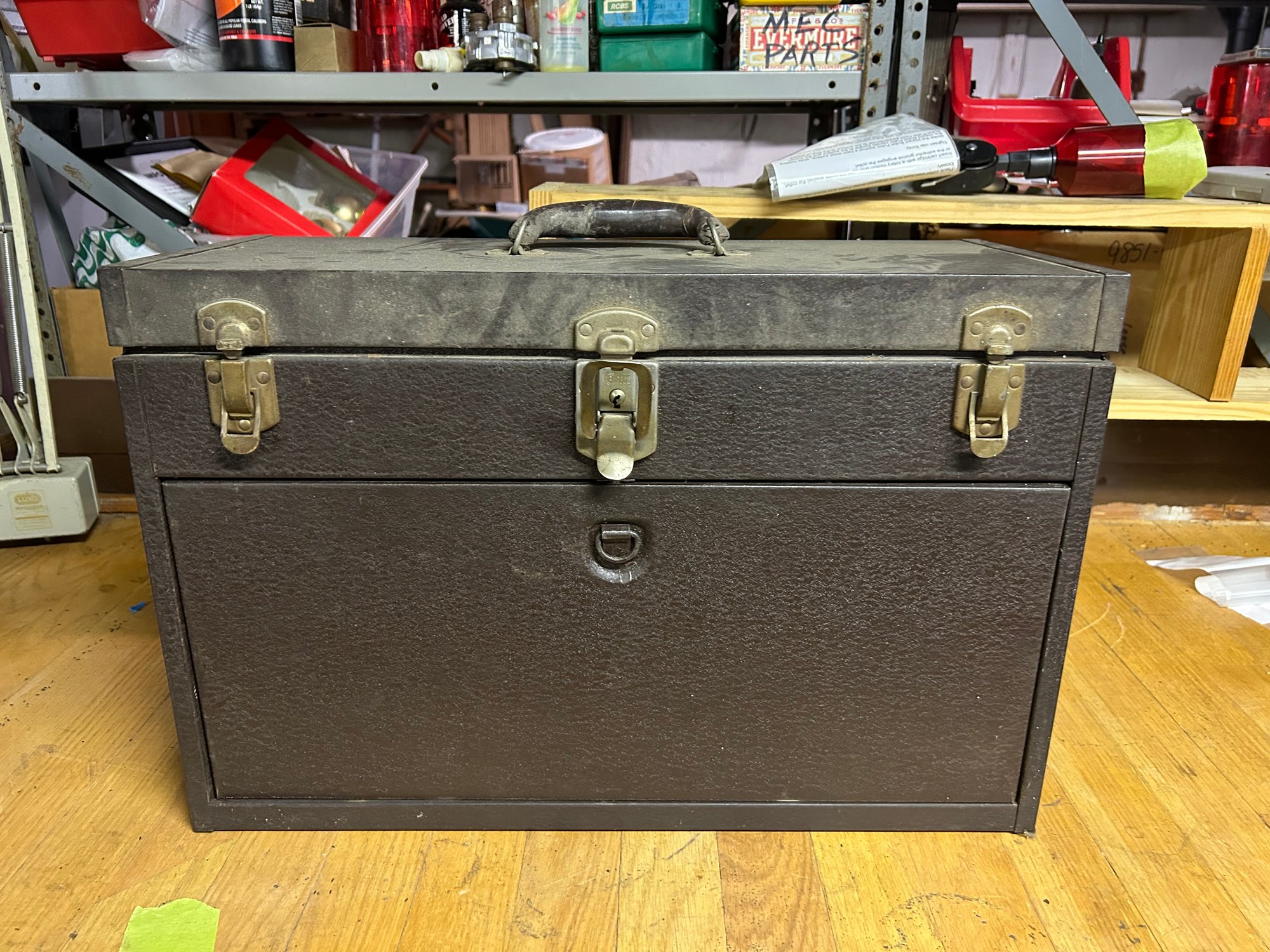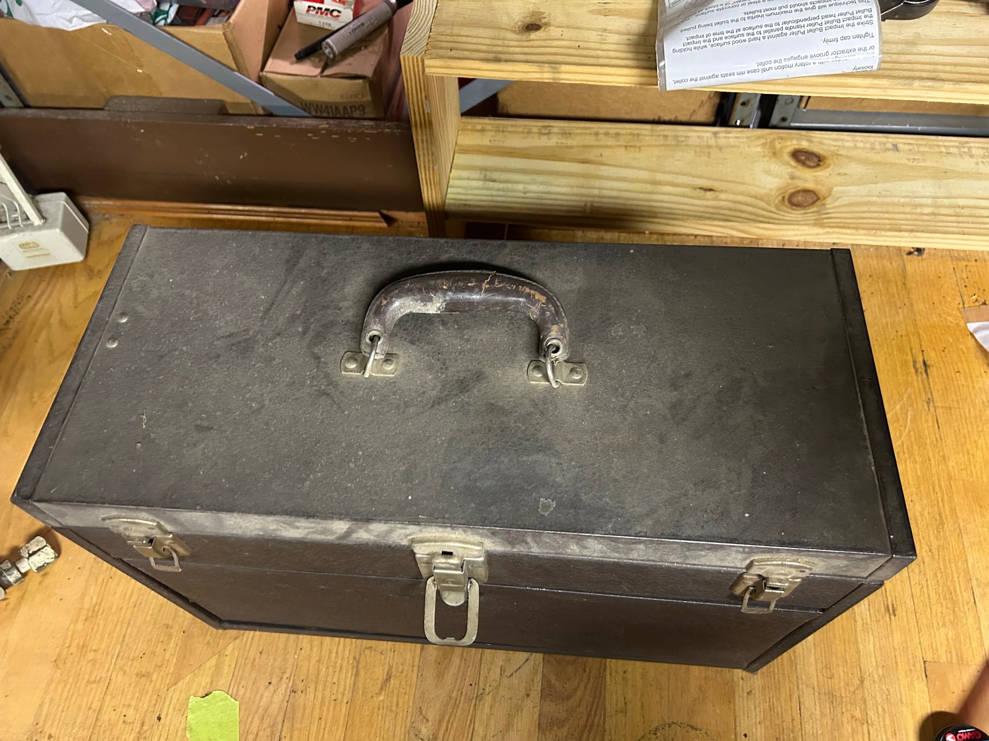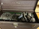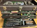 Mechanics tool chest Kennedy includes contents, metal with original leather handle 20 1/4” x 8 1/2” x 13 1/2”