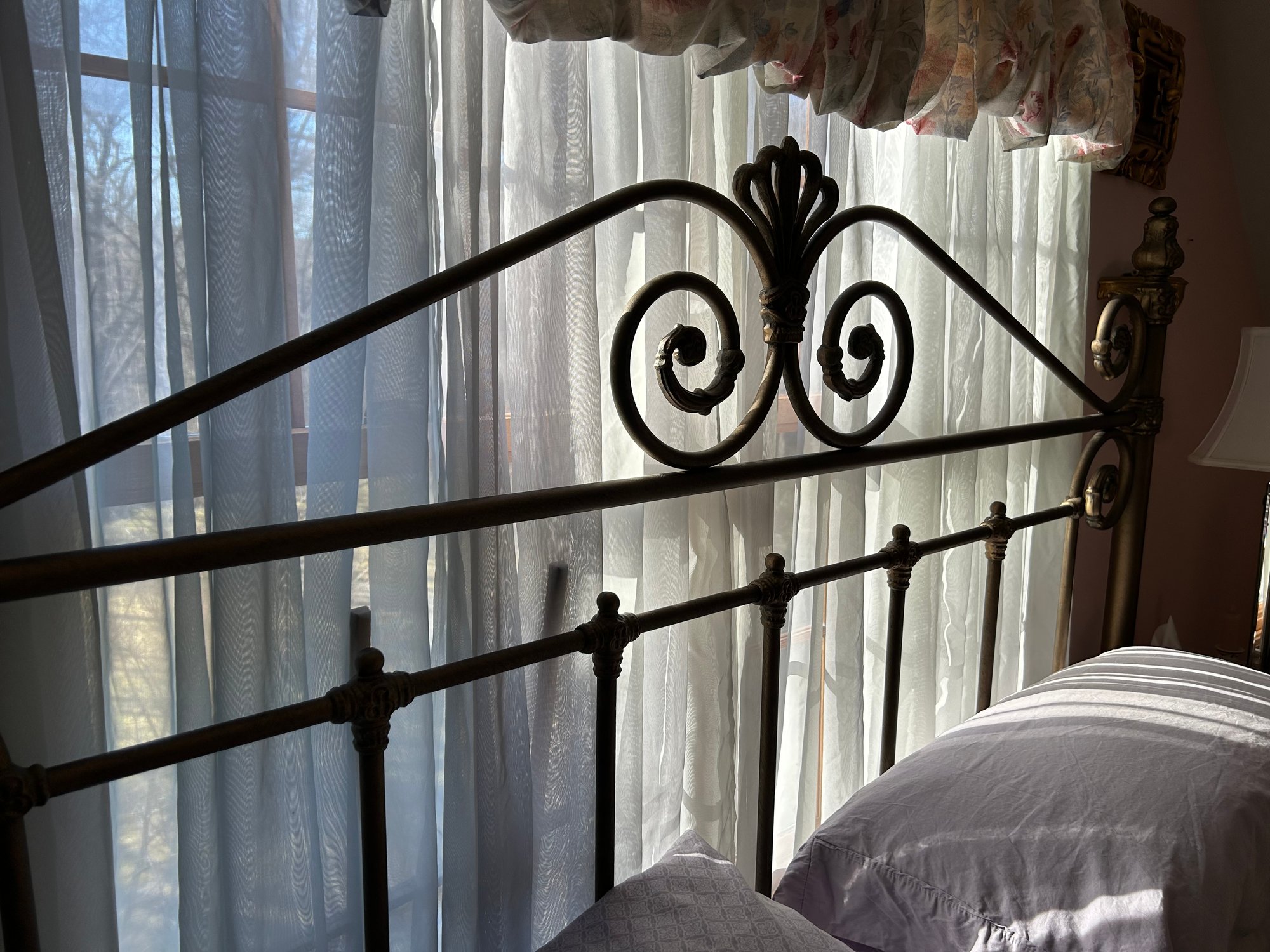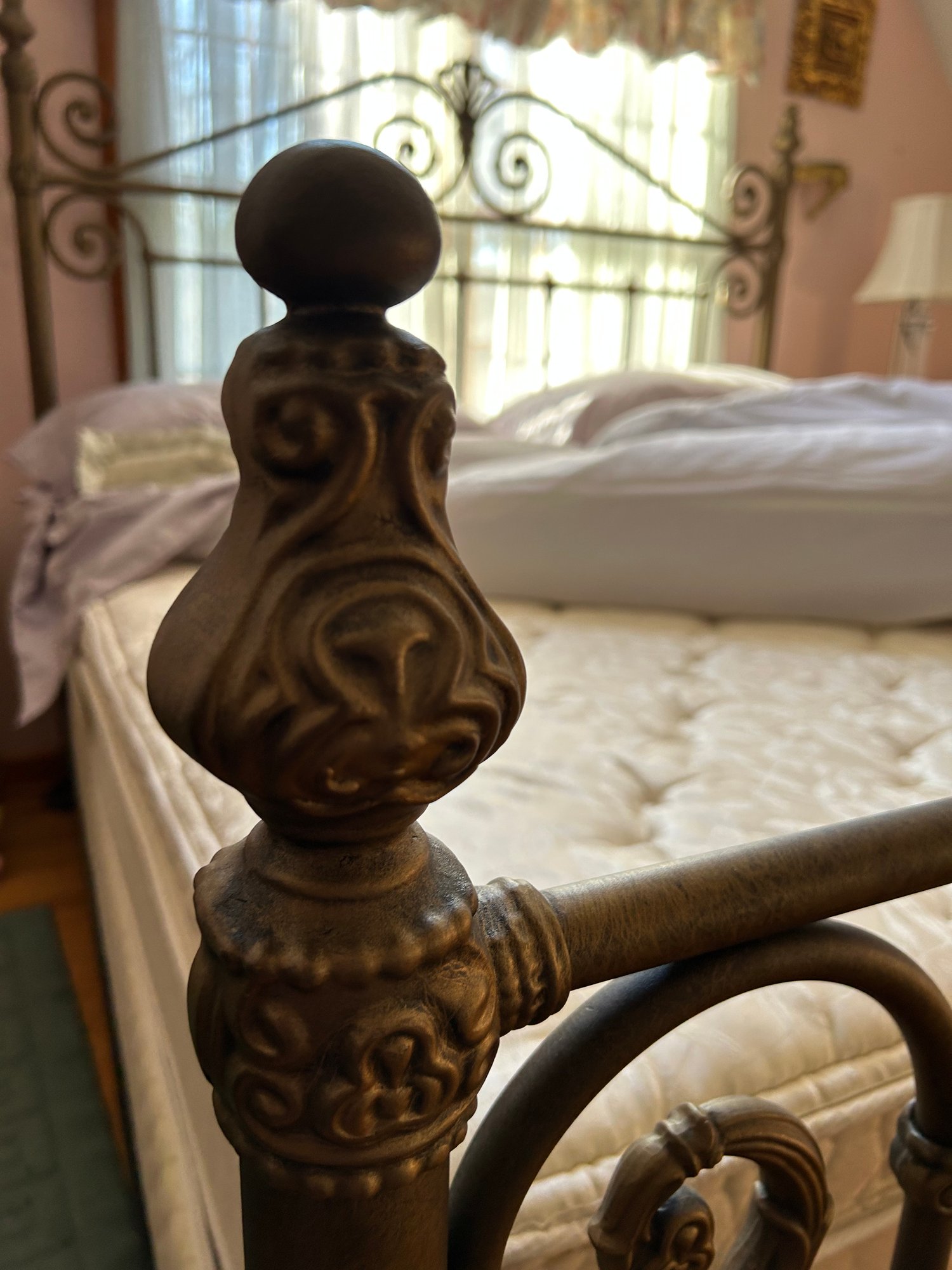 King size bed iron frame painted brass color. Serta perfect sleeper mattress and box spring
