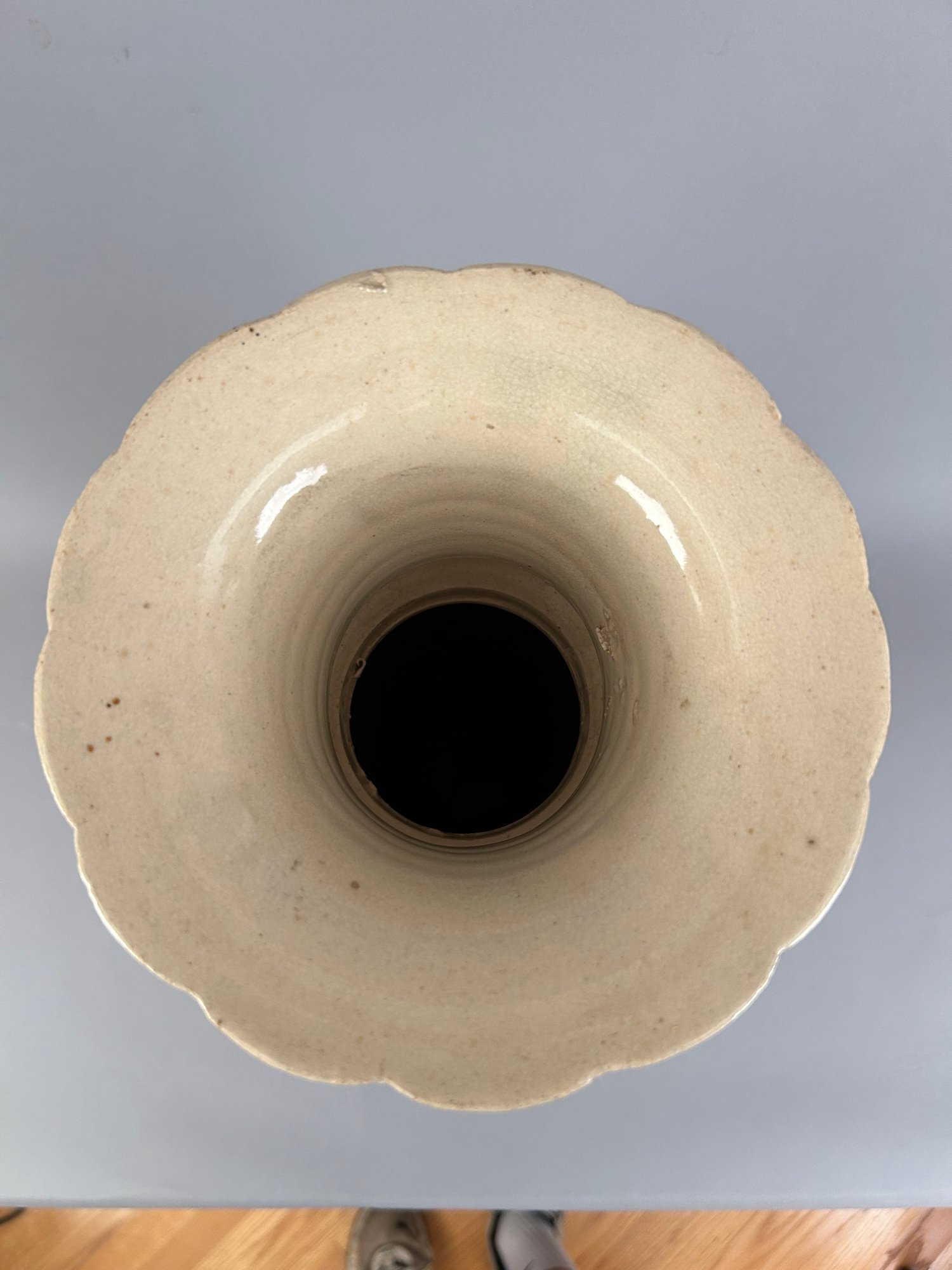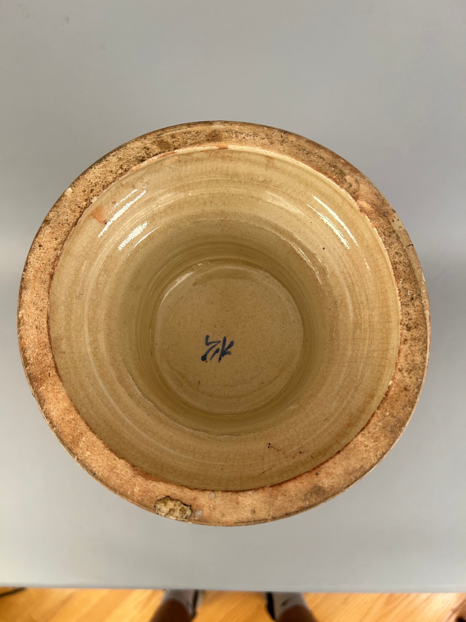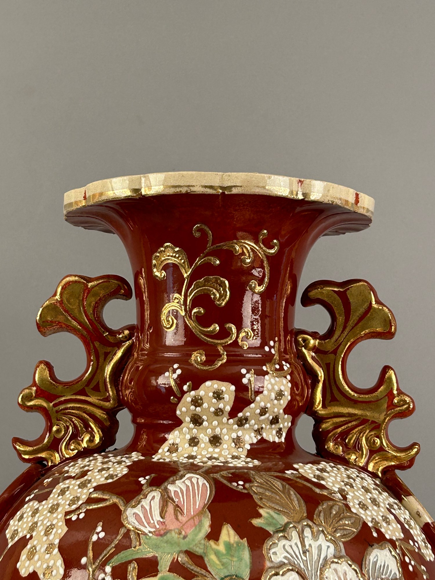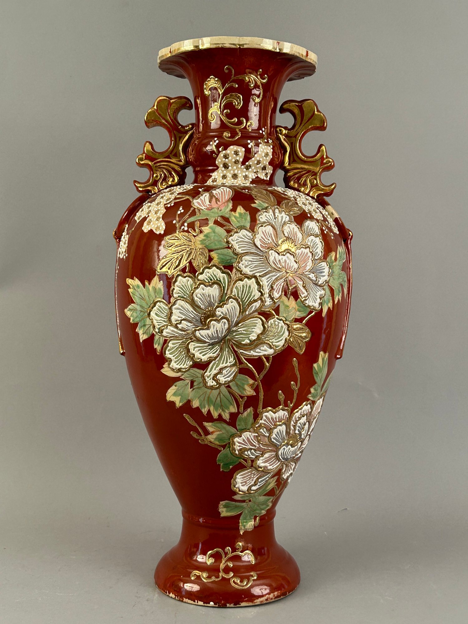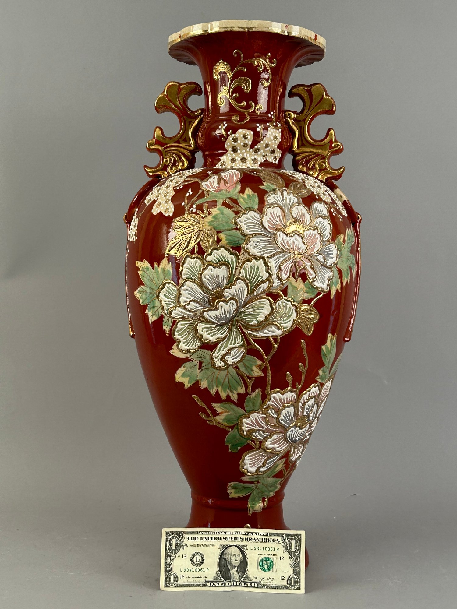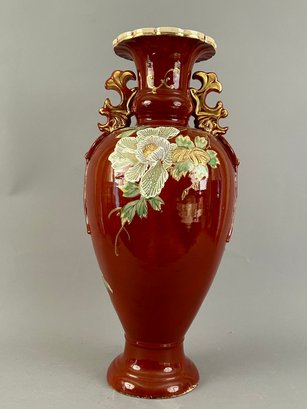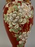 Large Asian floor vase with Moriage flowers. Marked on the bottom.