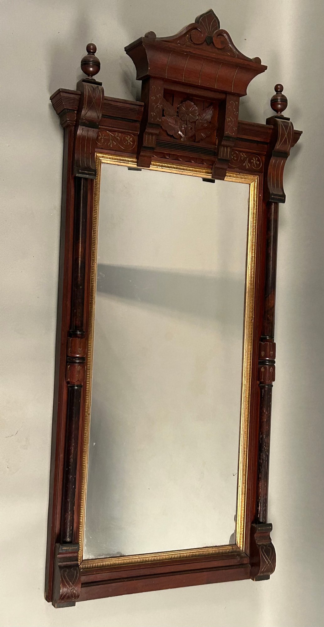 Large ornate Victorian mirror. carved flower medallion, finials and carved details
