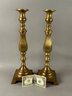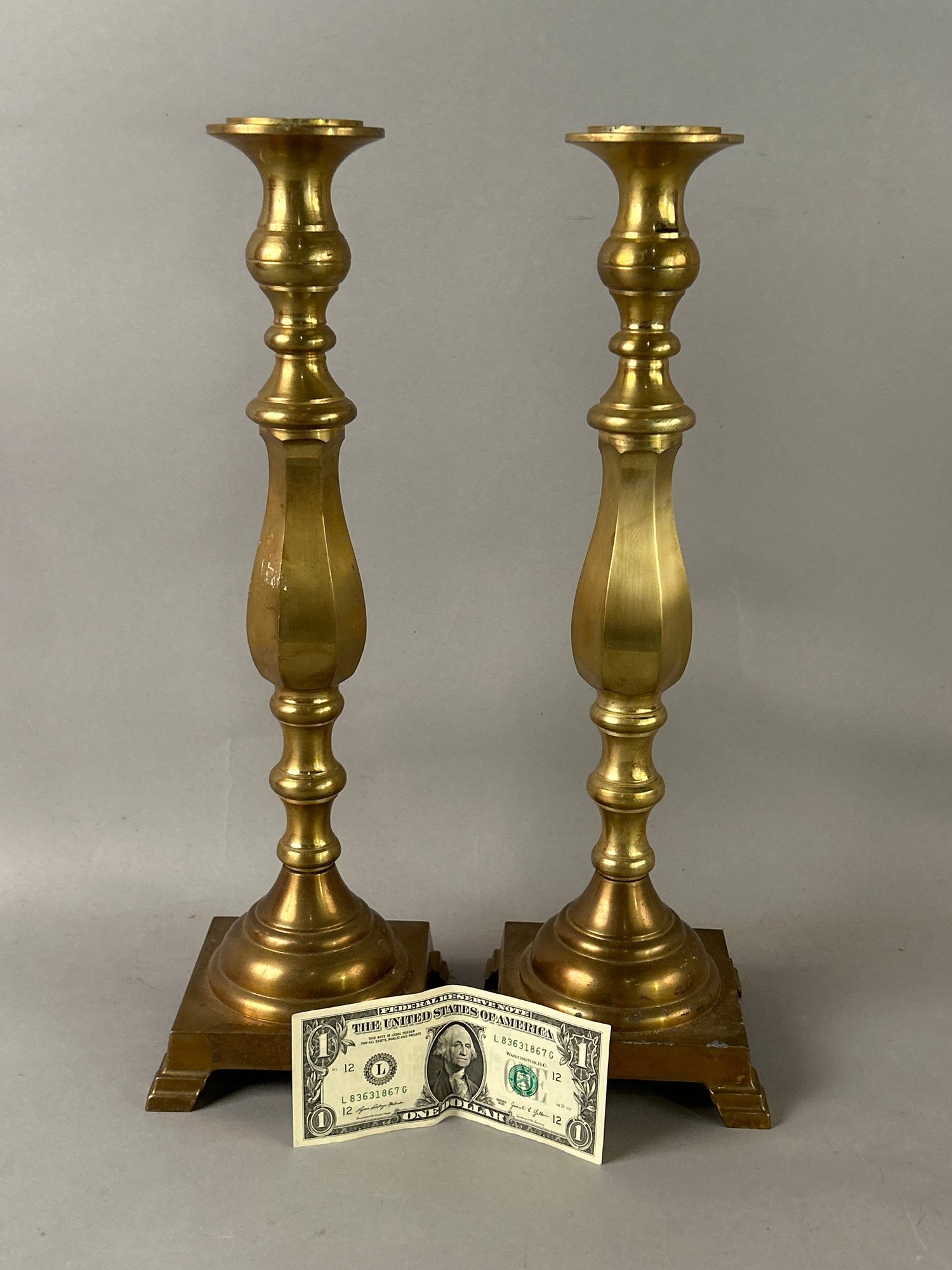 Large brass candlesticks with square base finally turned on 4 feet 17 1/2 inches tall