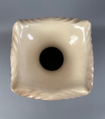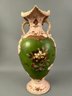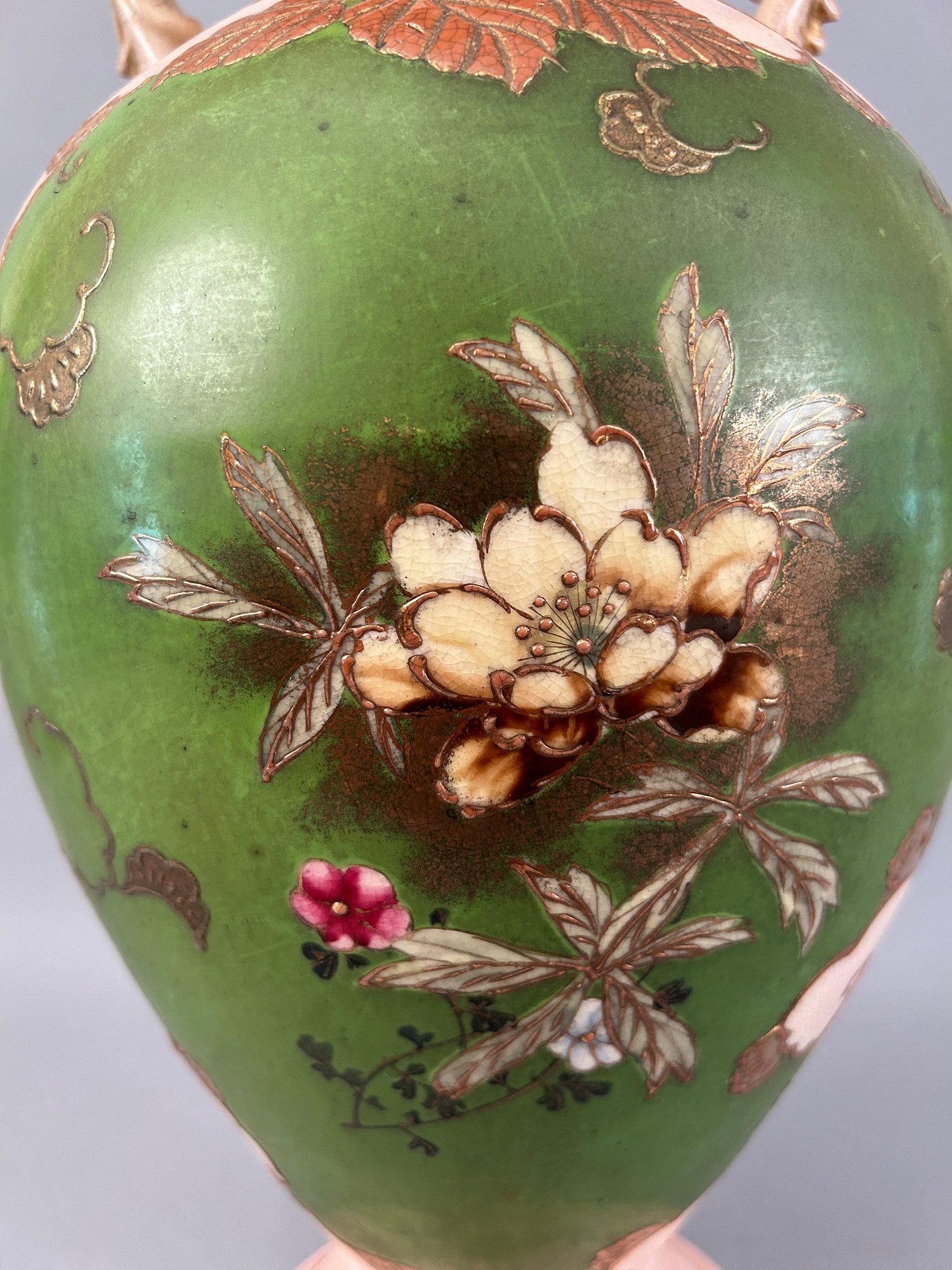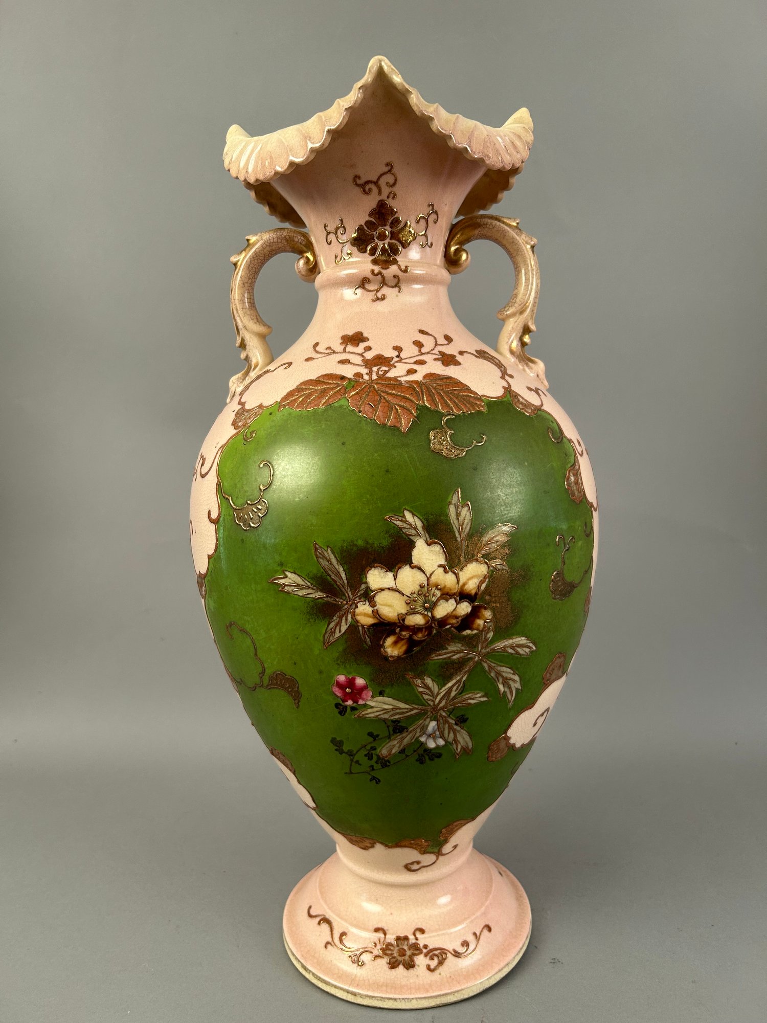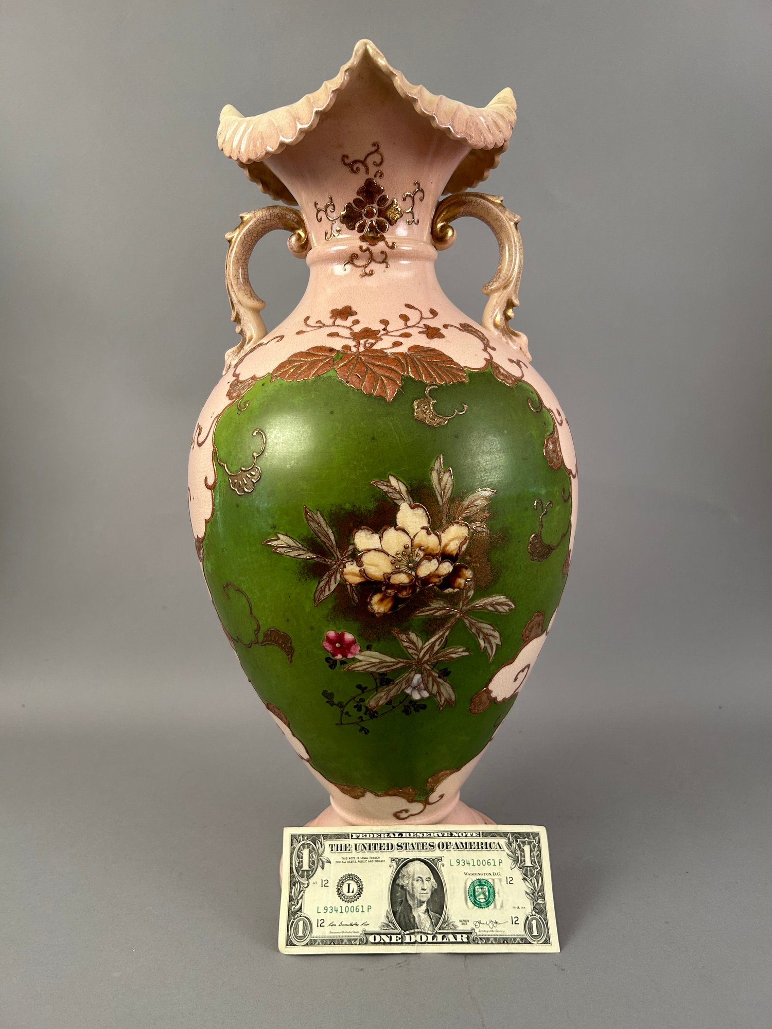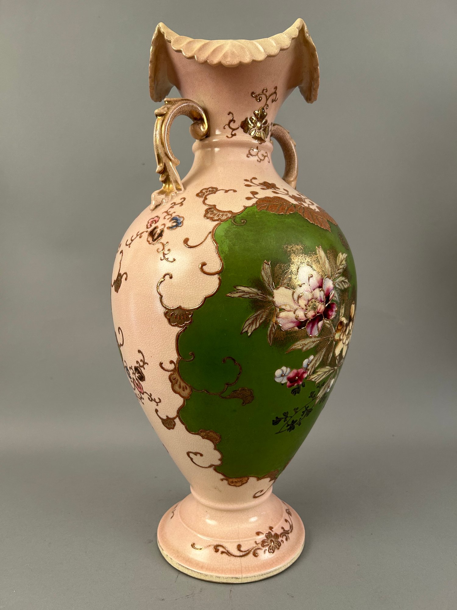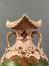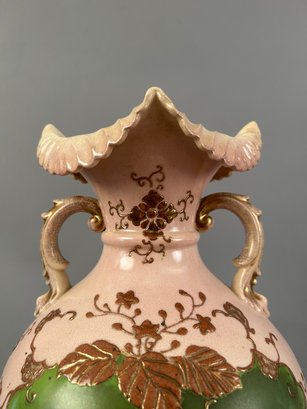 Large pink two handled floral vase with raised accents and gold details. Marks on bottom.
