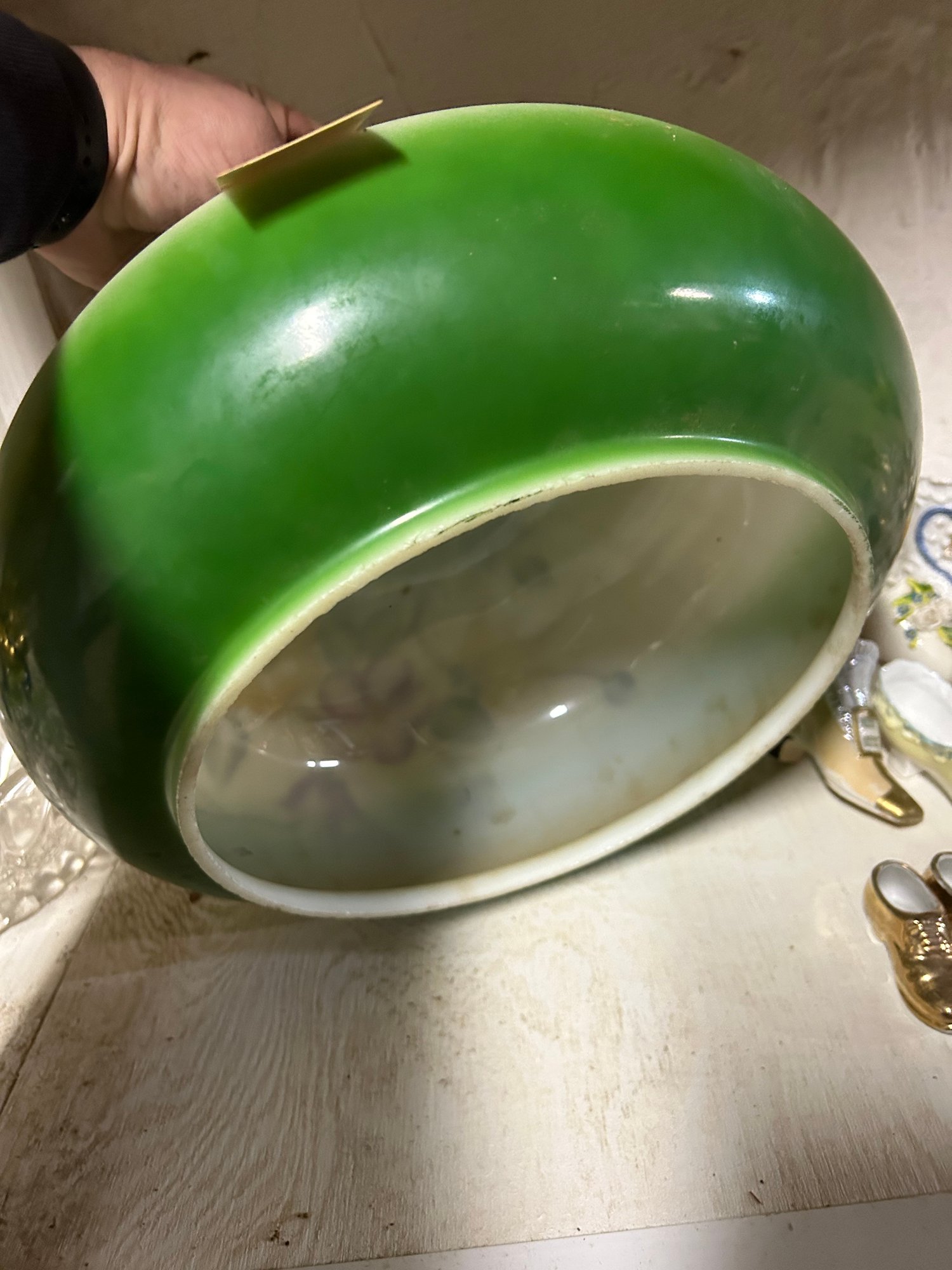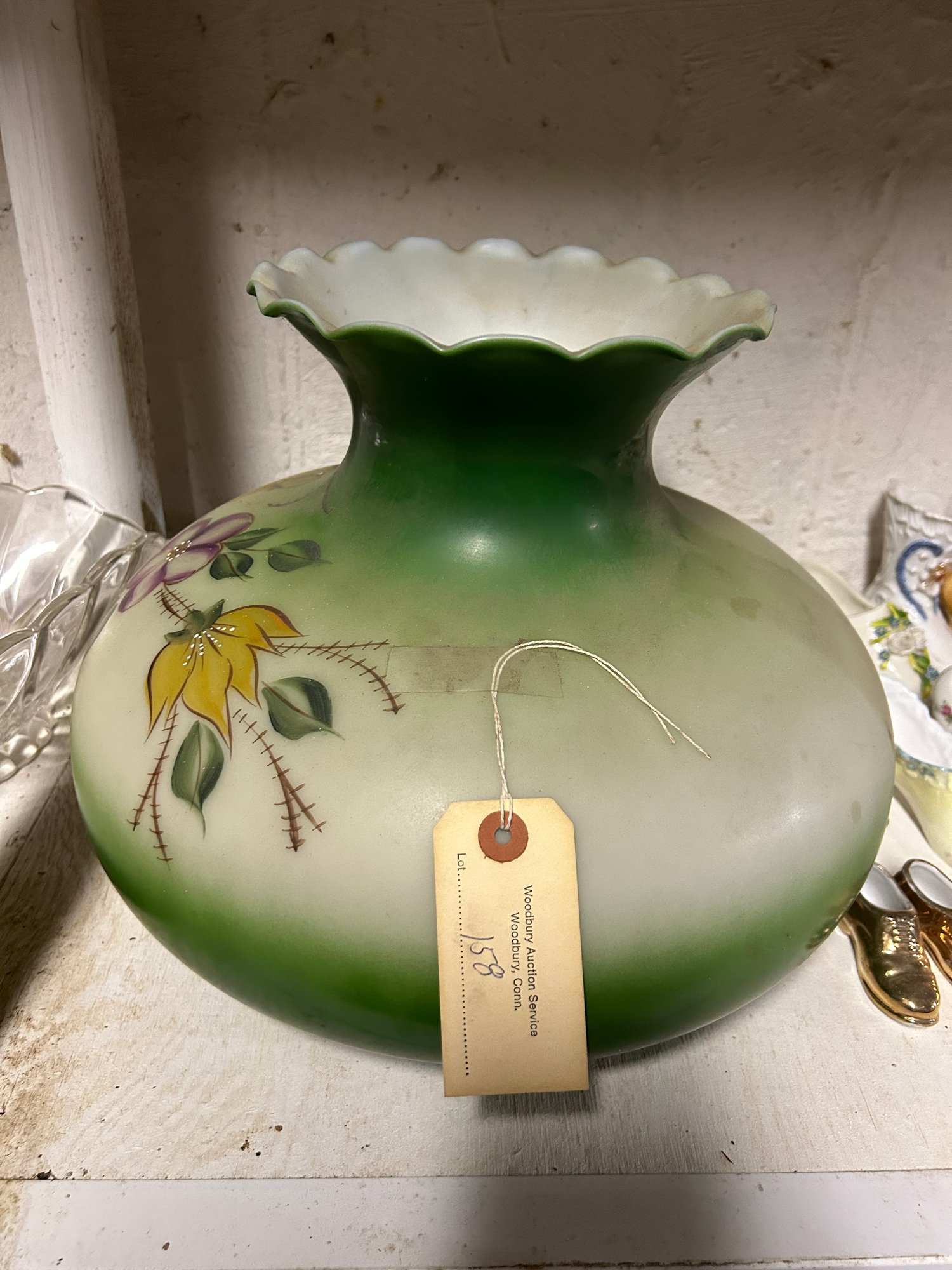 Large size Victorian paint decorated glass shade. Rim 9 1/4 inches 14 inch diameter 10 inches tall.
