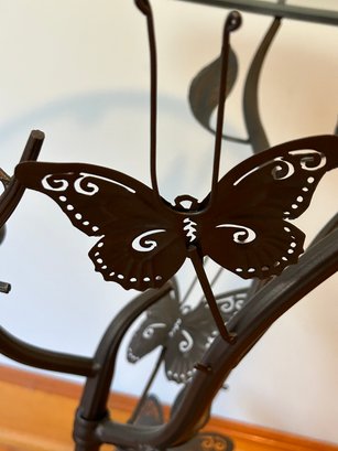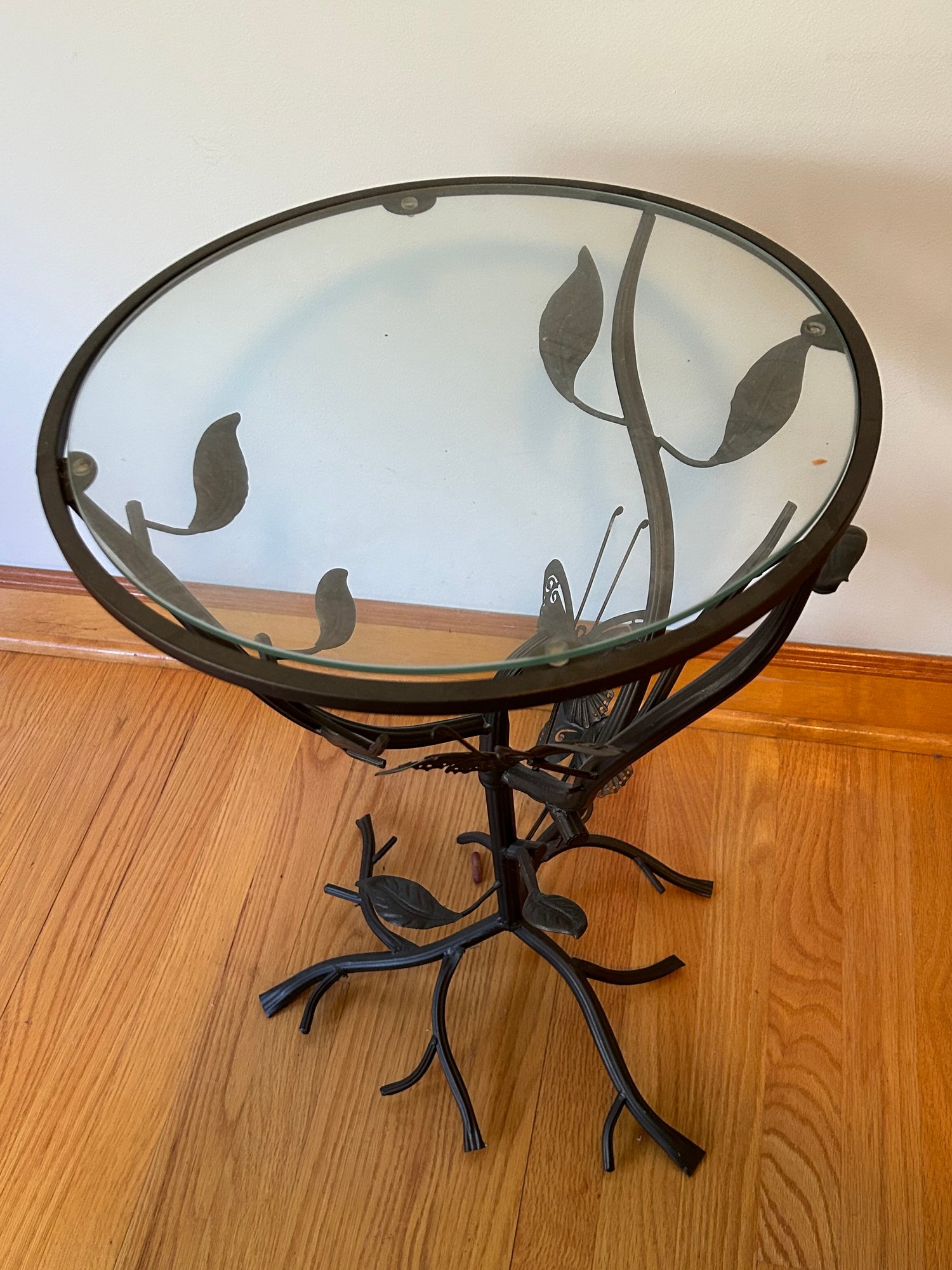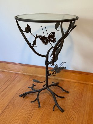 Occasional table metal with butterflies, leaves and tree branches. Glass top 16 inch diameter 24 inches tall.