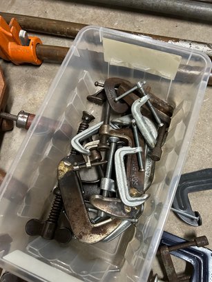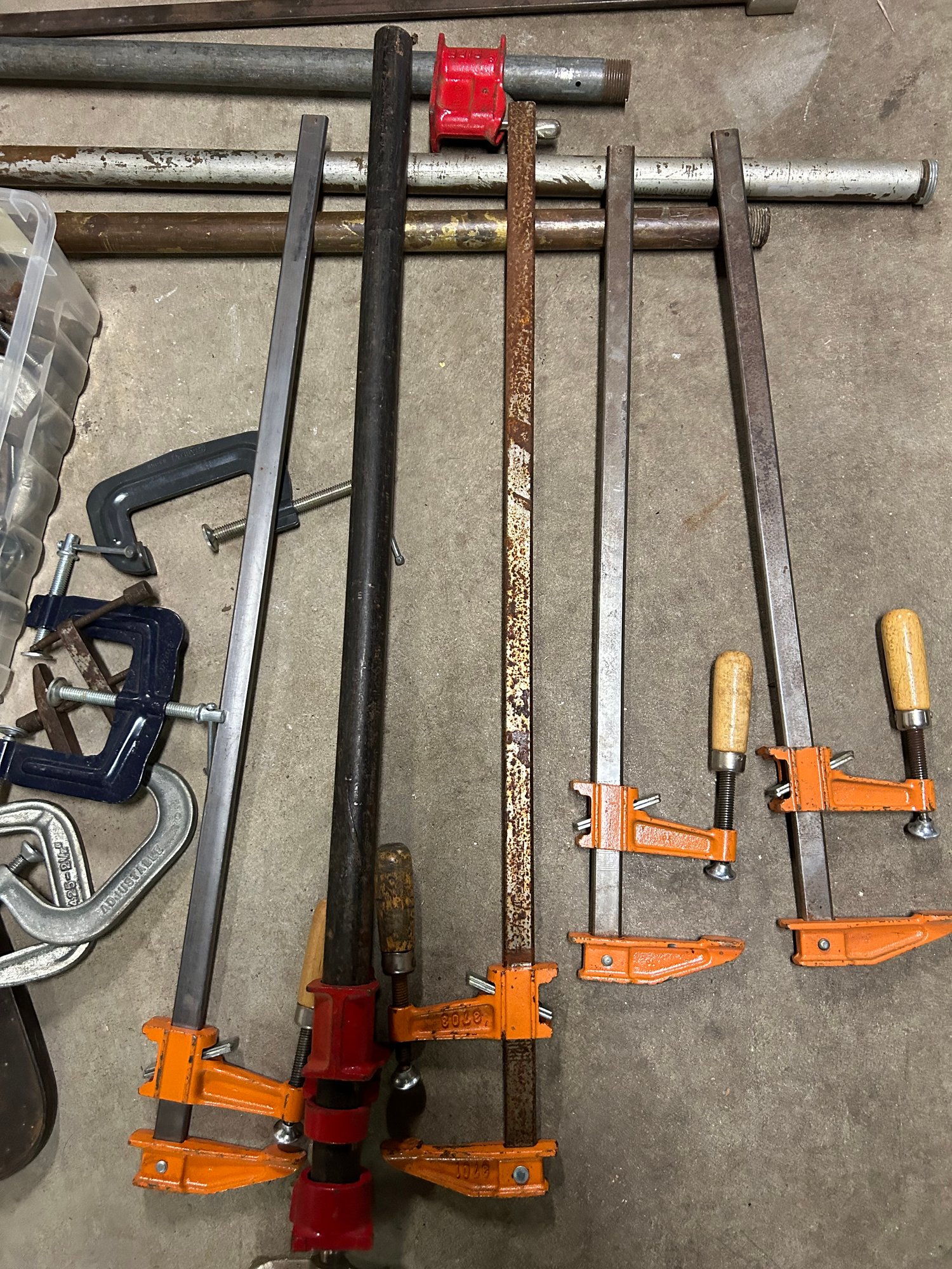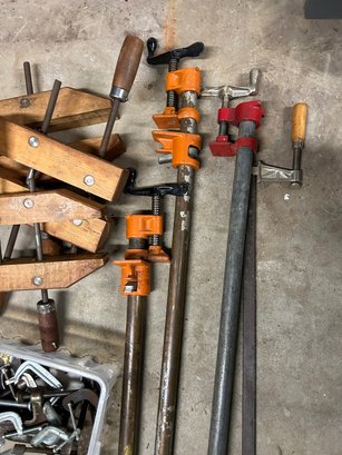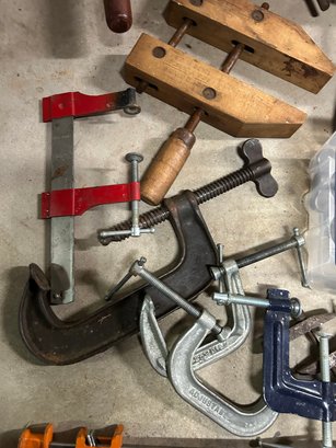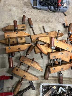 Lot of clamps, vintage and modern. Wooden clamps, metal clamps, etc. 30+ pieces.