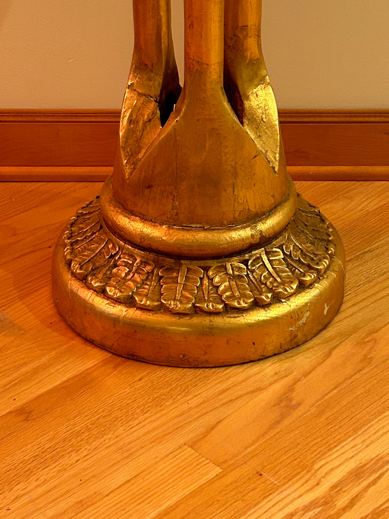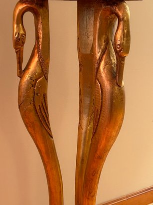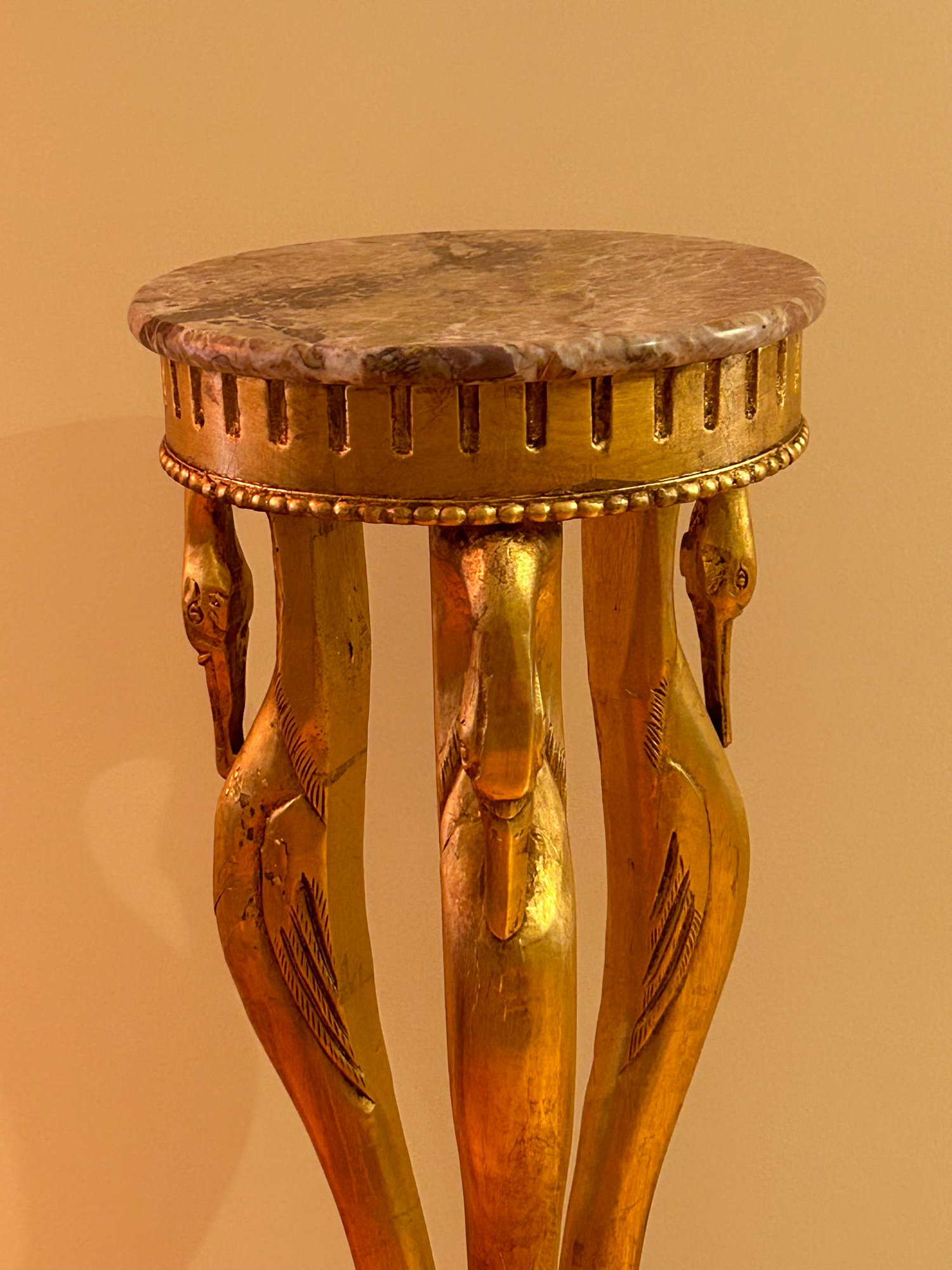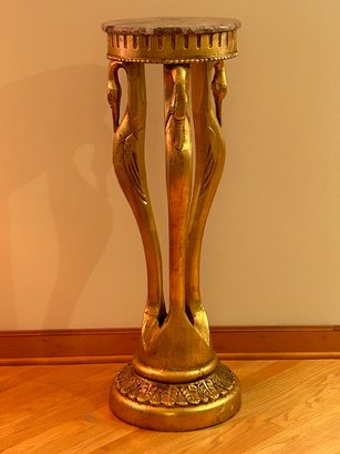 Marble top pedestal with egret design. Gold painted surface. Very good condition contemporary 42x14 inches