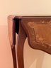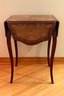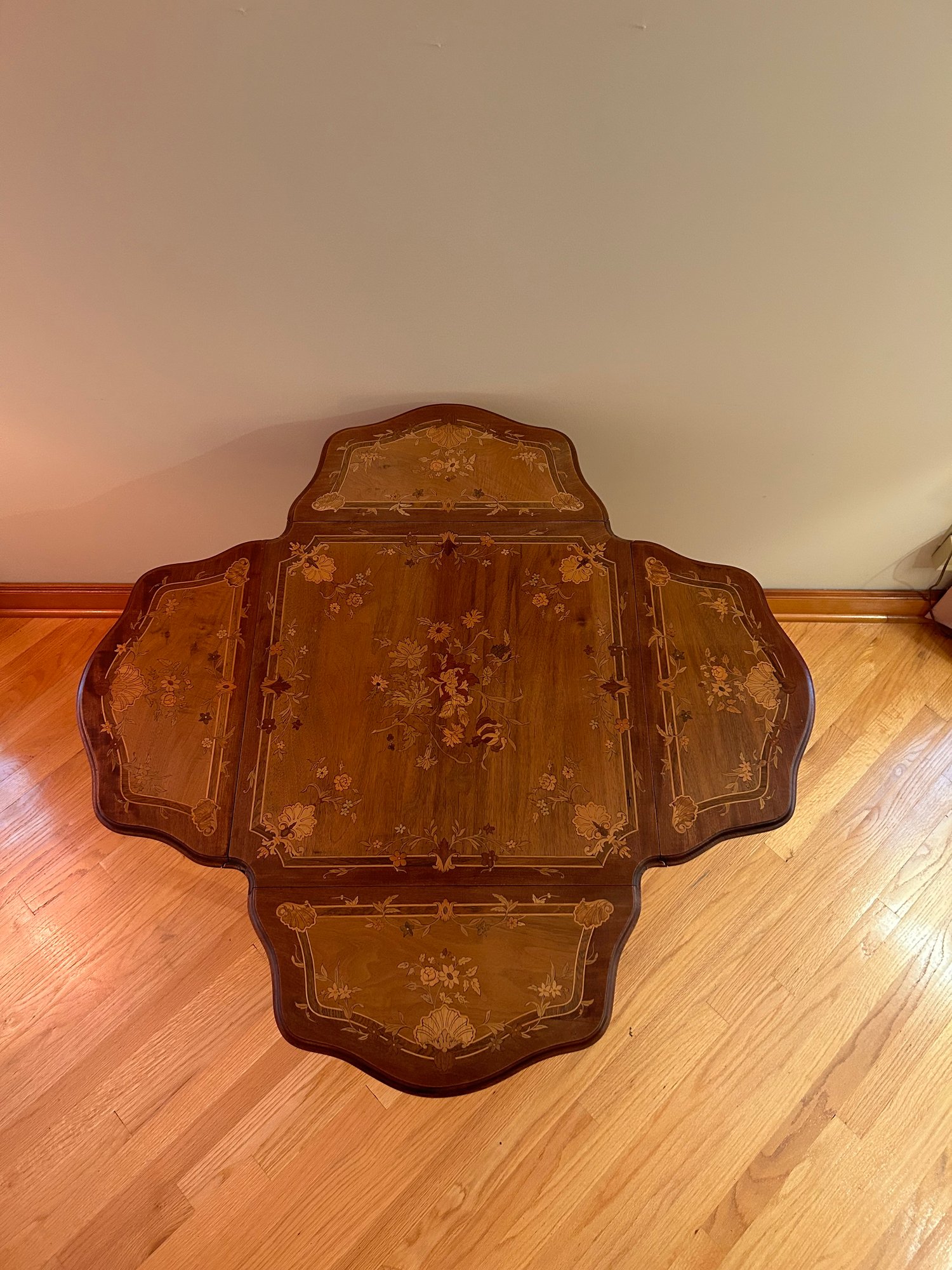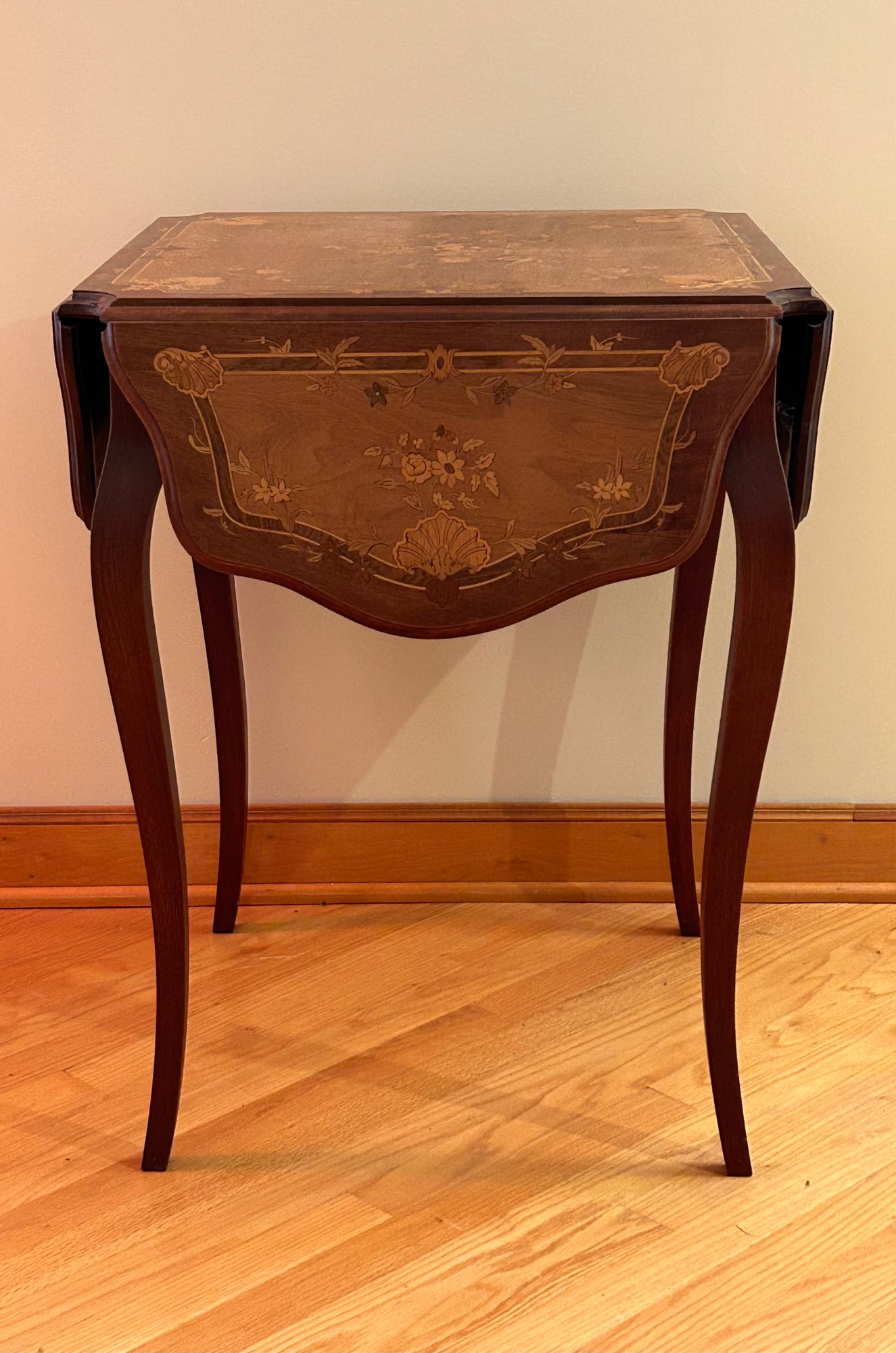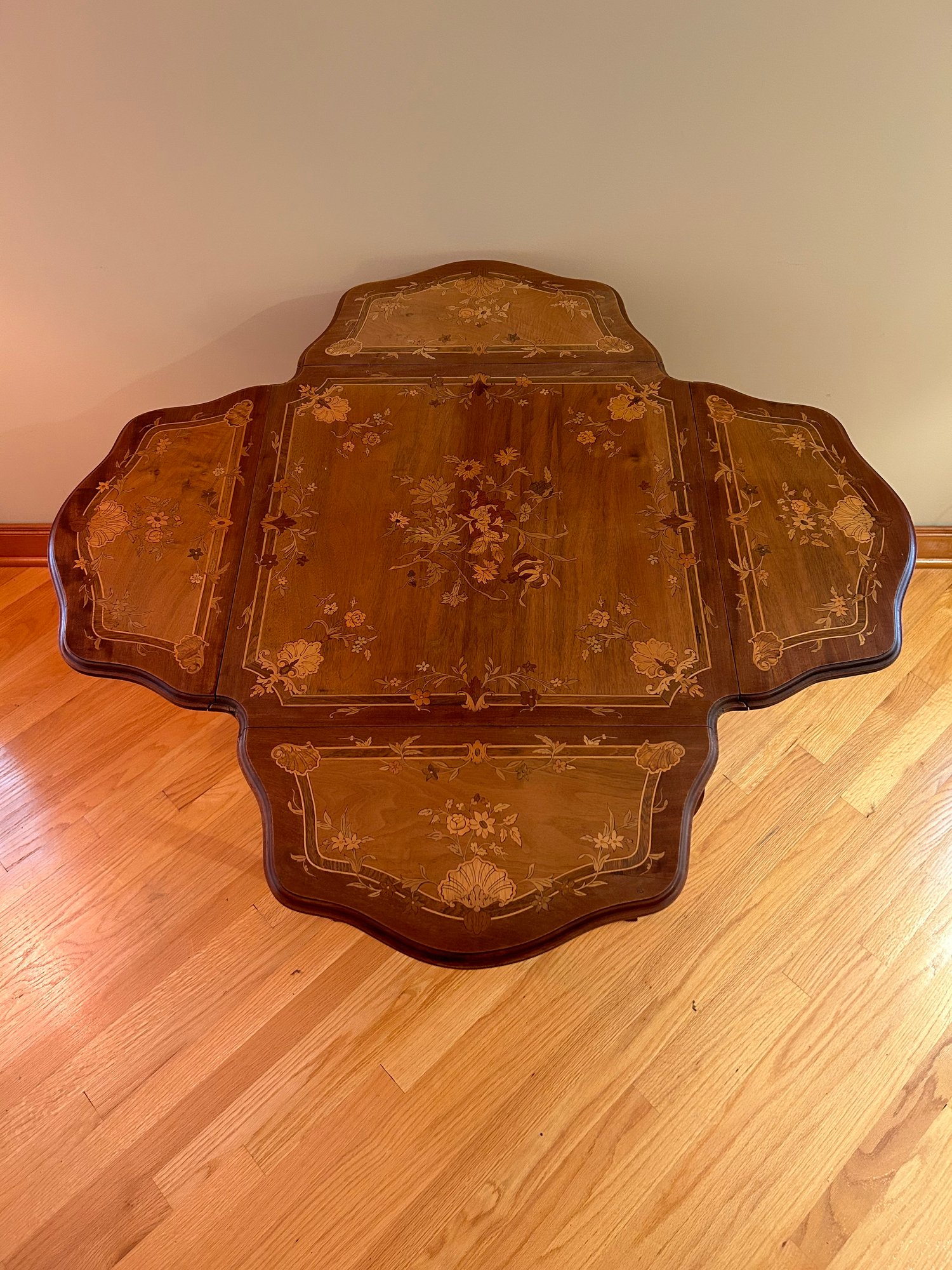 Marquetry inlaid occasional table with drop leaves. Floral decoration and light on top and leaves. Cabriole legs refinished 29x23.5x23.5 inches open 29x43.5x43.5 inches