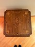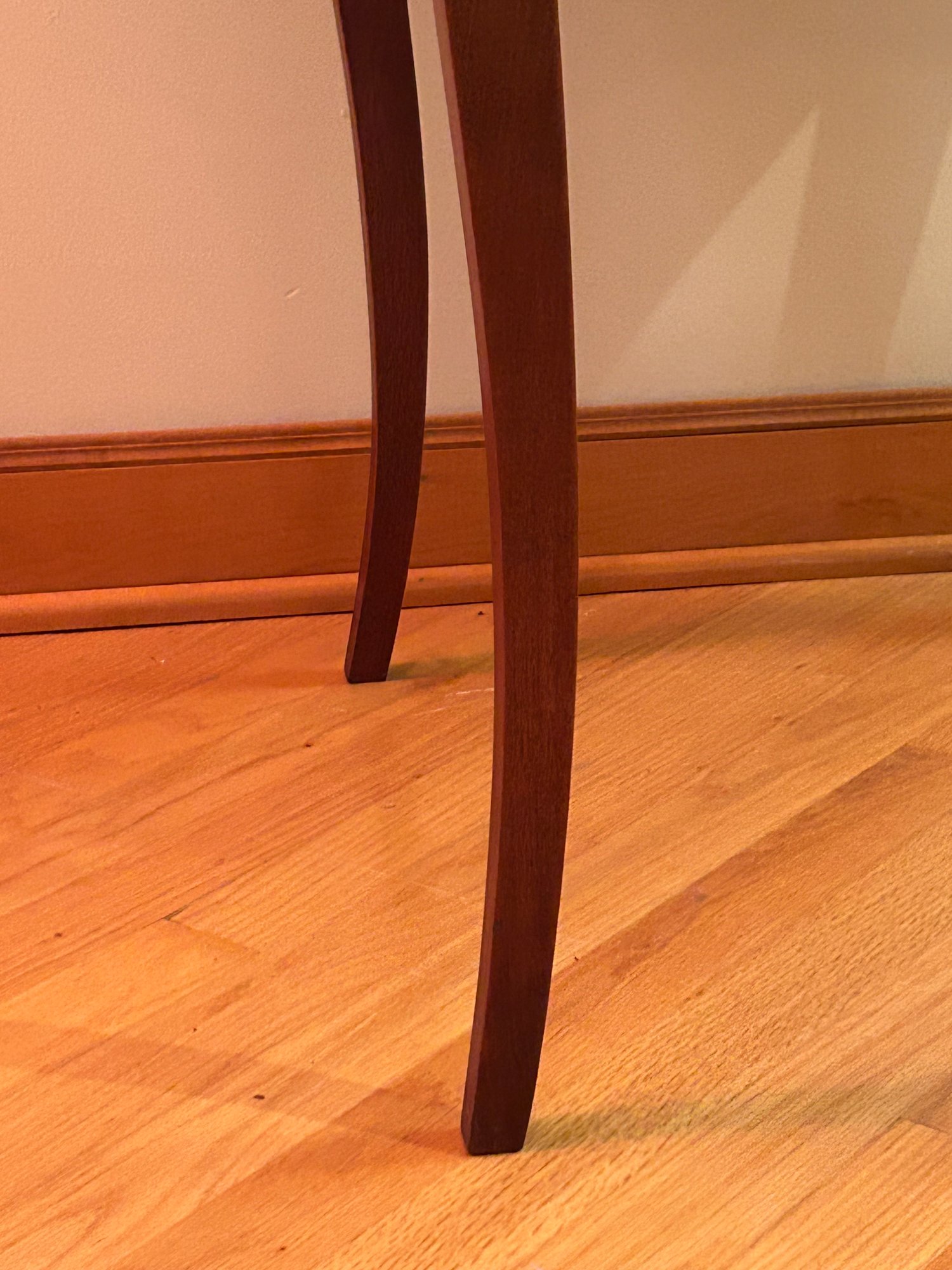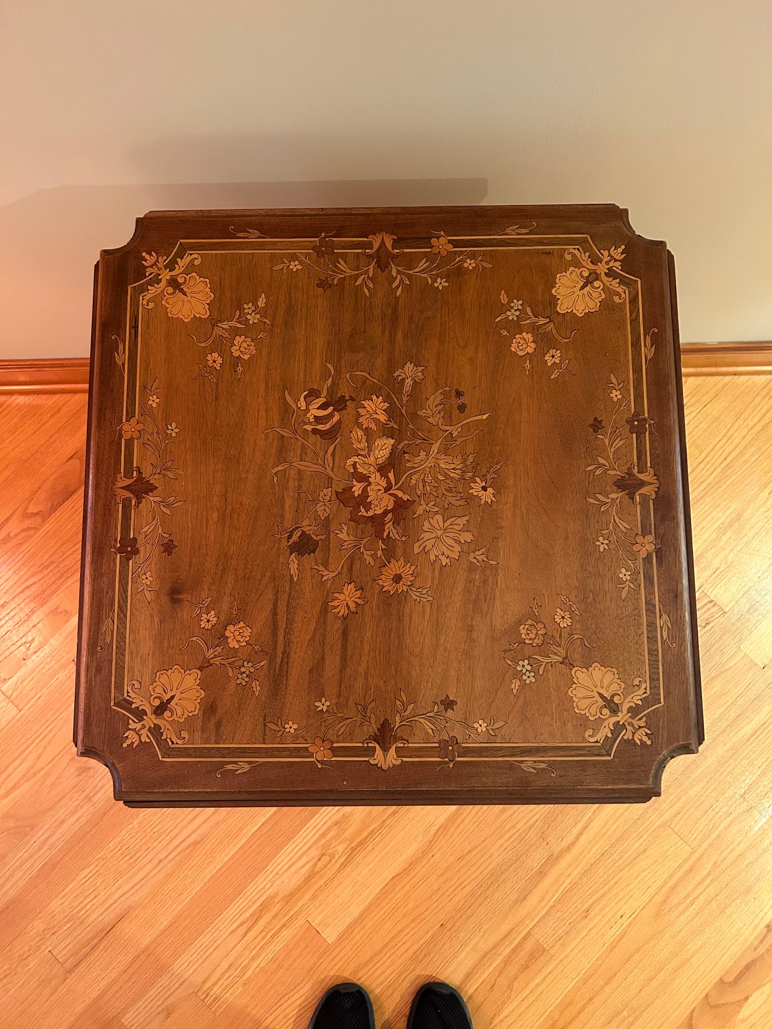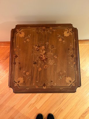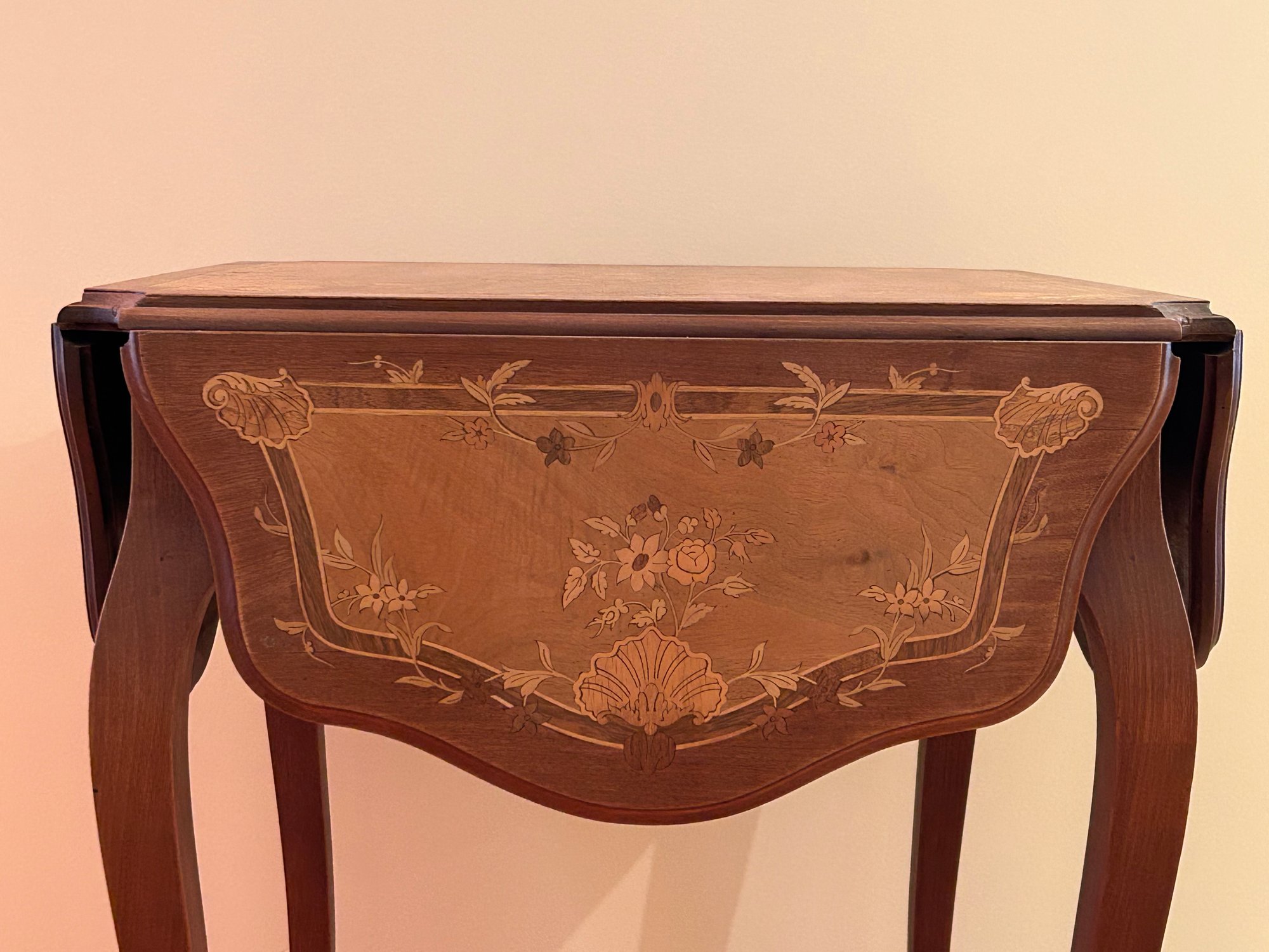 Marquetry inlaid occasional table with drop leaves. Floral decoration and light on top and leaves. Cabriole legs refinished 29x23.5x23.5 inches open 29x43.5x43.5 inches