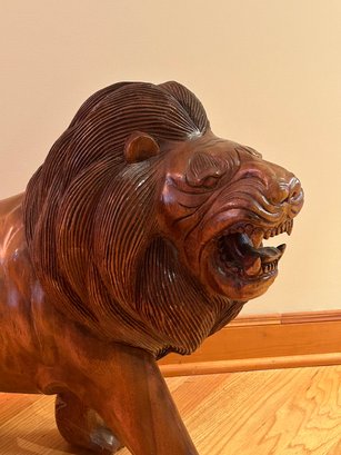 Massive carved lion sculpture. Carved from single piece of wood, great detail, 24x34x12 inches