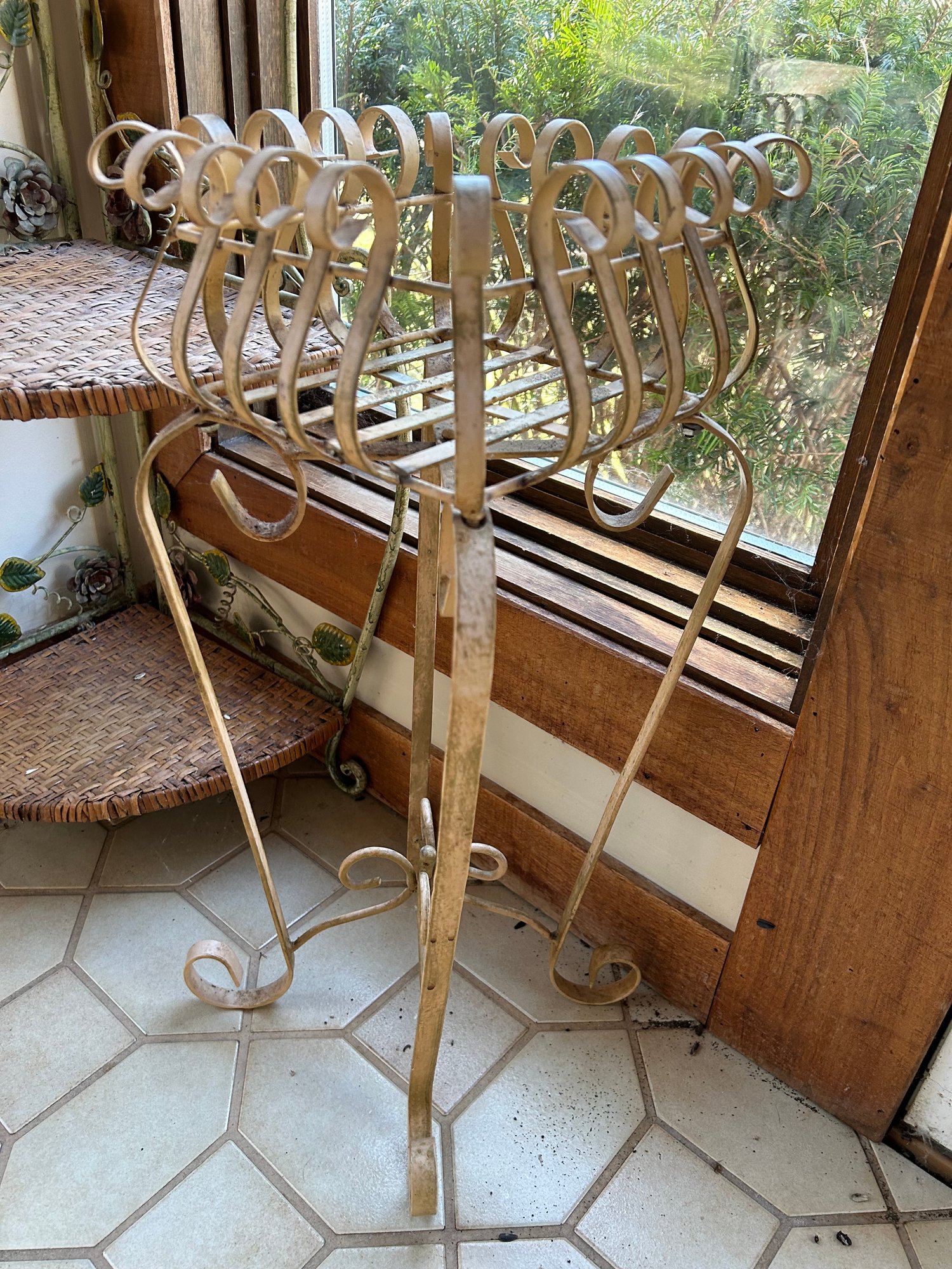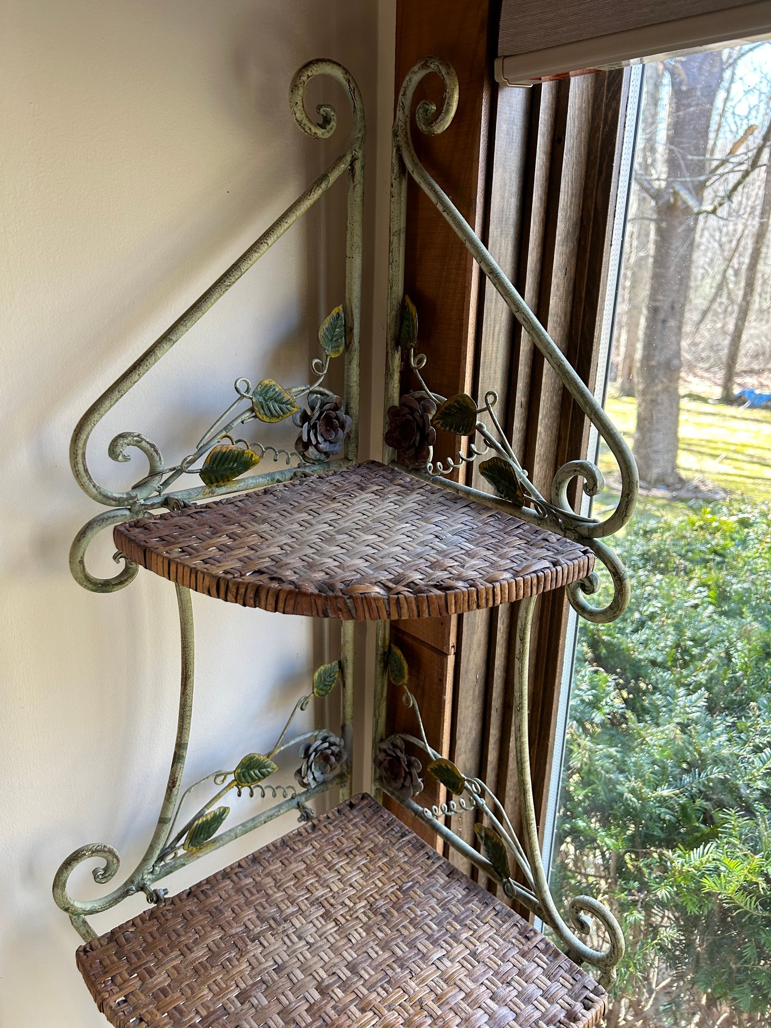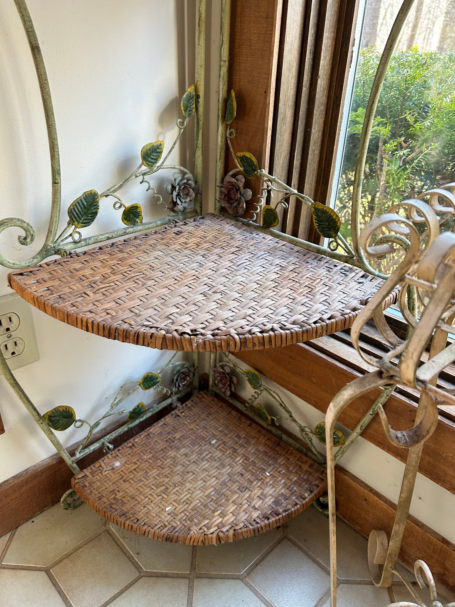 Metal and wicker corner shelf with small plant stand table. Corner shelf has floral design metal flowers with leaves. With folding shelves. Small table has scrolled legs and scroll design. Small planter 24 inches.