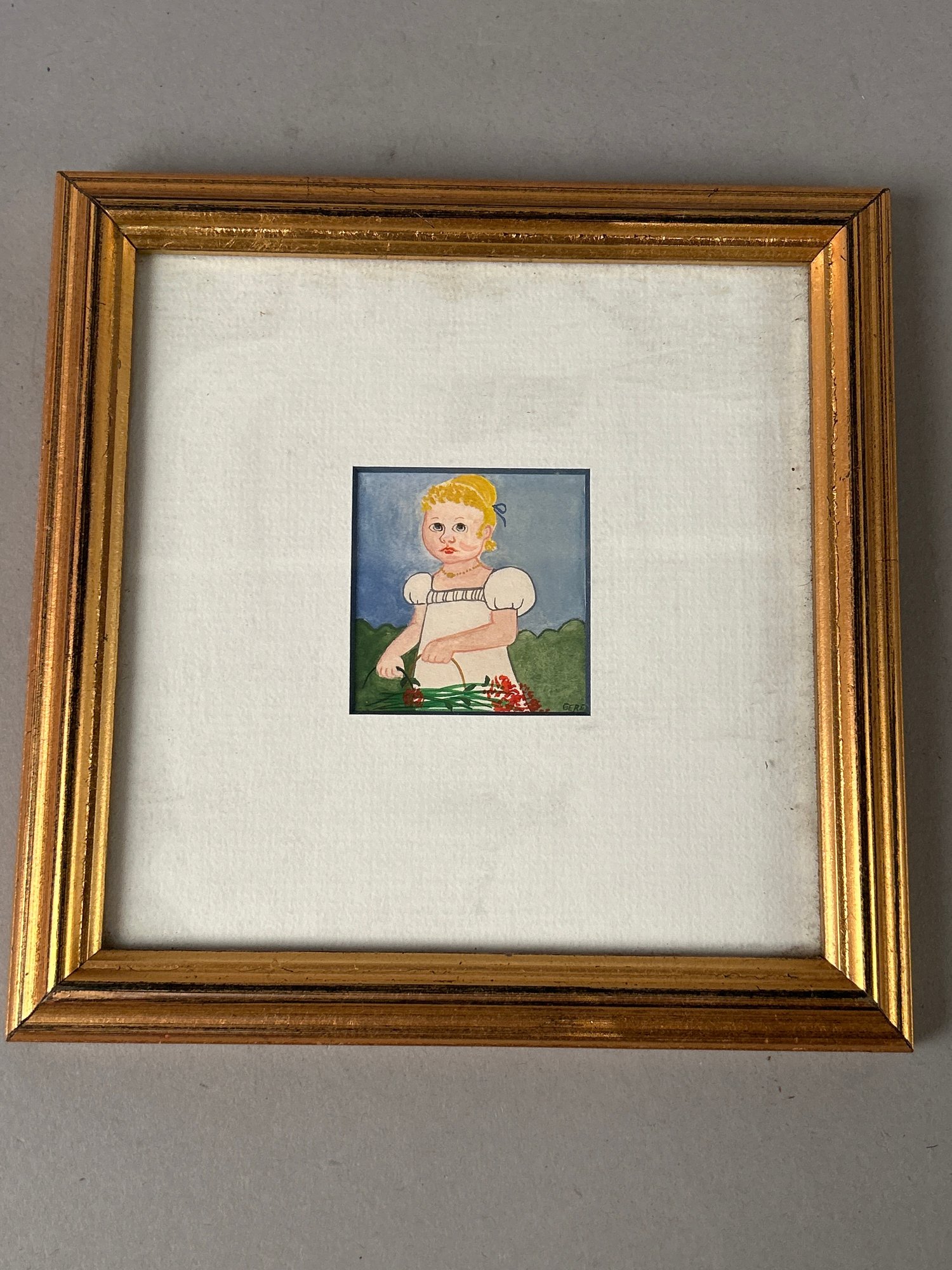 Small framed painting of girl with basket of flowers. 19th century style under glass. Signed Gere. 7“ x 7“