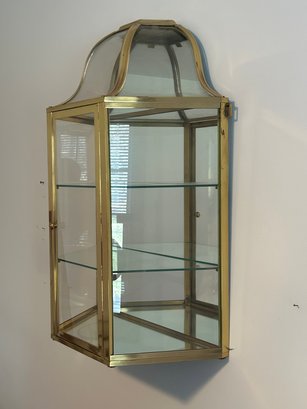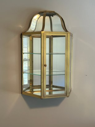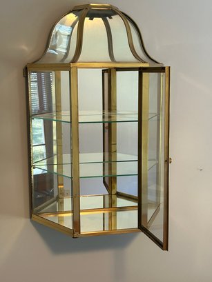 Display case, brass frame, glass shelves, mirrored back. And 18 inches wide 8 1/2 inches deep 26 inches tall.