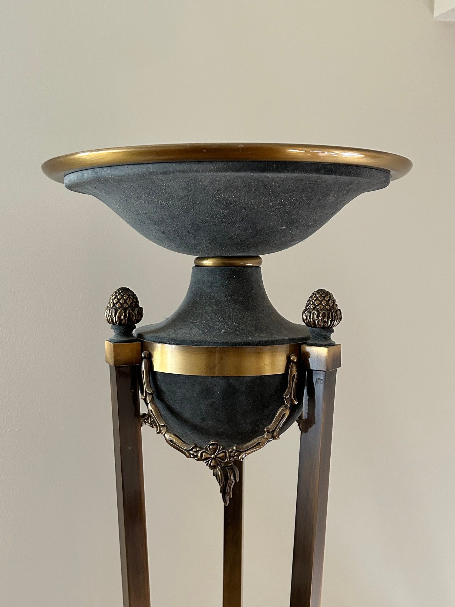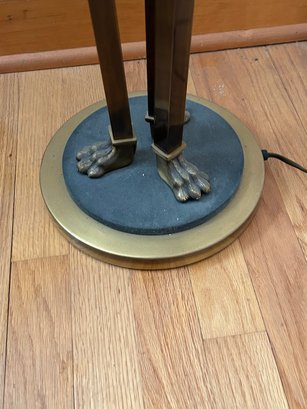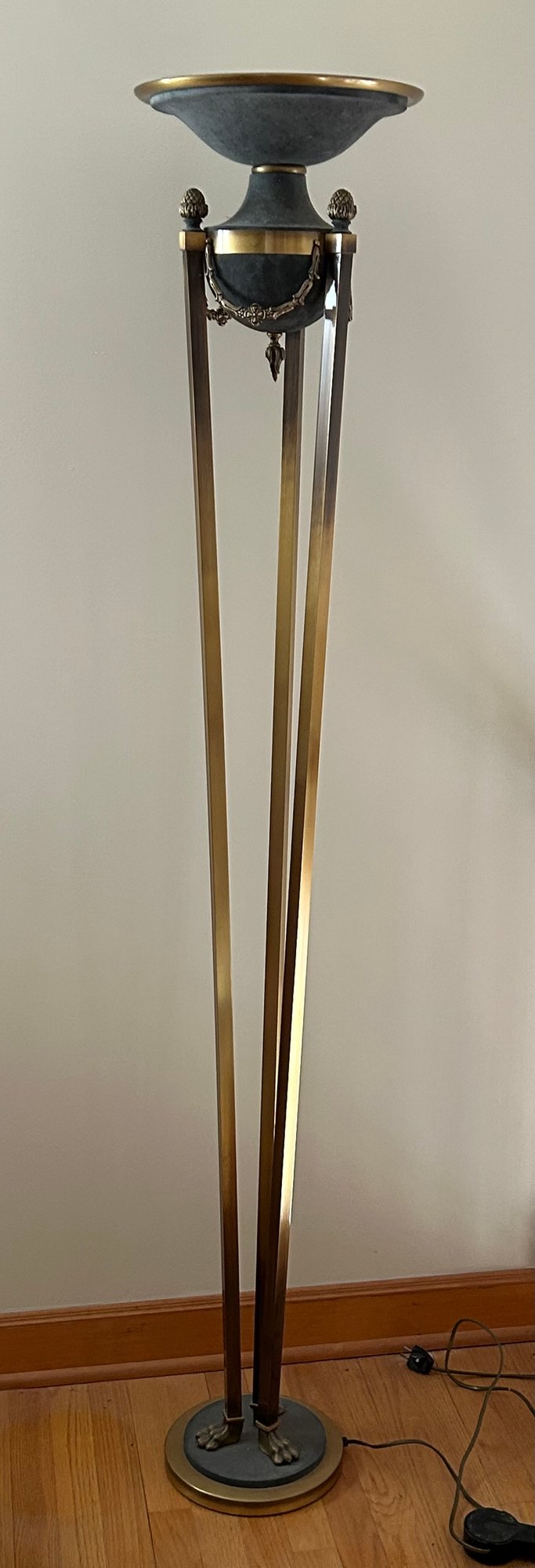 Torch style lamp, modern. Pinecone finials, claw feet. 69 inches tall.