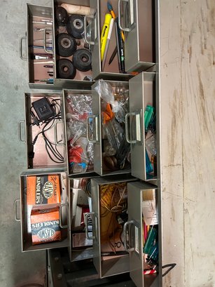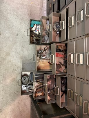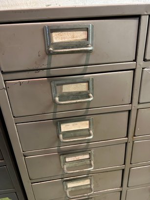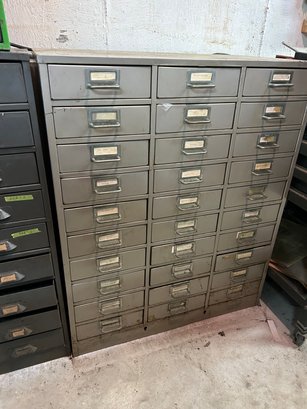 Multi drawer metal storage unit #1. 30 drawers with label holder. Includes contents 30 inches wide 15 1/2 inches deep 36 1/2 inches tall.