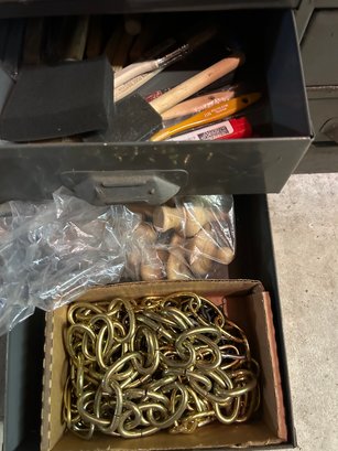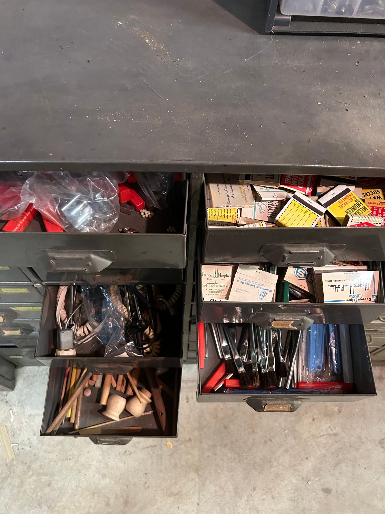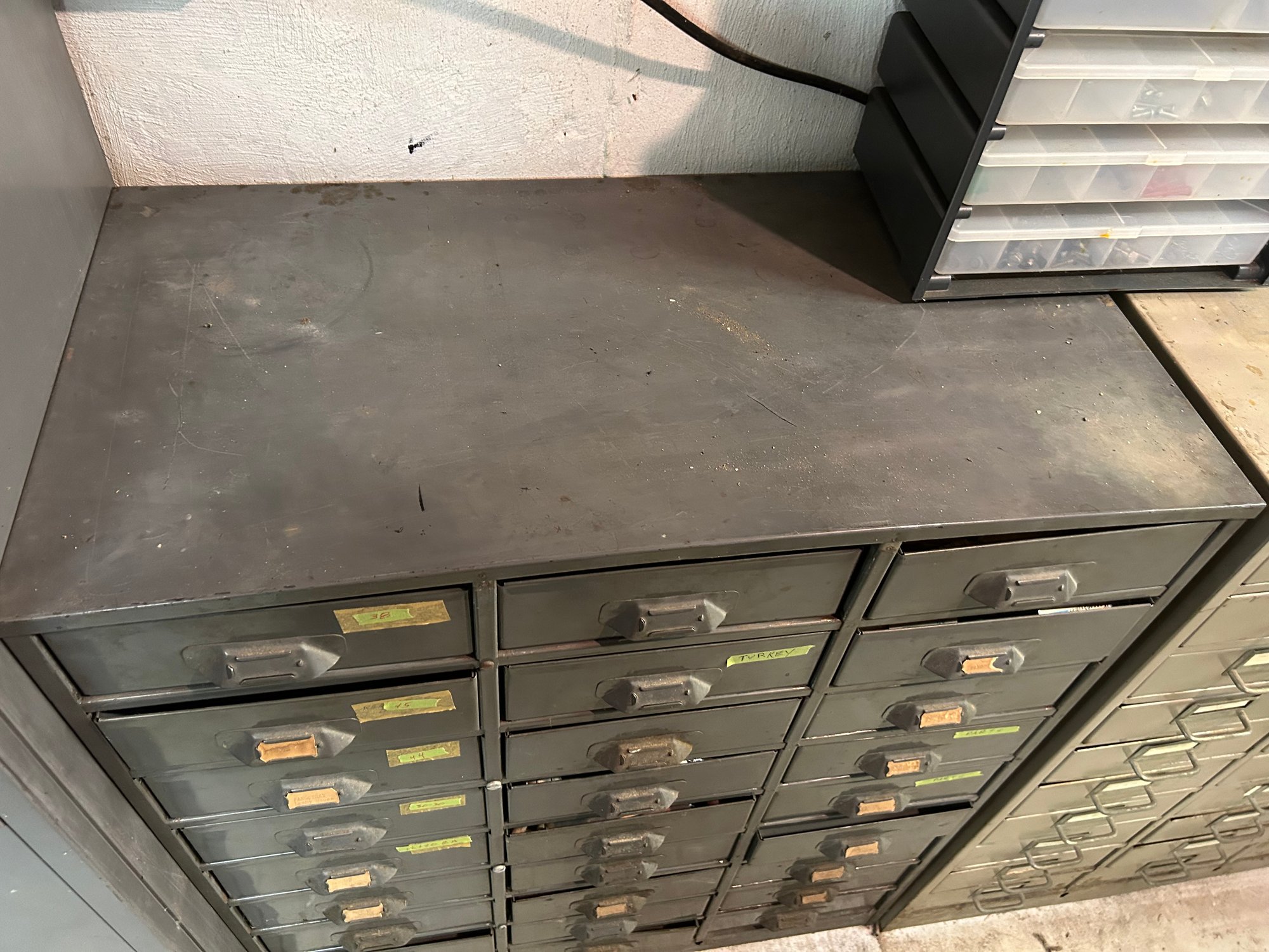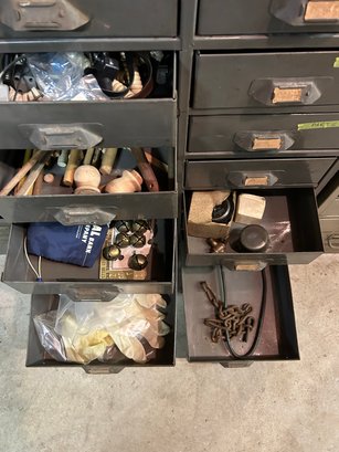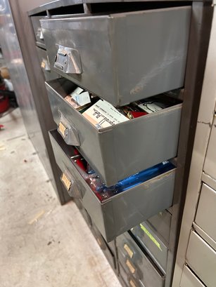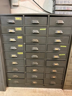Multi drawer metal storage unit #2. 27 drawers with label holders. Includes contents. 30 inches wide 15 1/2 inches deep 36 1/2 inches tall.