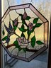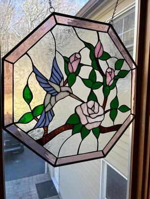 Stained glass window with hummingbird and flower. Octagonal shape 19“ x 19“.