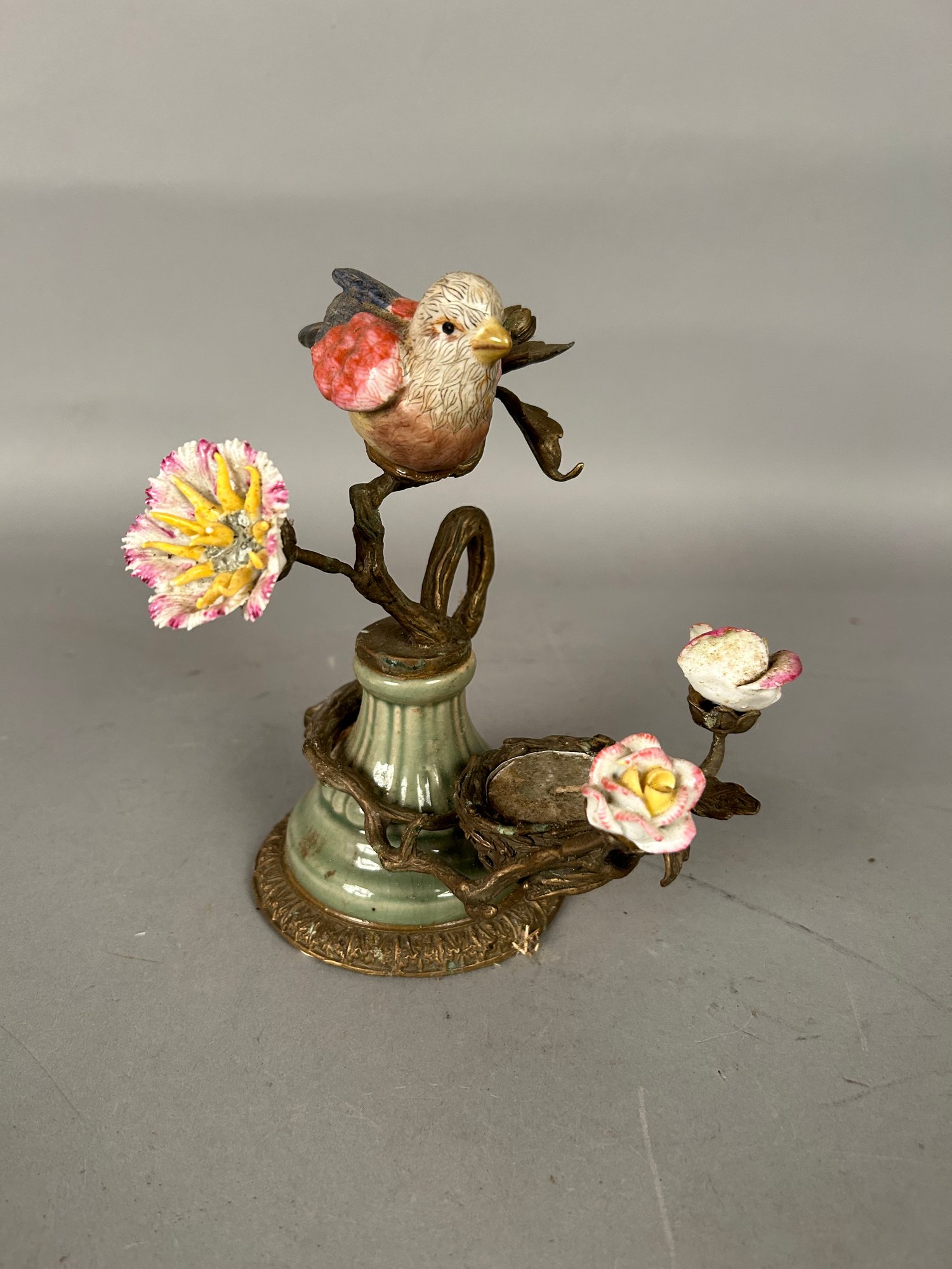 Porcelain and brass candlestick. Bird perched on flower. By Mark Roberts