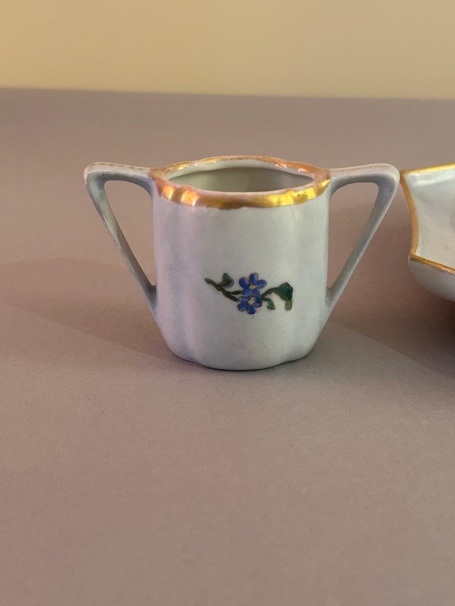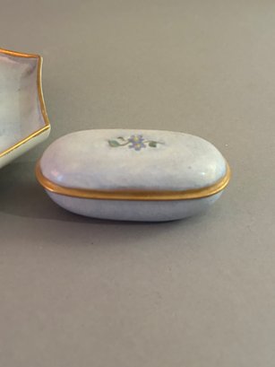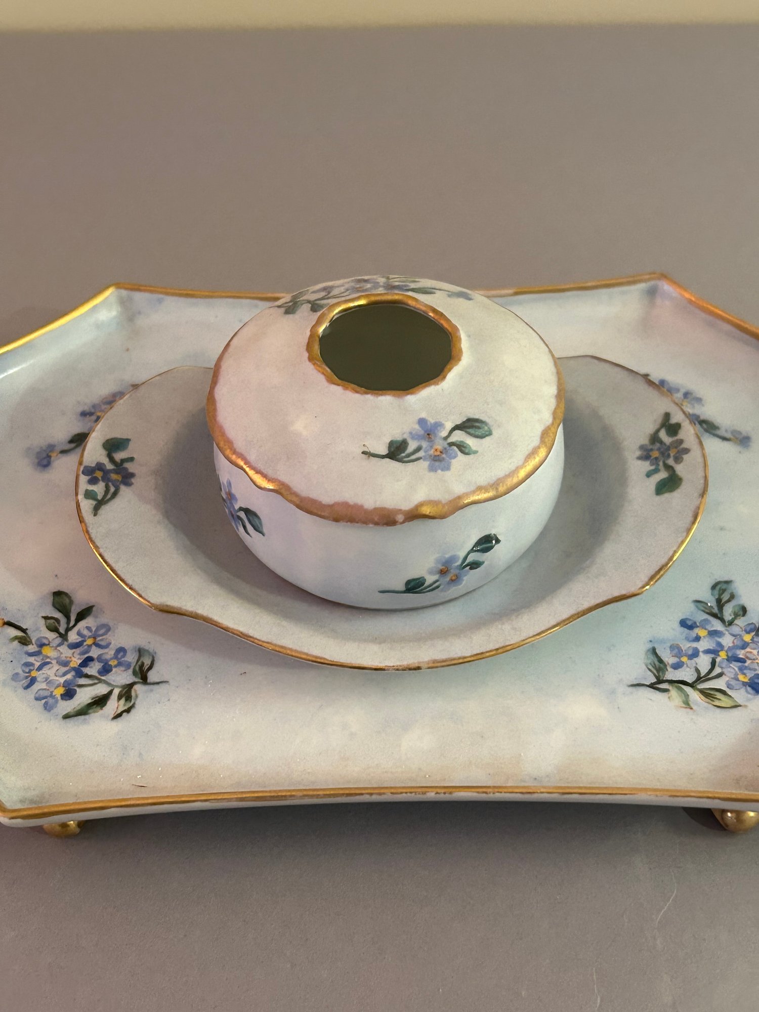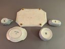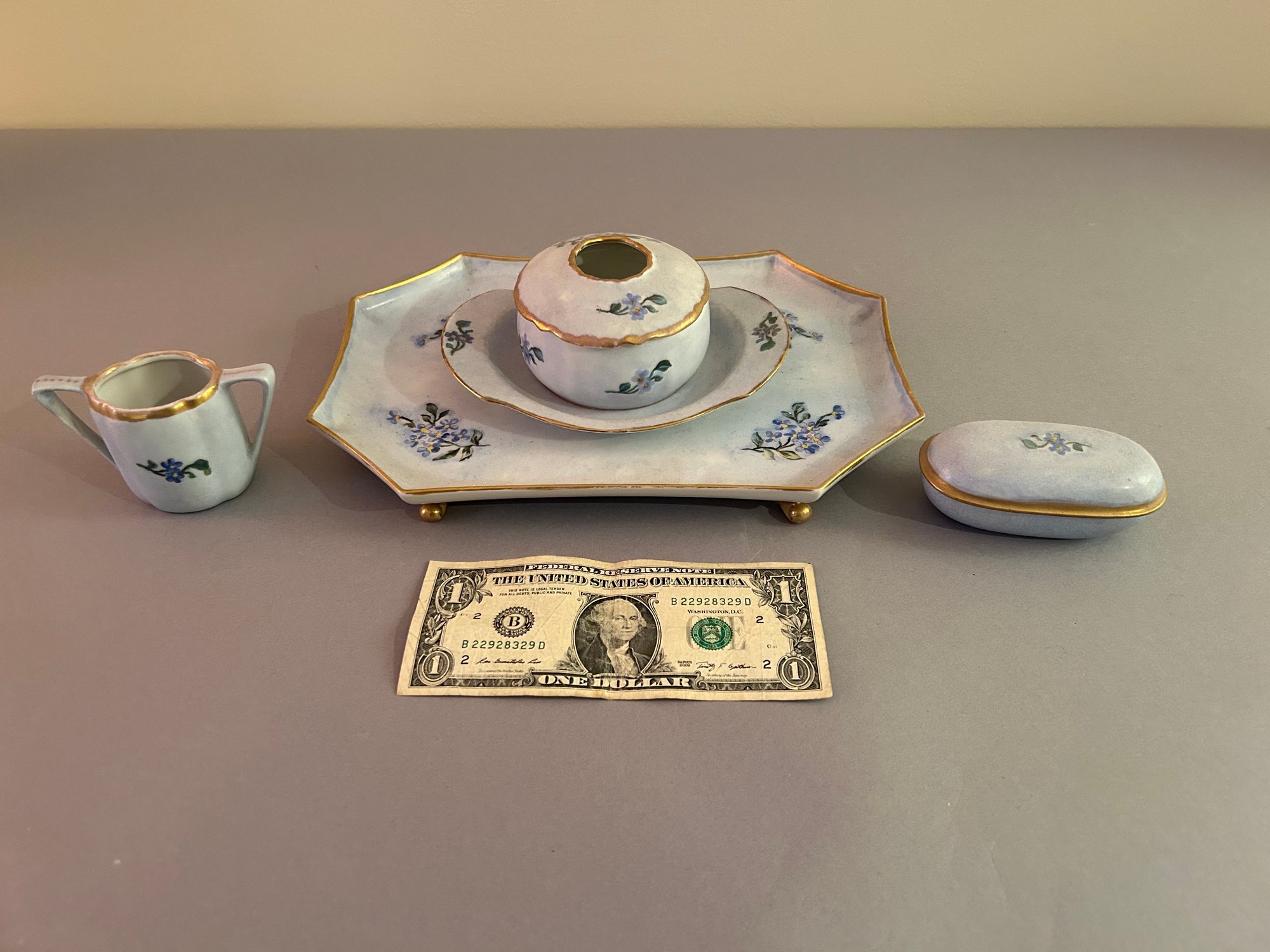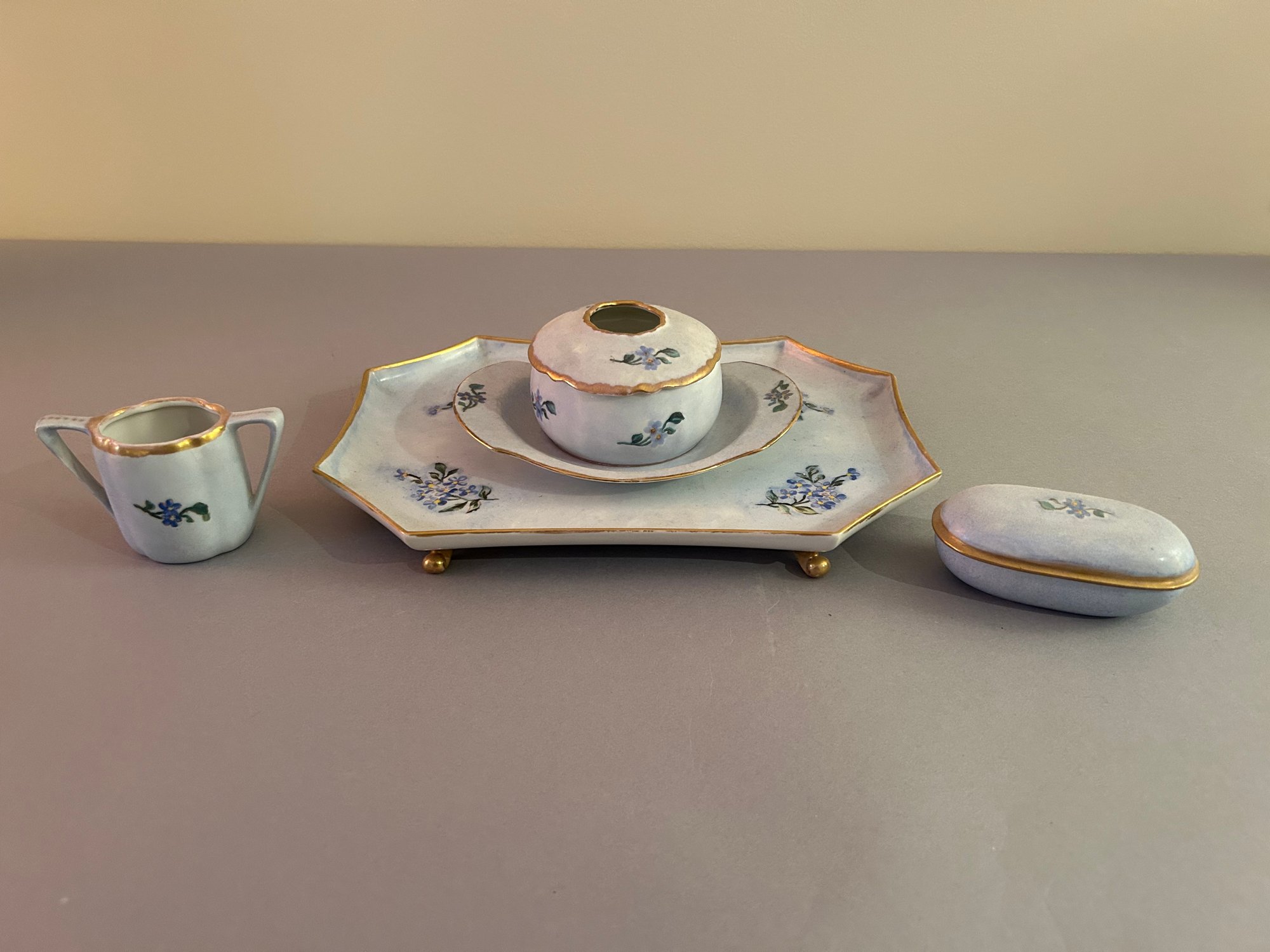 Porcelain Hand Painted Dresser Set Including Limoges Tray and several marked LEBELL. Largest 10x7 inches