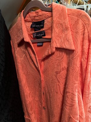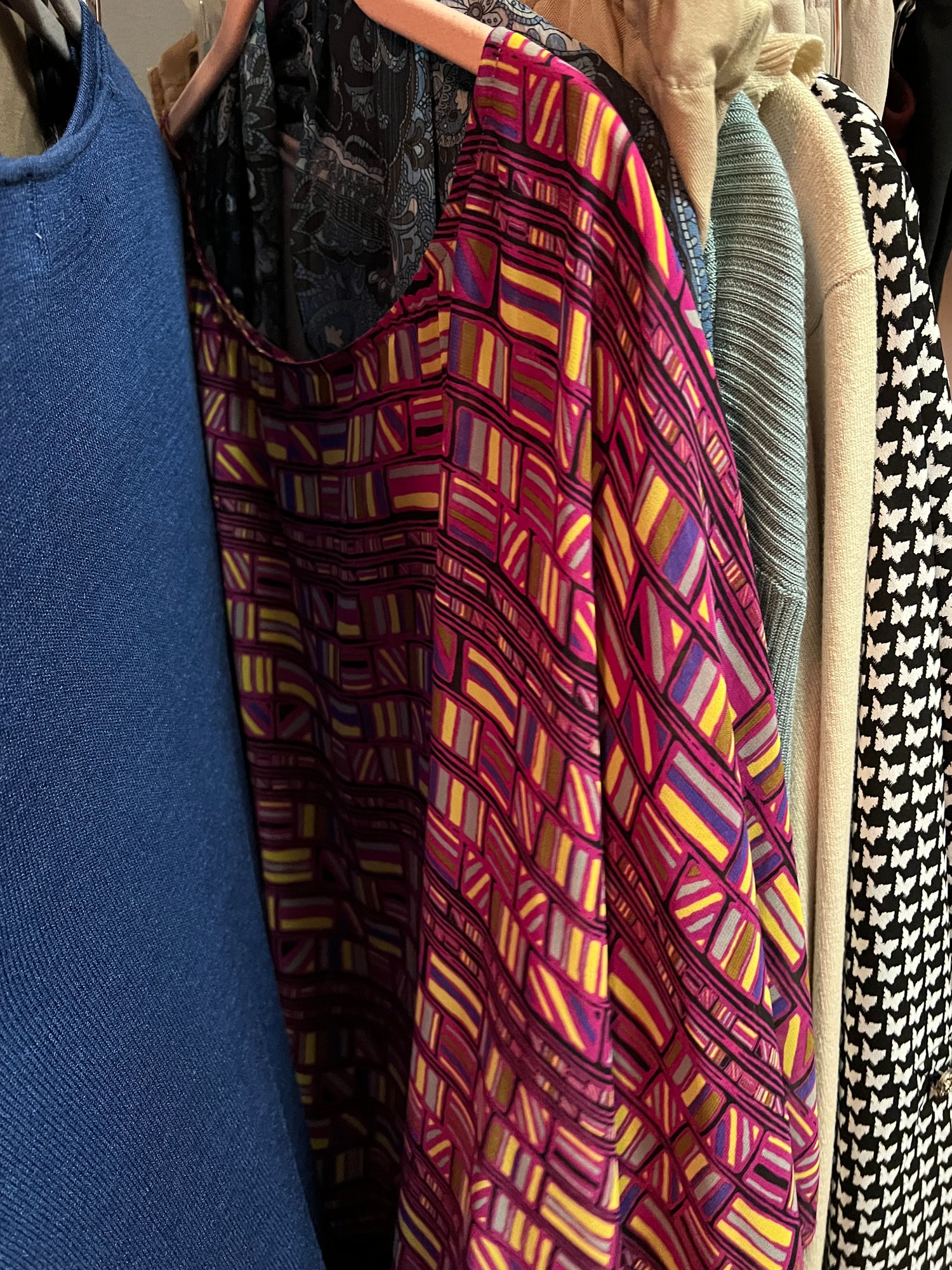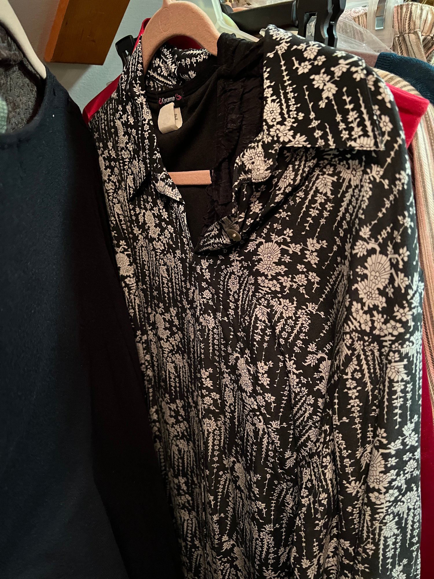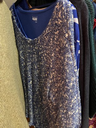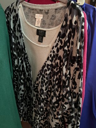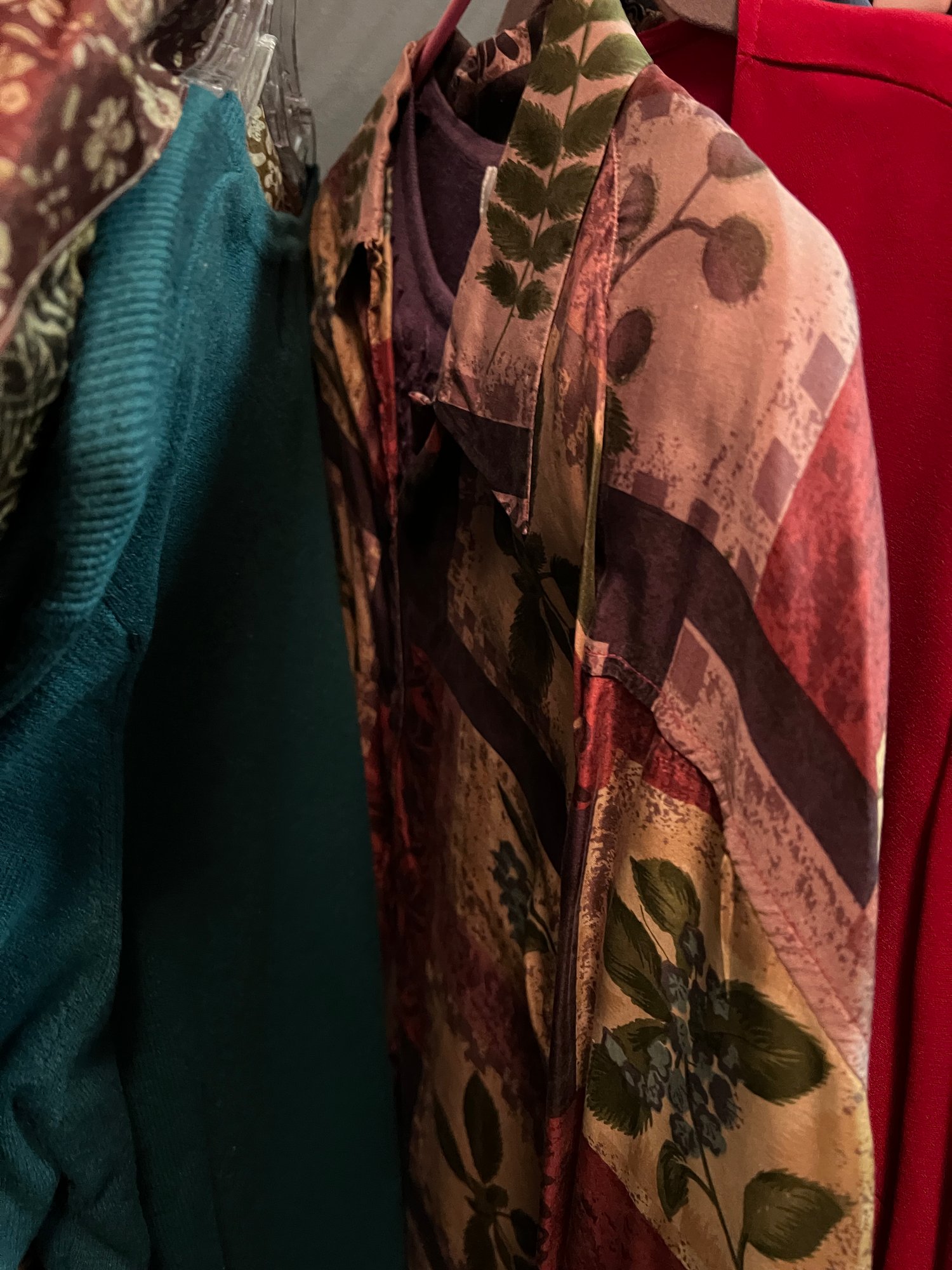 Rack of clothes. Brands include Susan Graver, Denim & Co, Jaclyn Stag, Kathy Ireland, August Silk and many more. Sizes range from Medium to Extra Large. (CC)
