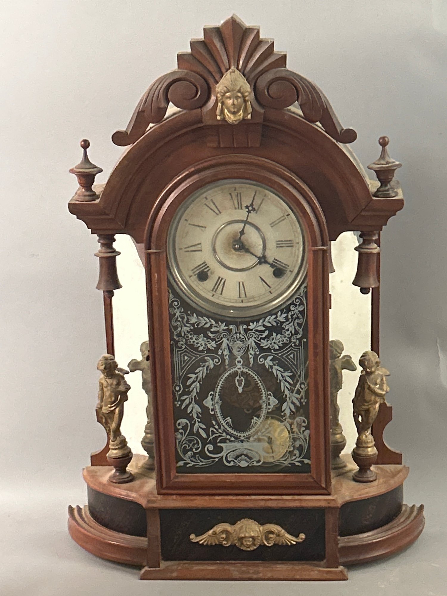 19th C Shelf Clock, Gilbert Clock Company Winstead with second hand on pendulum. Walnut case, applied decorations, mirrored sides. 16“ x 5“ x 23 1/2“ tall.
