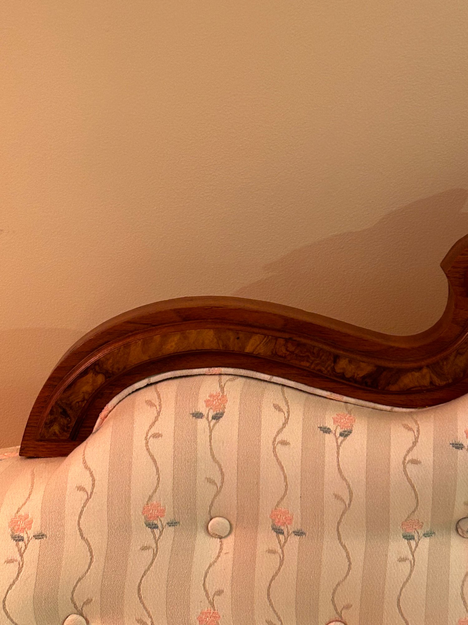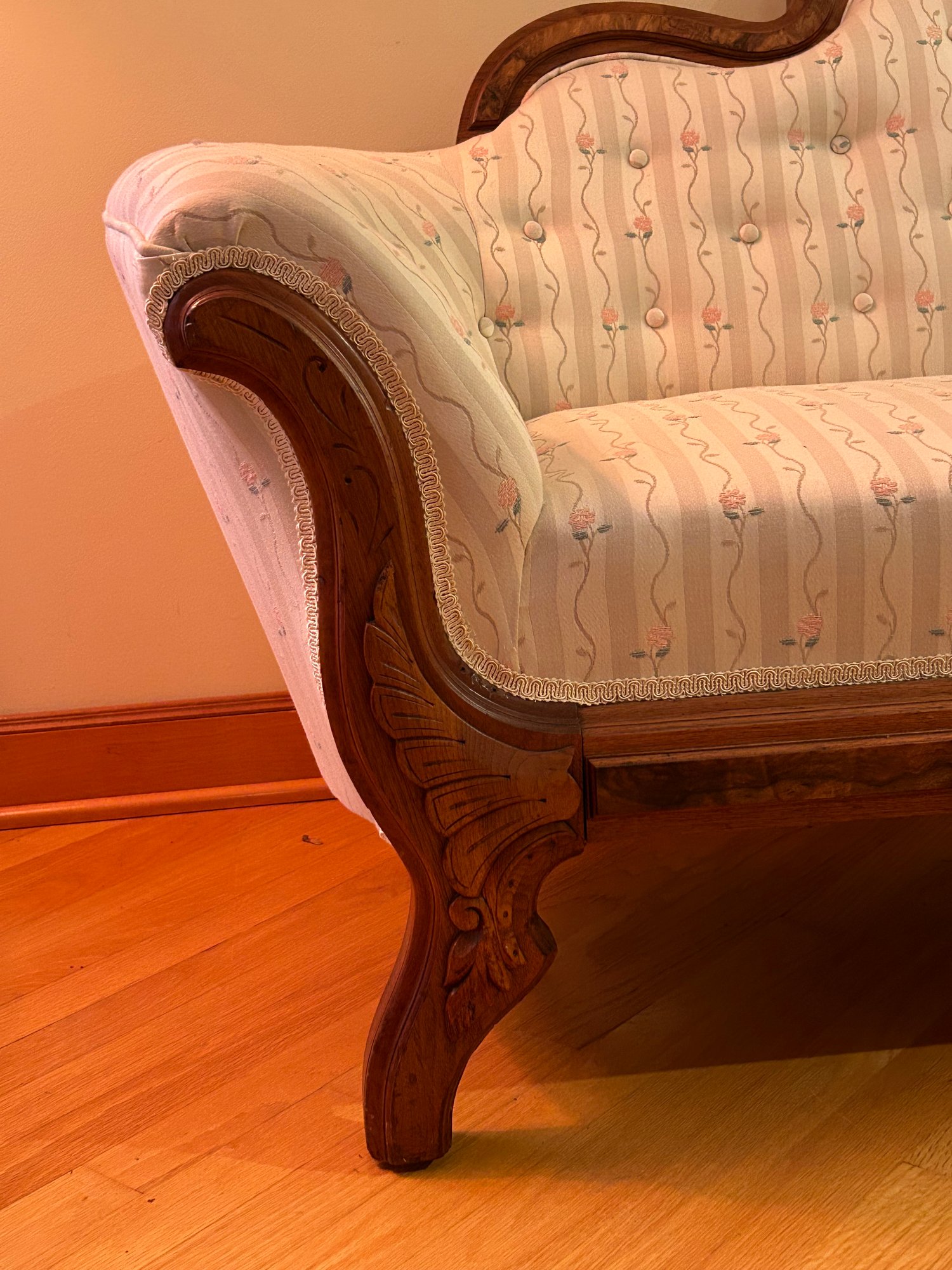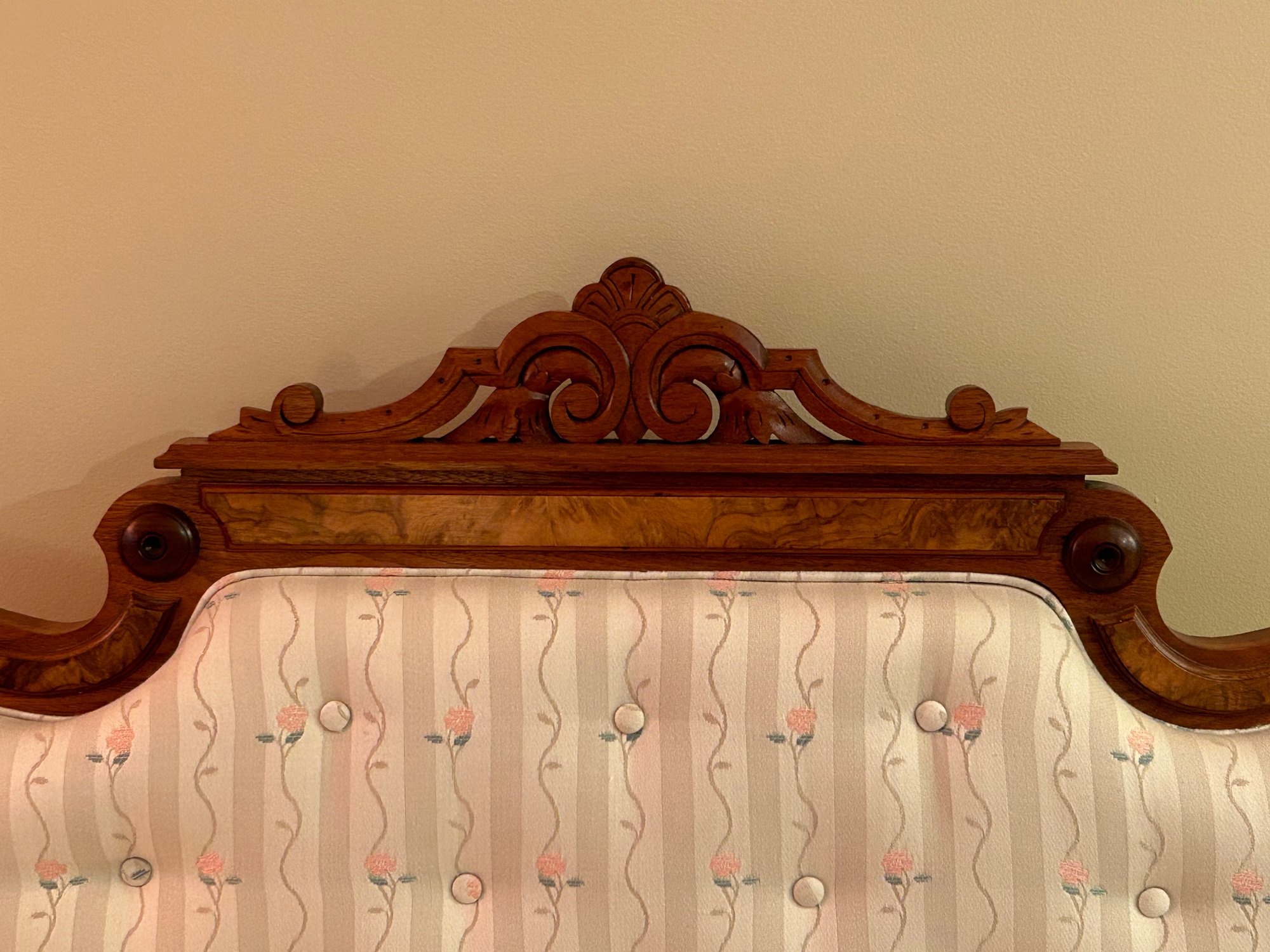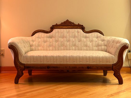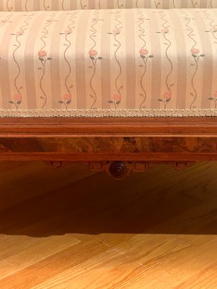 Rare Eastlake loveseat. Unusual small size. Carved crest, veneer highlights, carved legs. New upholstery excellent condition. 35x67x24 inches