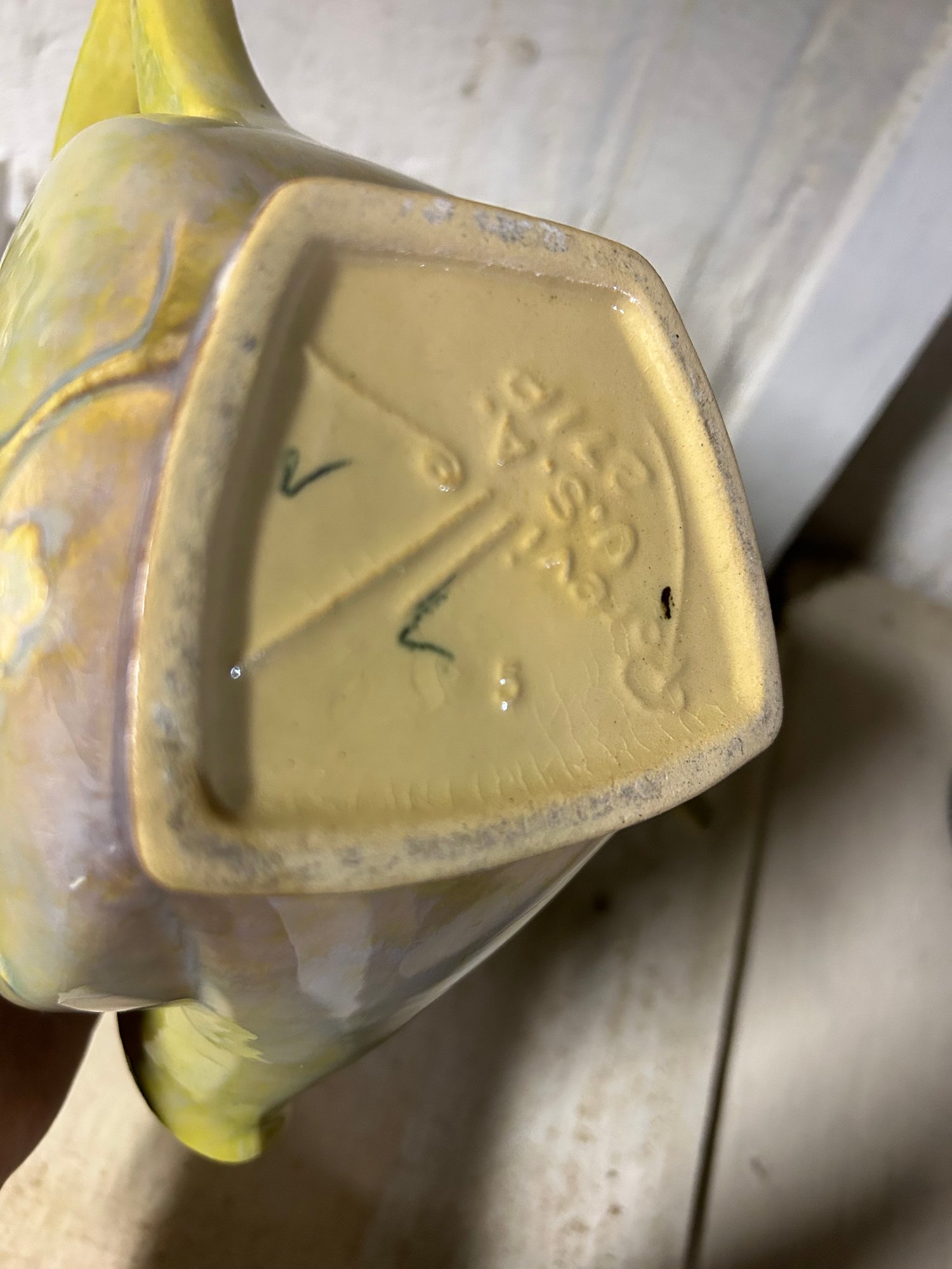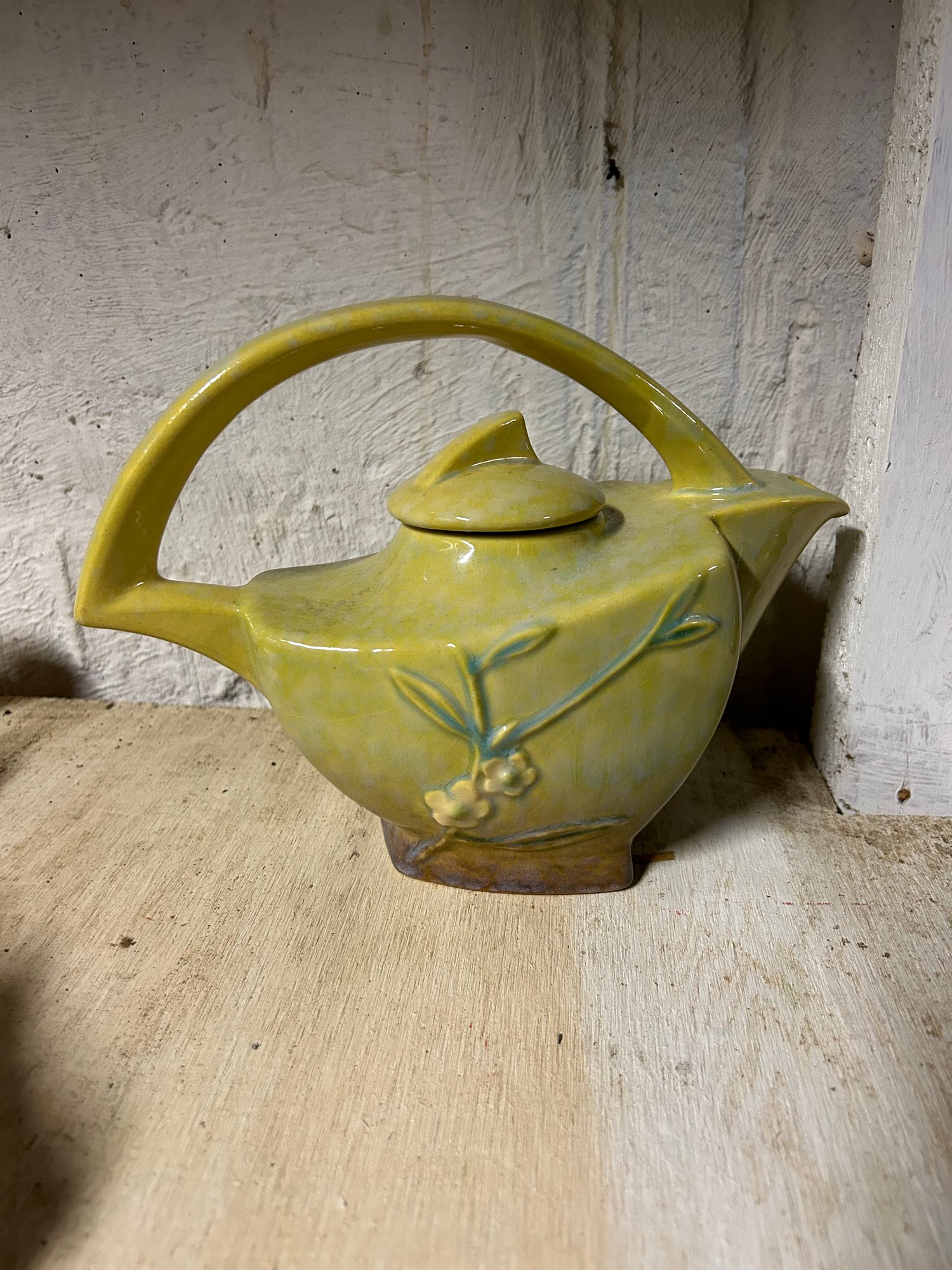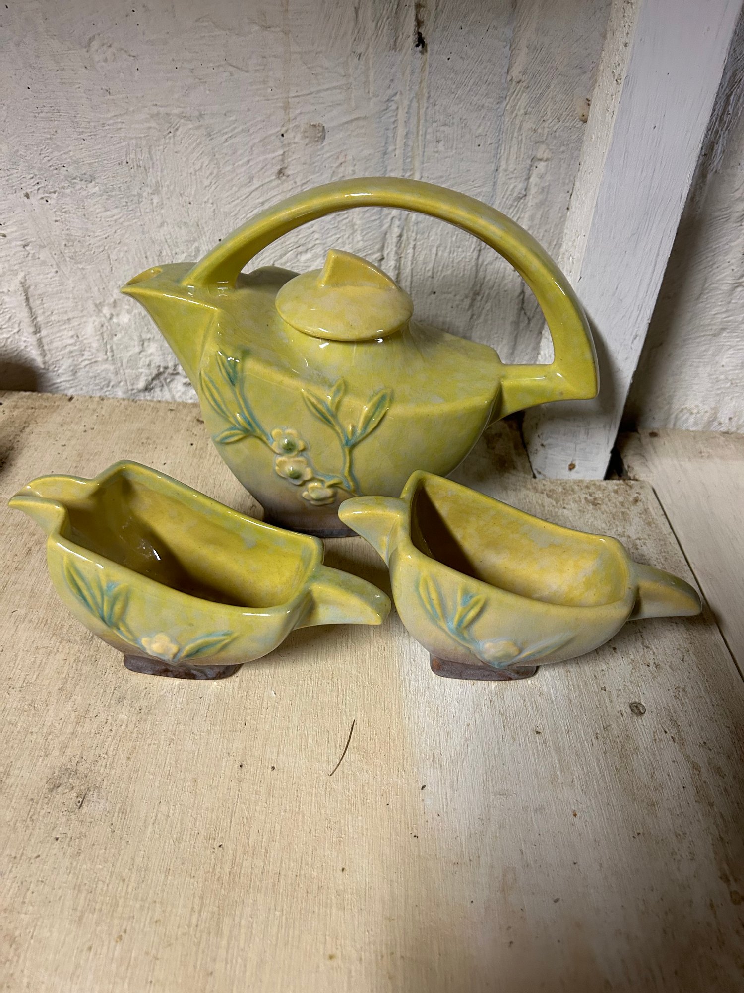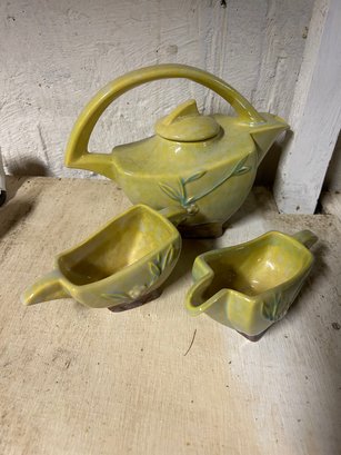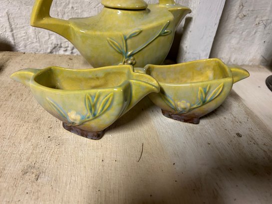 Roseville tea pot, sugar and creamer. Marked on bottom. Floral design teapot, 7 inches tall.