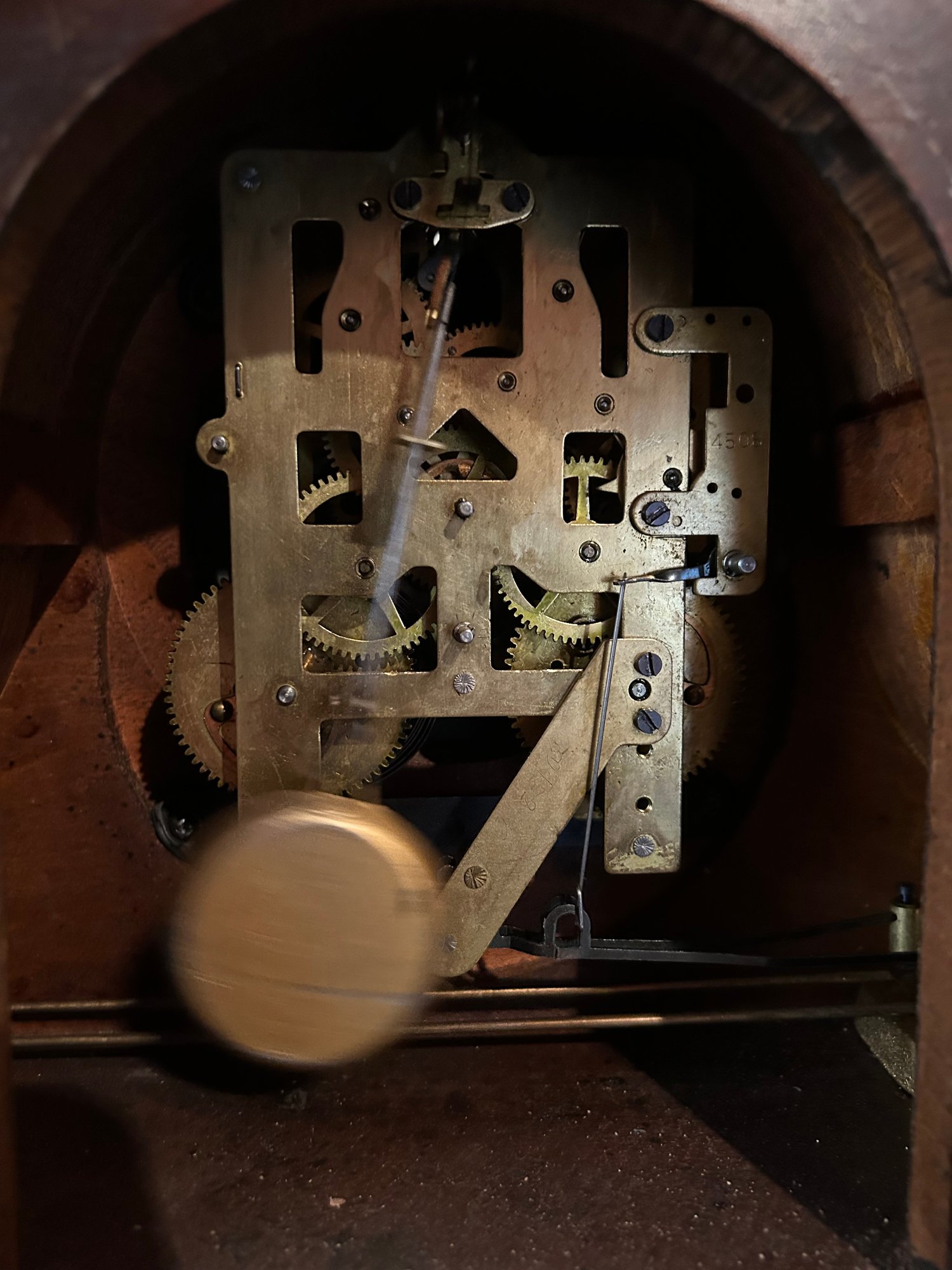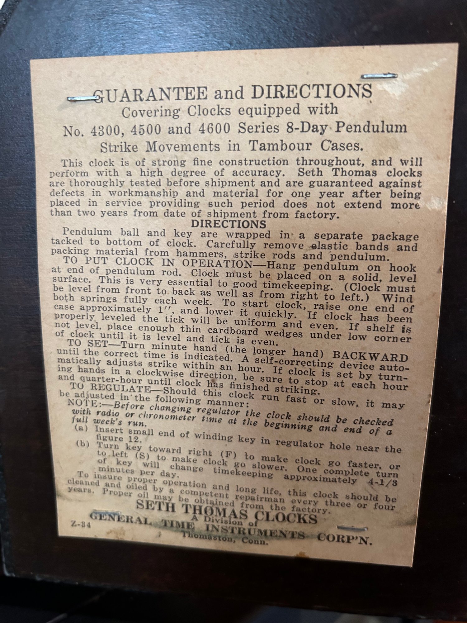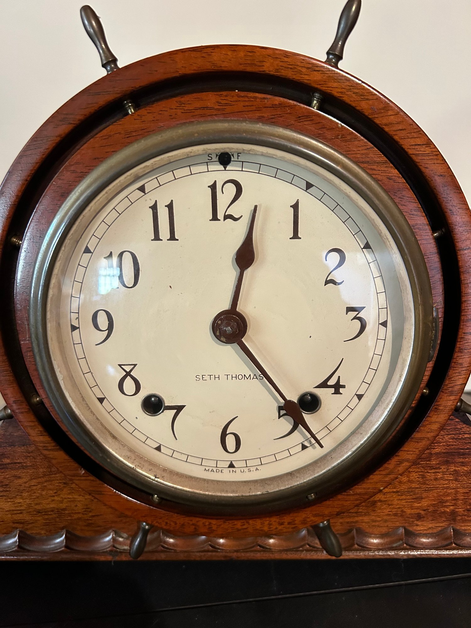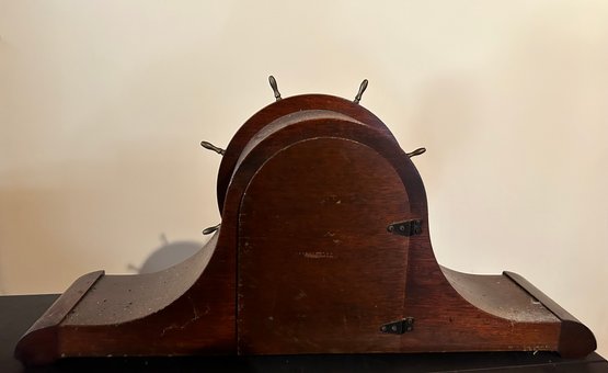 Seth Thomas mantle clock in working condition, original label inside. 20“ x 9 1/2“ x 4 1/2“ deep.