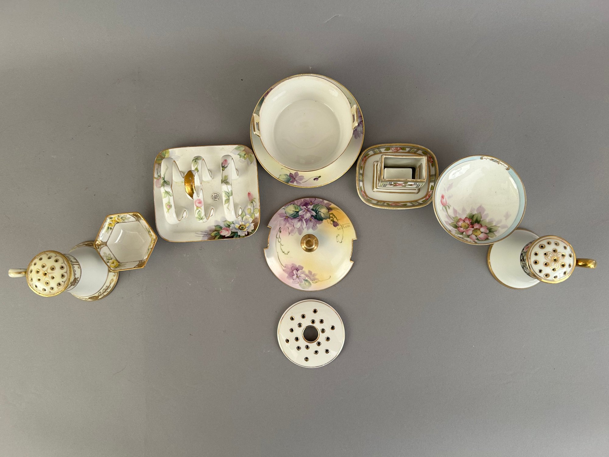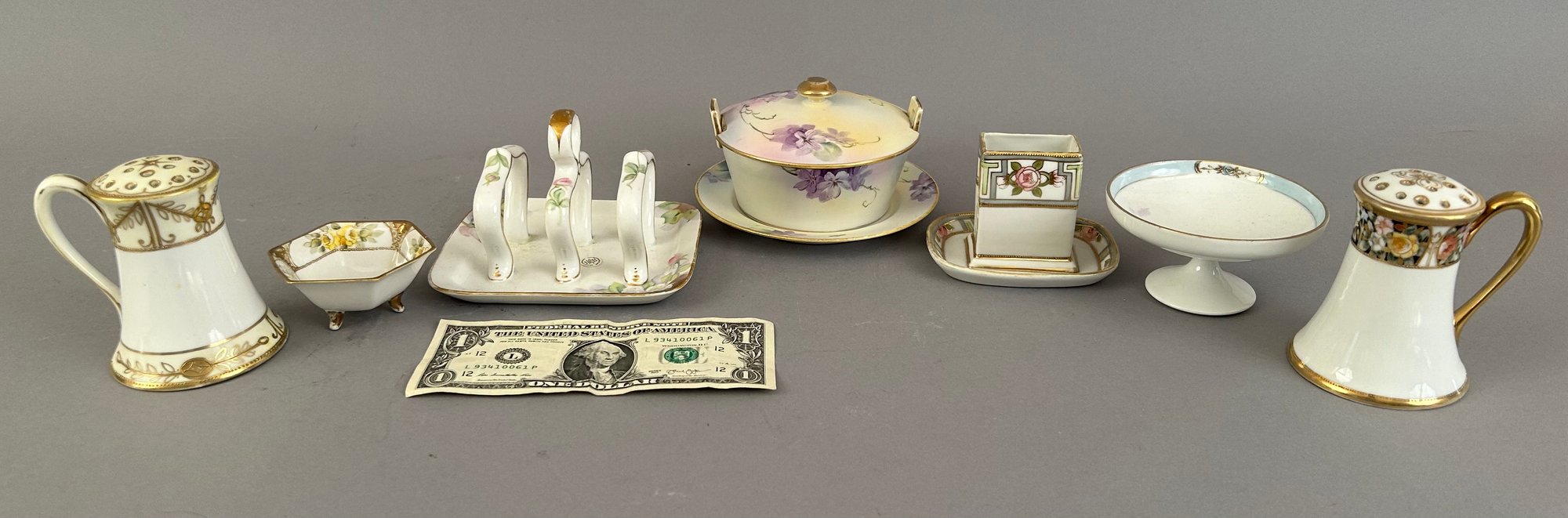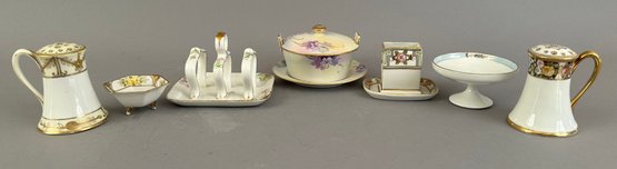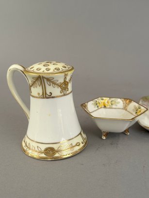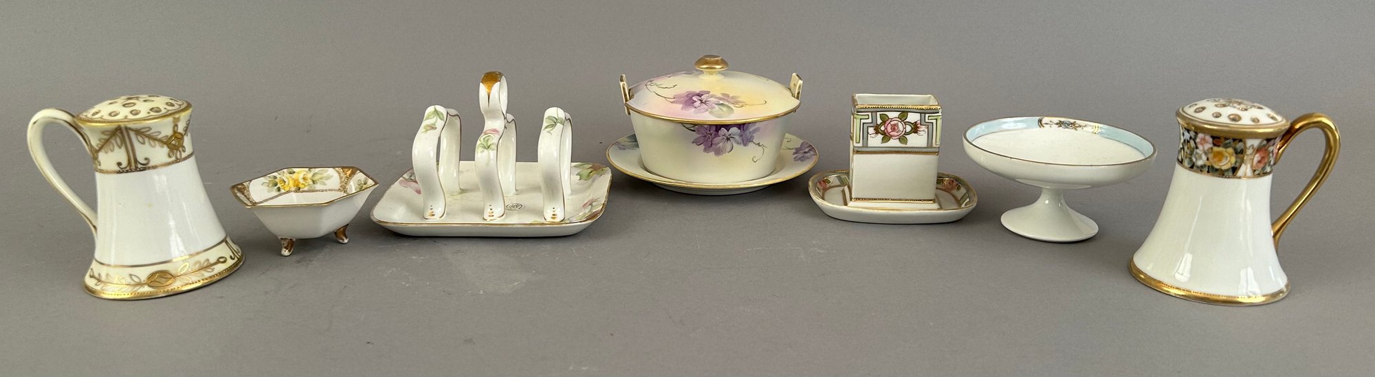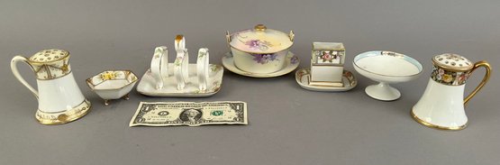 Seven pieces of Hand painted Nippon including salt and pepper shakers, toast holder, match holder and more. Marked on the bottom.
