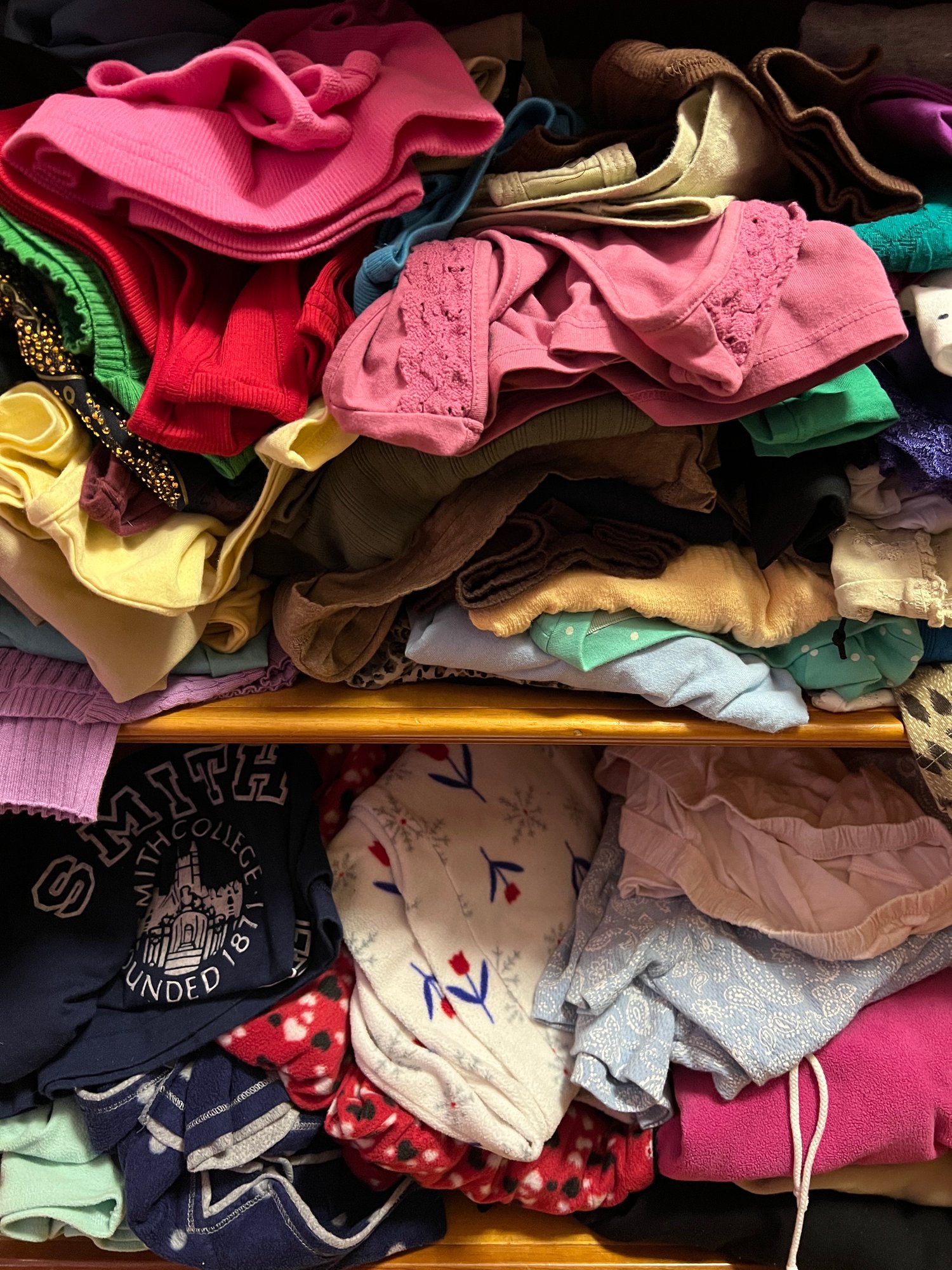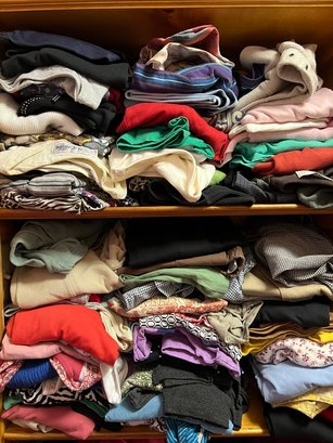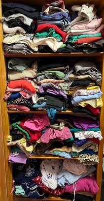 Several shelves of women’s clothing including tops and bottoms. Including denim and co, faded glory, basic editions, Route 66, white stag and others. (FF)