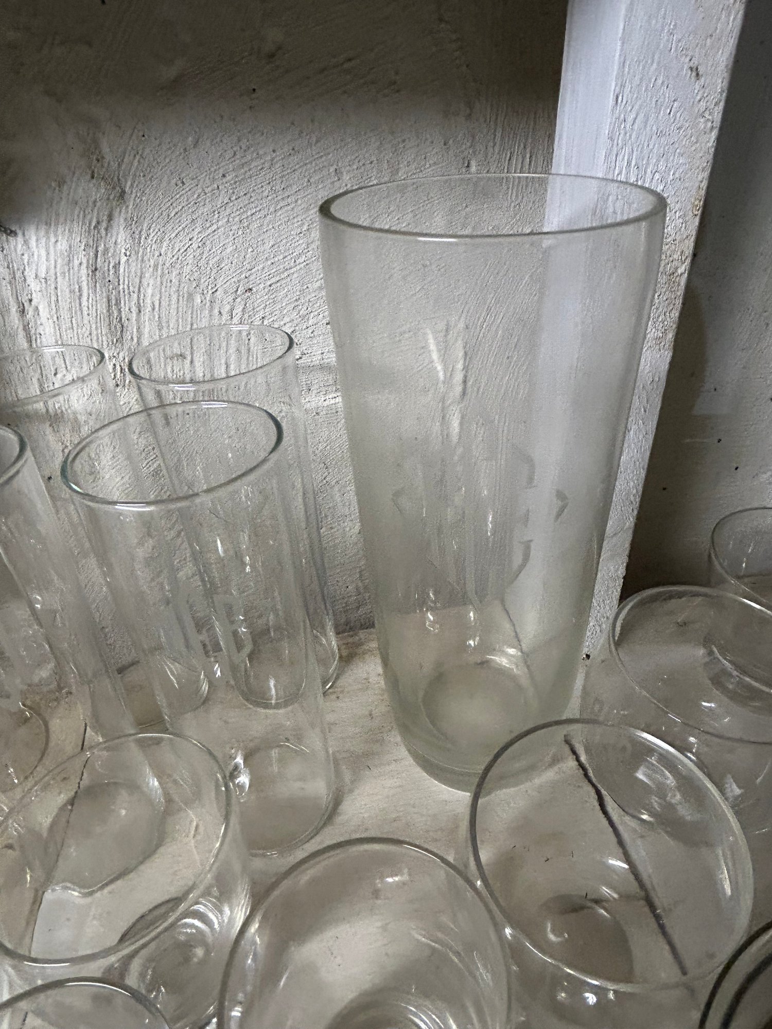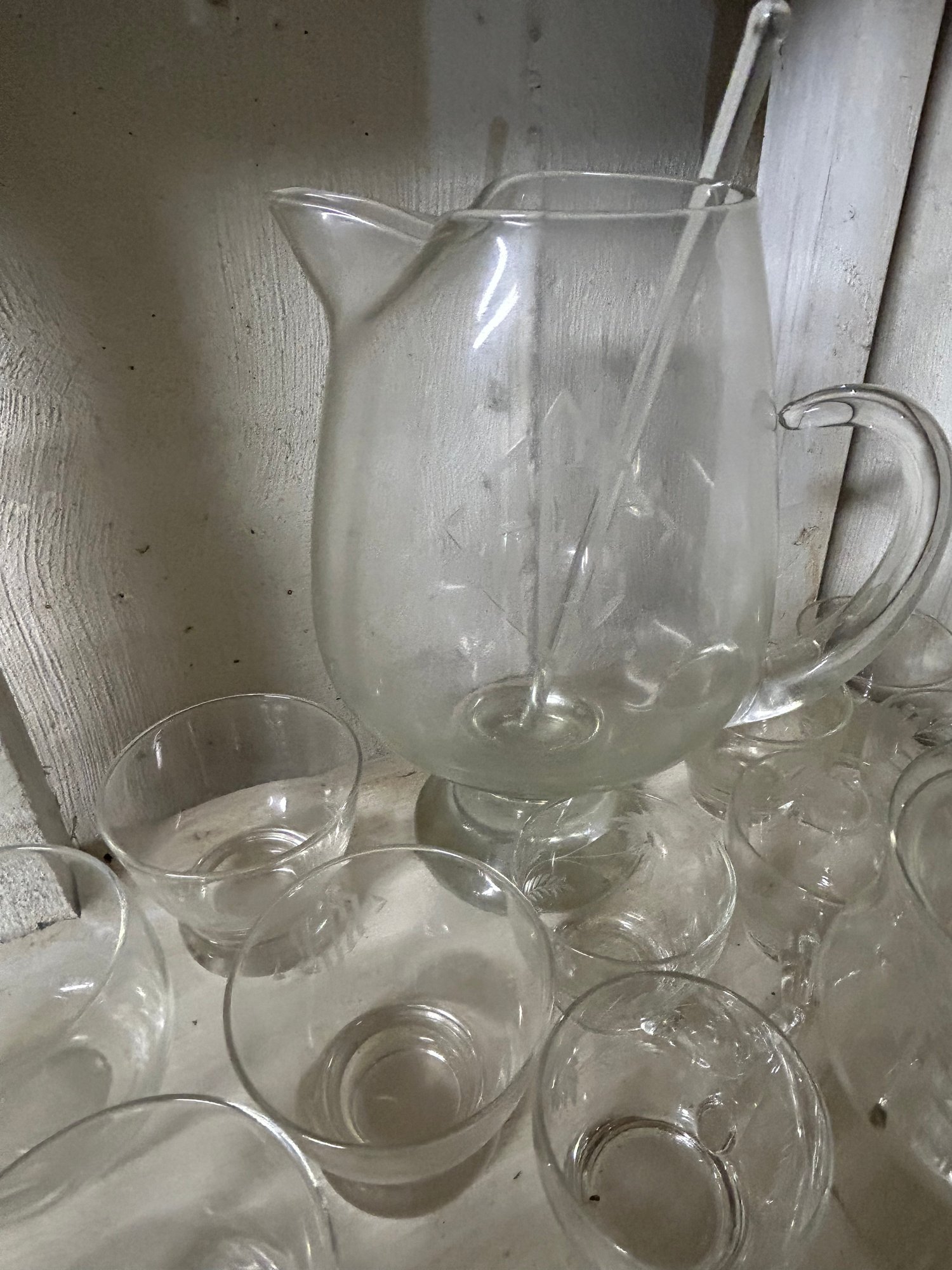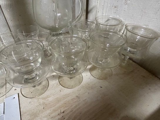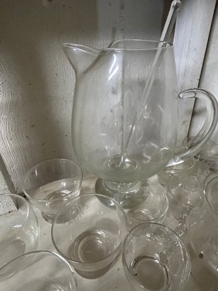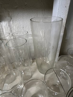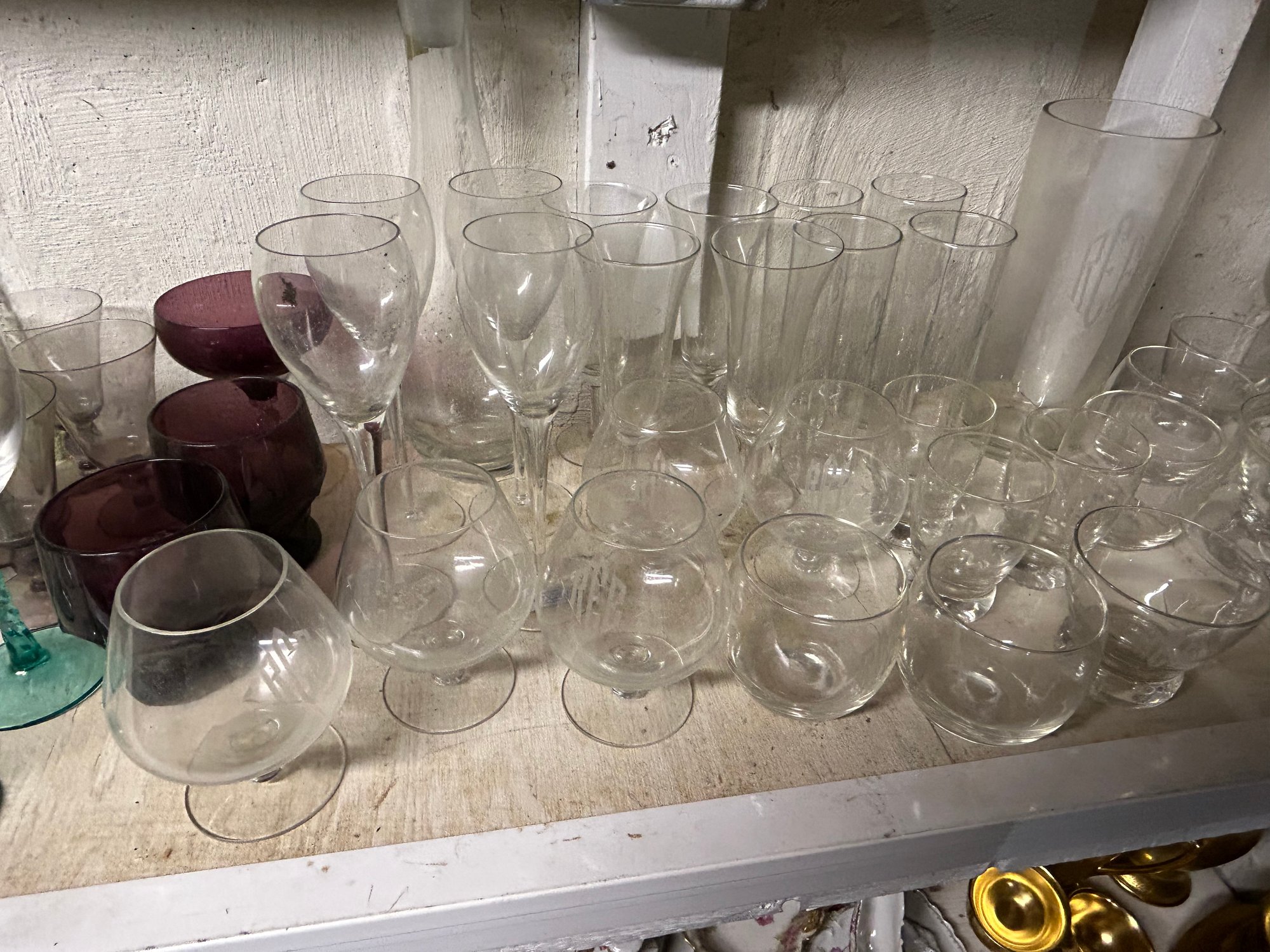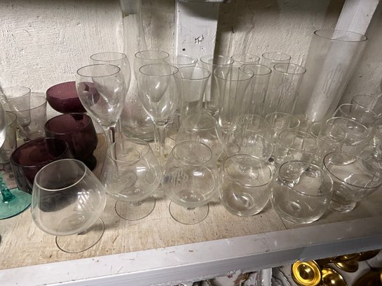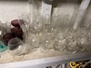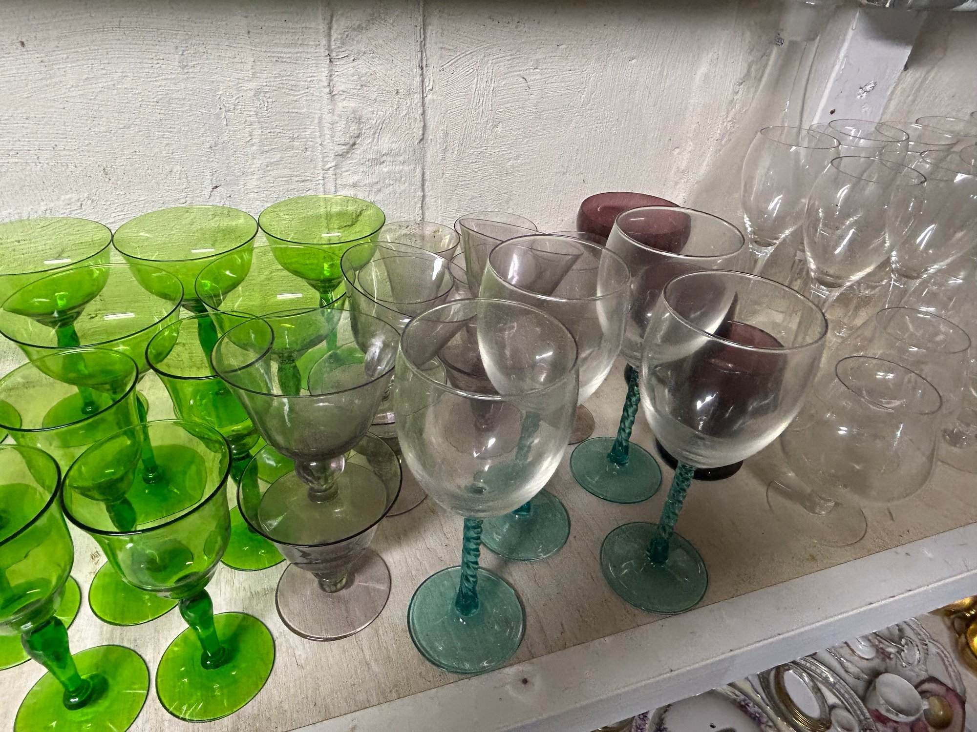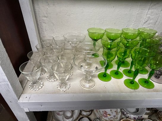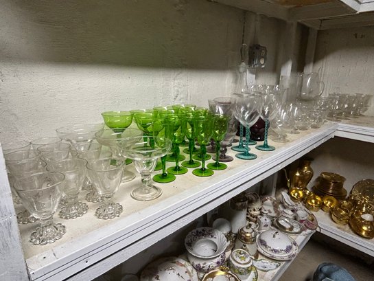 Shelf lot of 85+ glasses. Sets of glasses, including green glass, clear glass, four footed wine glasses with green spiral stems, dessert dishes with inserts, decanter, etc.