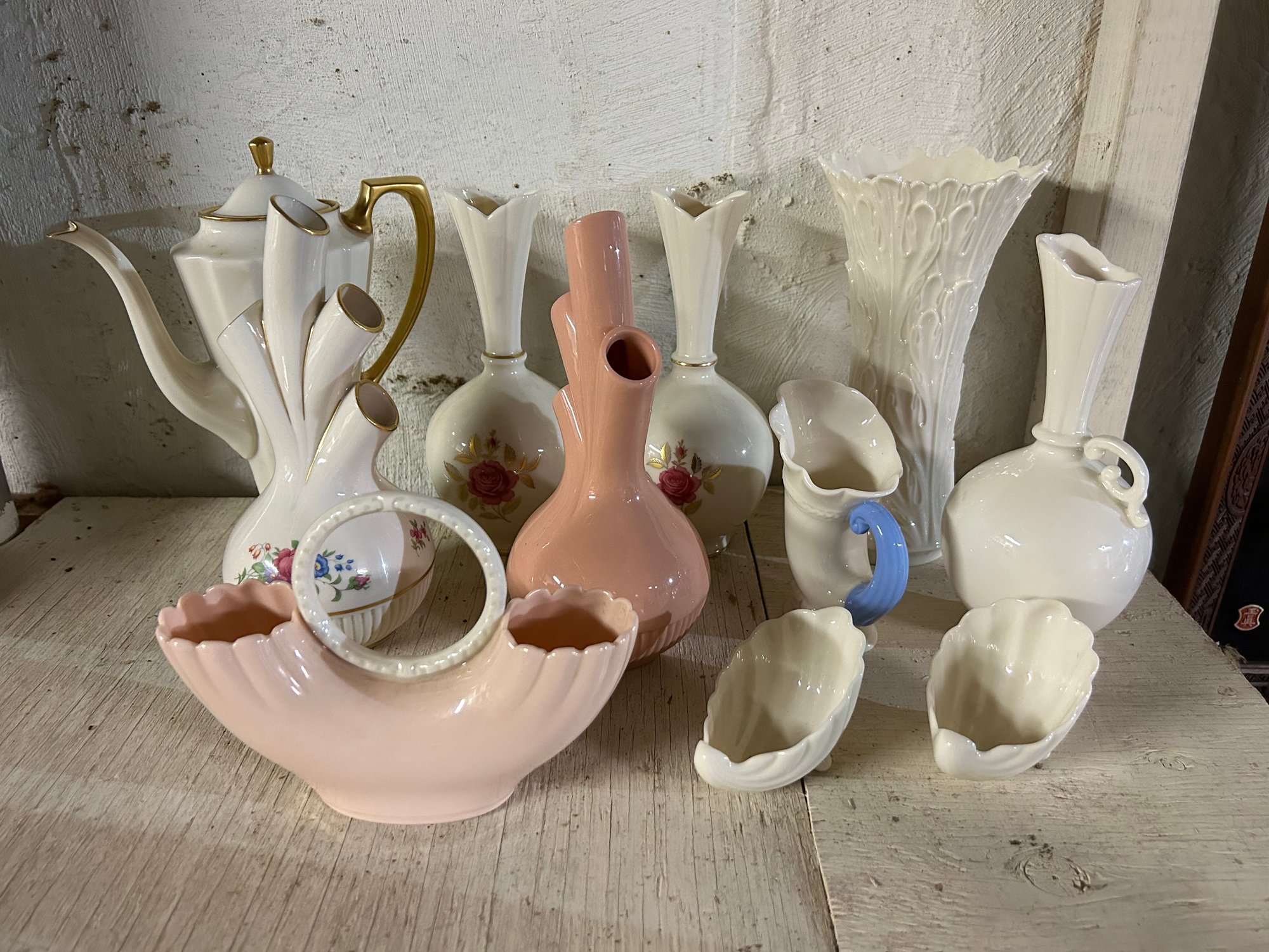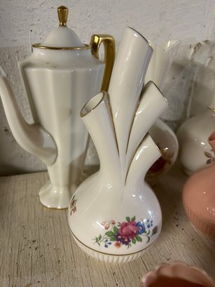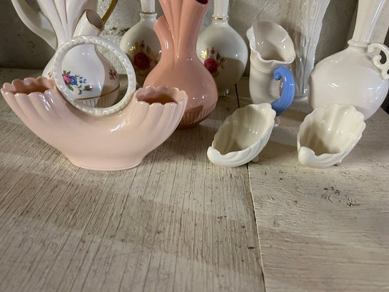 Shelf lot of Lenox china, 11 pieces including vases, tea pot, pitcher, etc. Tallest piece 9 inches