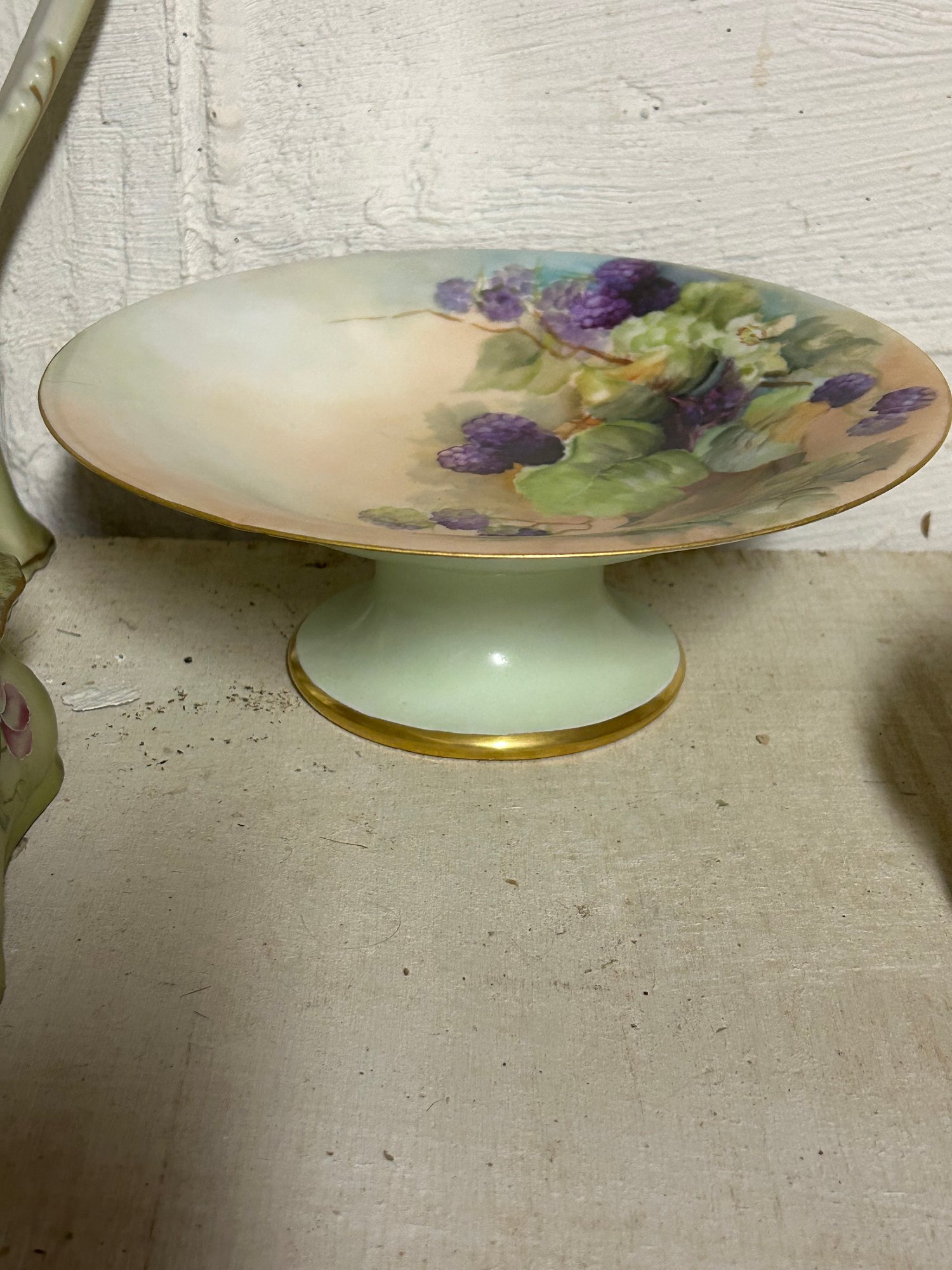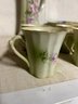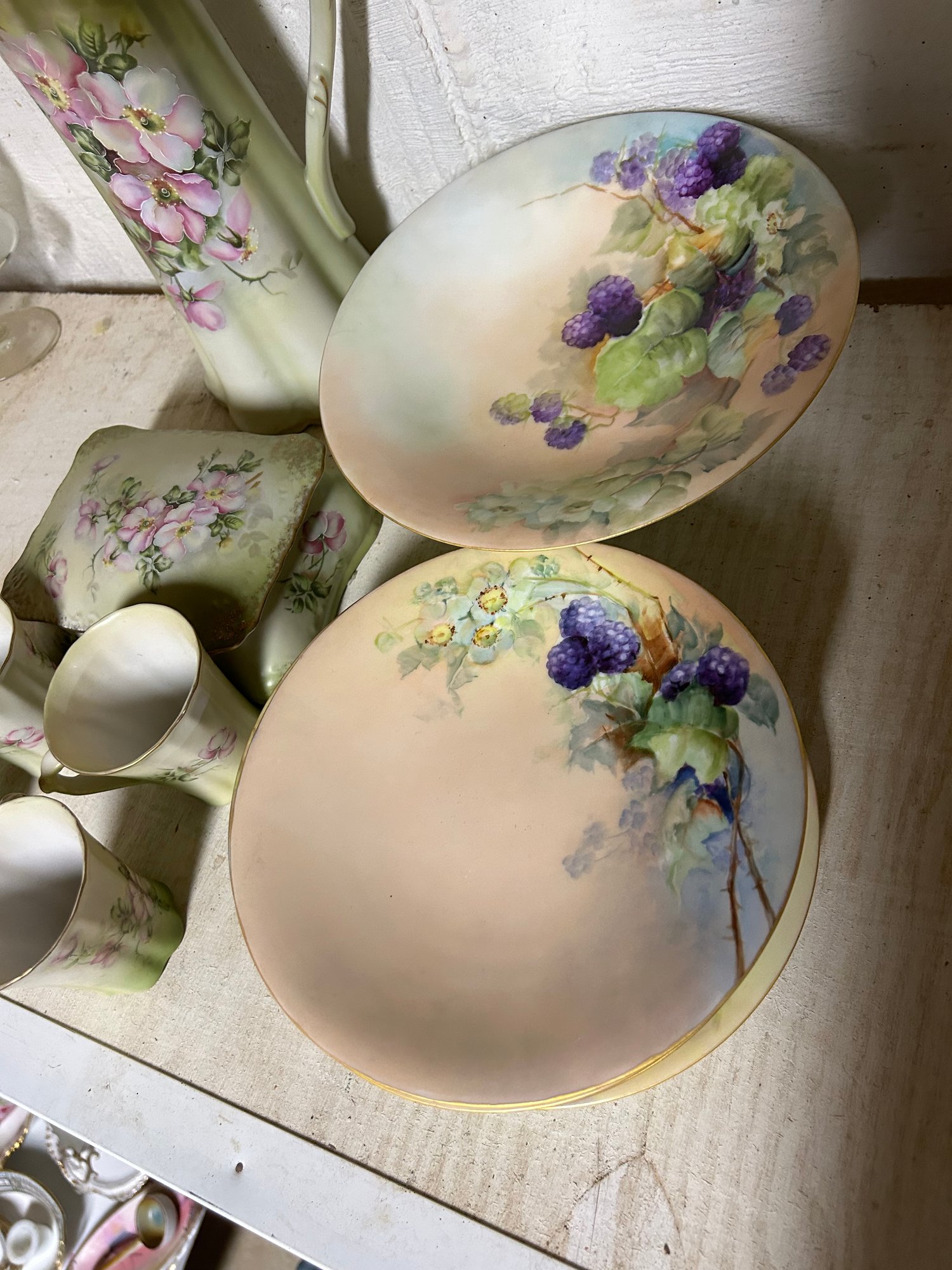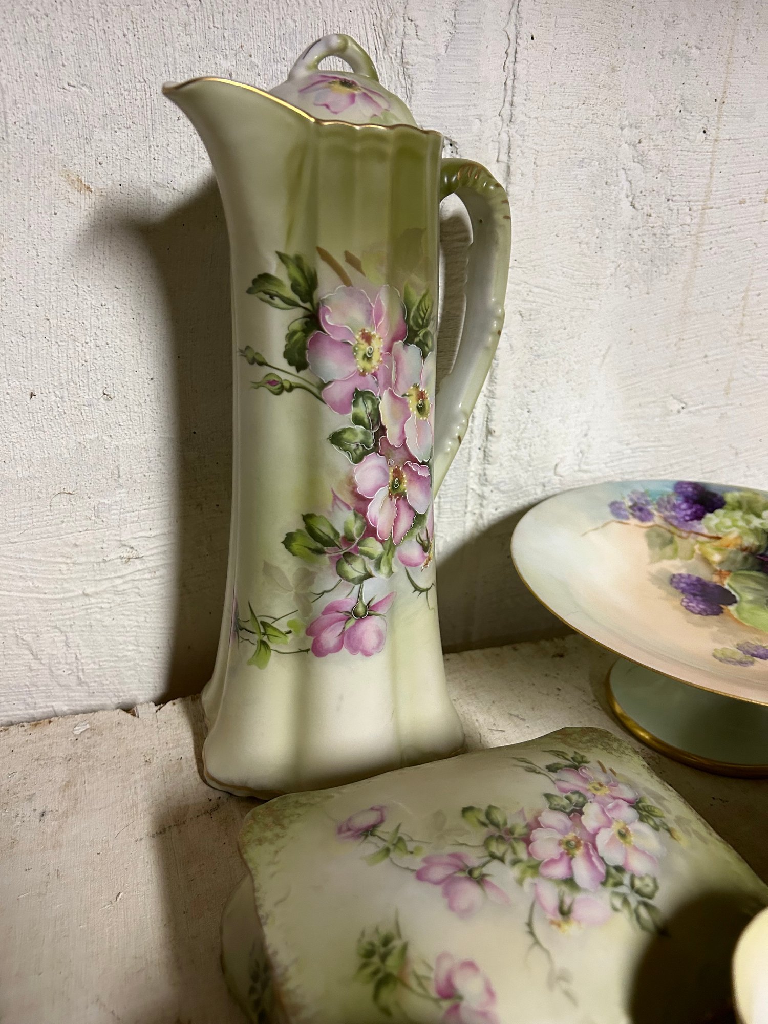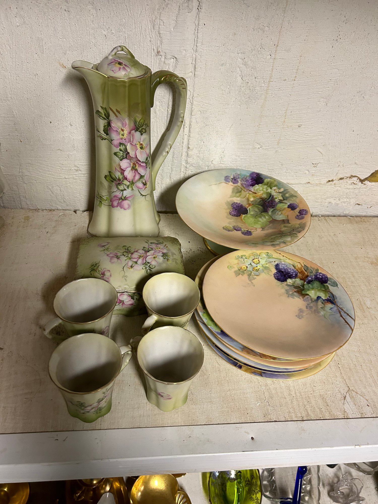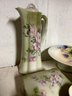 Shelf lot of Nippon and Limoges. Six pieces of Limoges including chocolate pot, 4 cups, covered box. Seven pieces Nippon, including six matching plates with matching footed comport chocolate pot 11 inches tall.