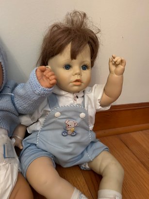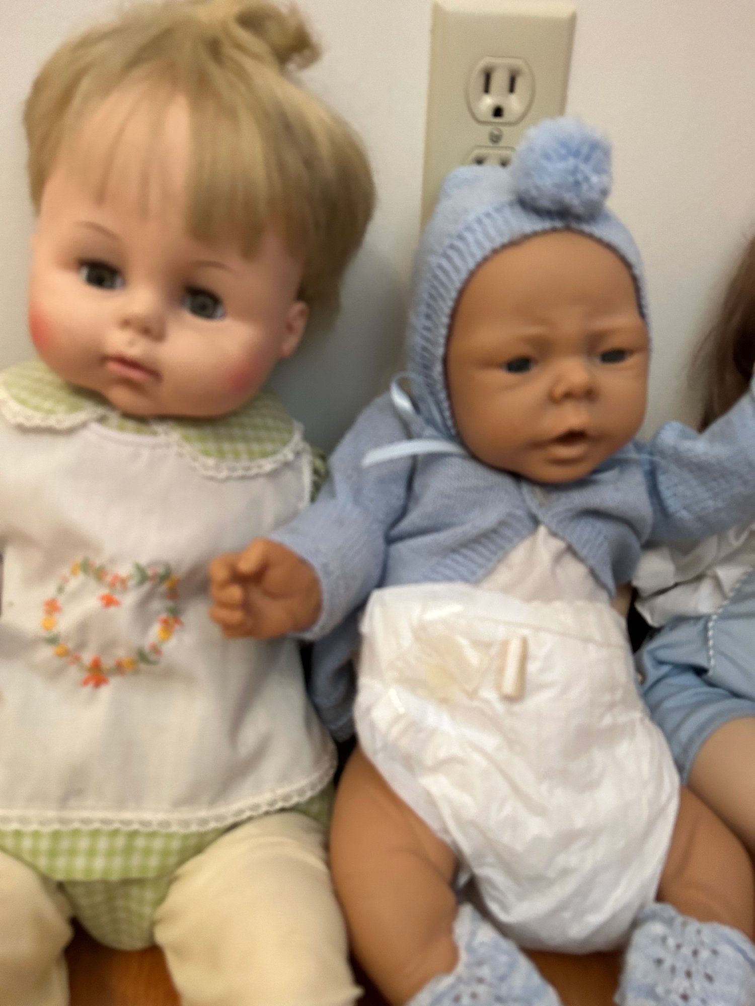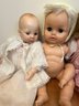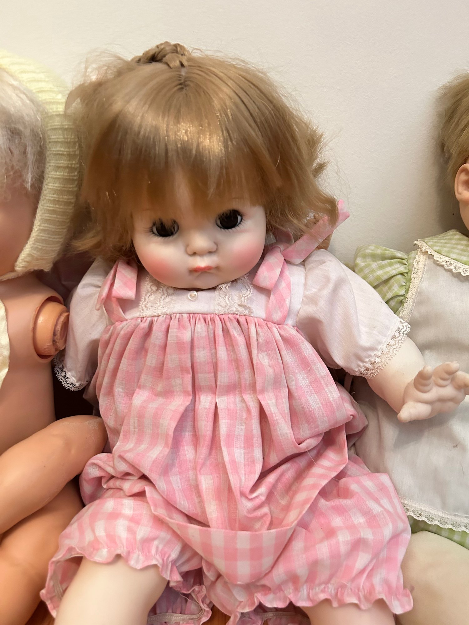 Six baby dolls, most with open shut eyes, one with arm separated. Tallest one 21 inches.