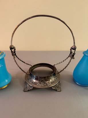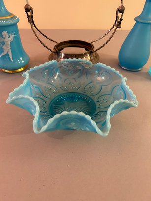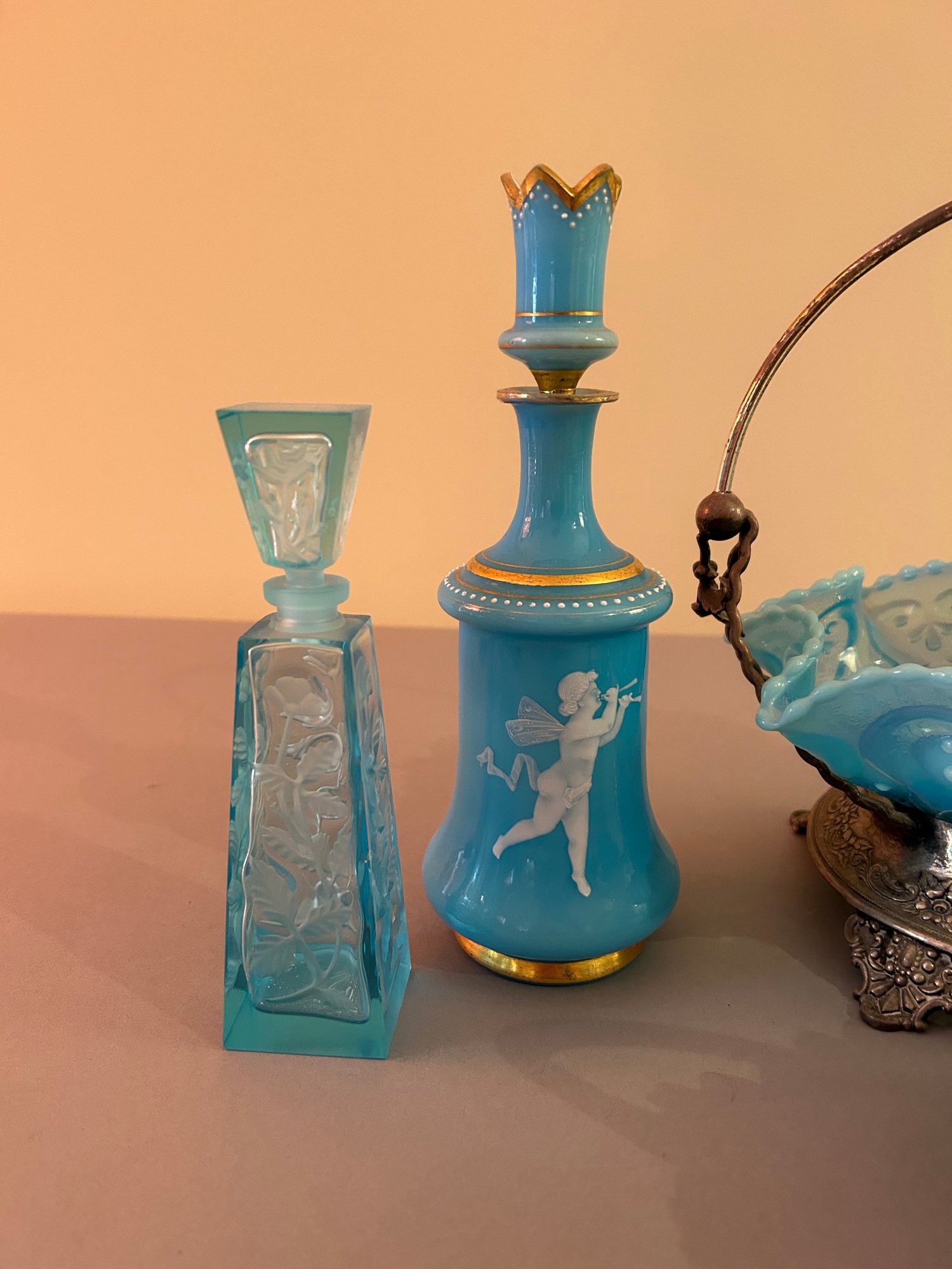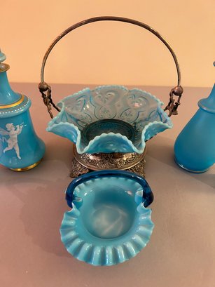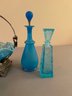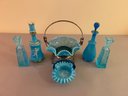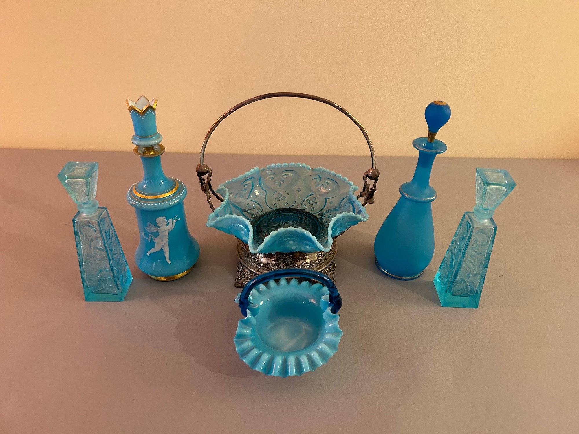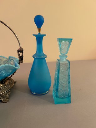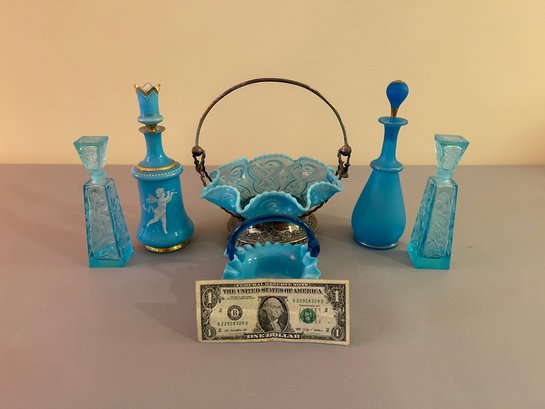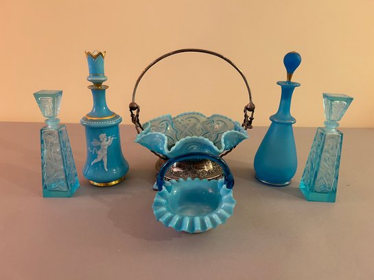 Six Piece Of Blue Glass Including Decanters And Baskets. Tallest piece 9.5 inches
