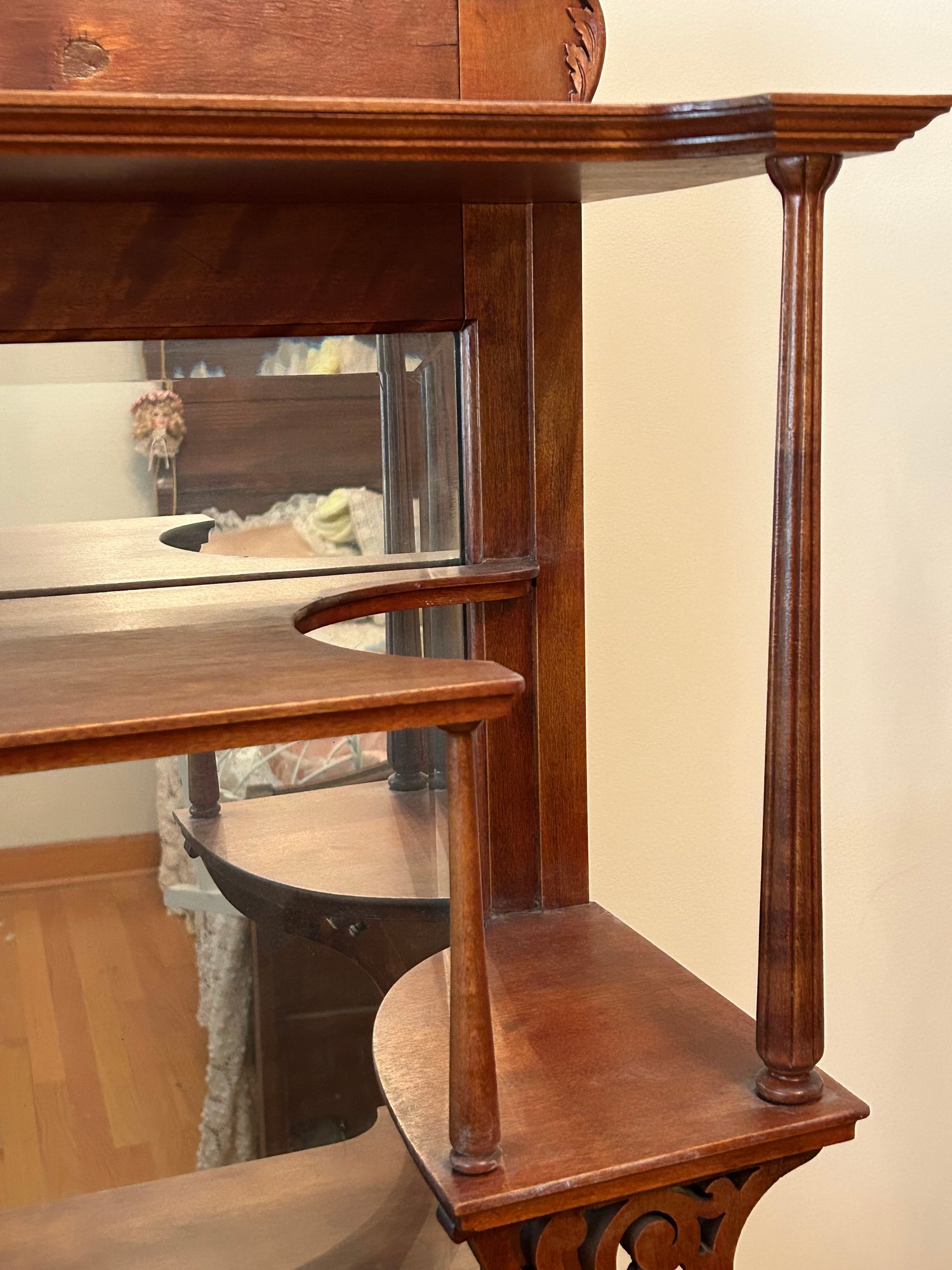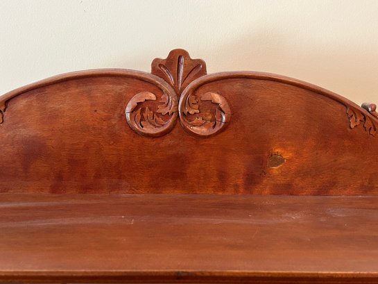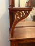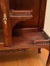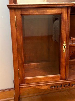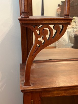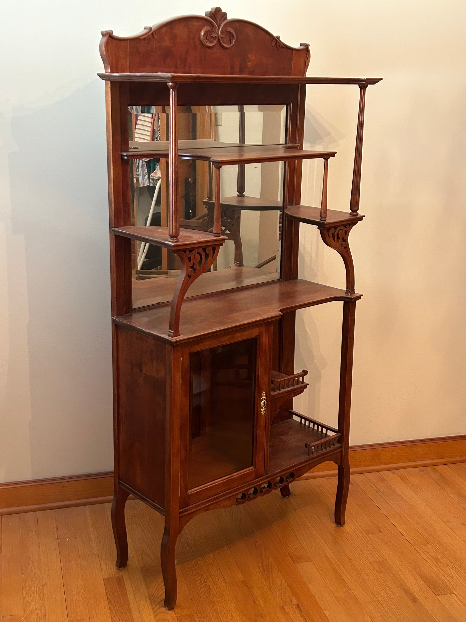 Arts and craft era etagere. Small size with carved details, beveled glass door, beveled glass mirror. 29 1/2 x 11 1/2 x 63“.