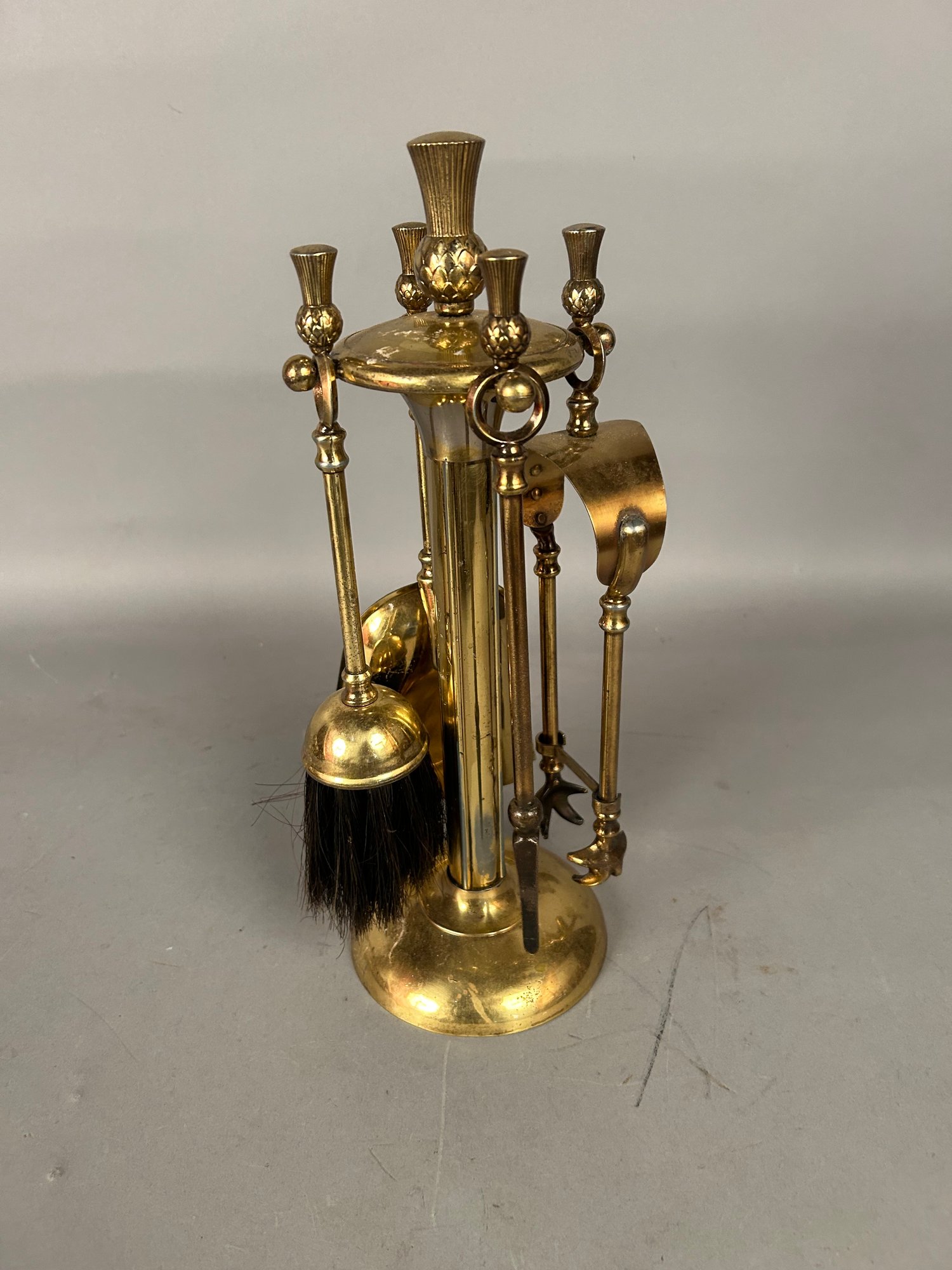 Small vintage fireplace tool set. Four piece with rack. Brass